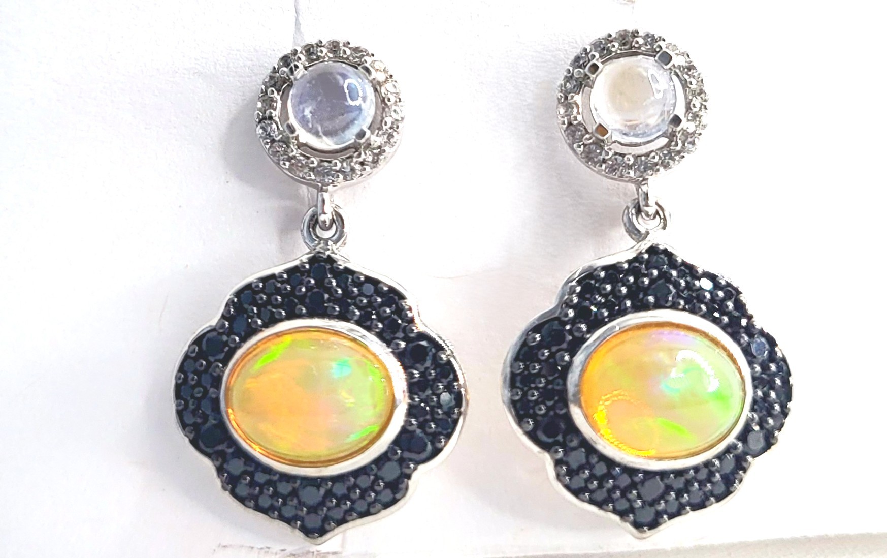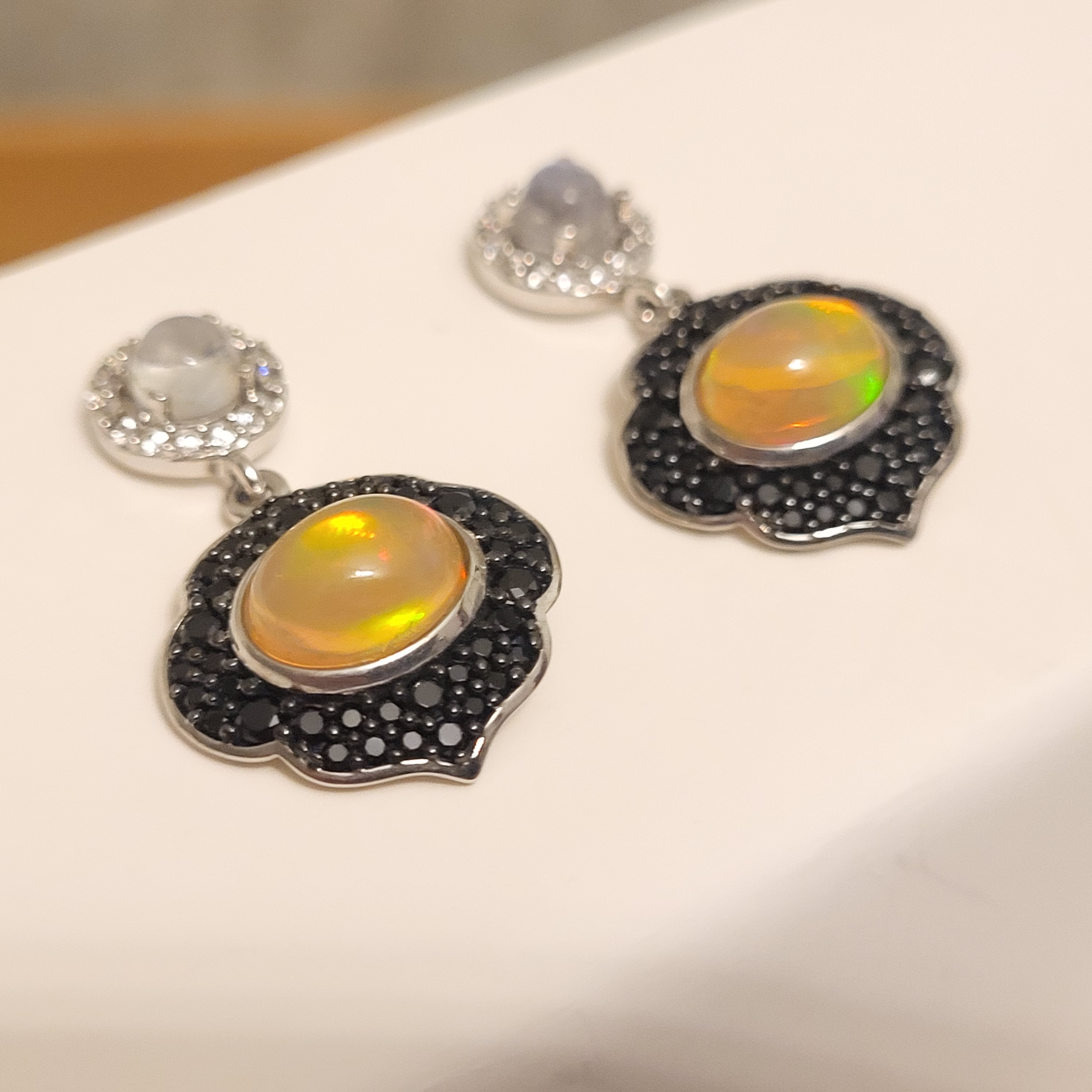 #EthiopianOpal #MoonstoneMagic #BlackSpinelDrama #ZirconGlow #DangleEarrings #GemstoneContrast #AuctionJewels #BidFairFinds #OpalFire #CelestialStyle #JewelryWithEdge #SuspenseInSilver #Auction13