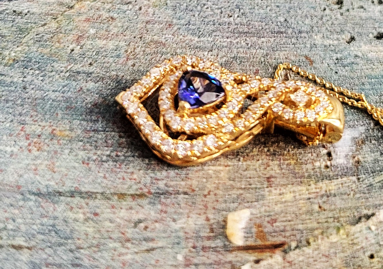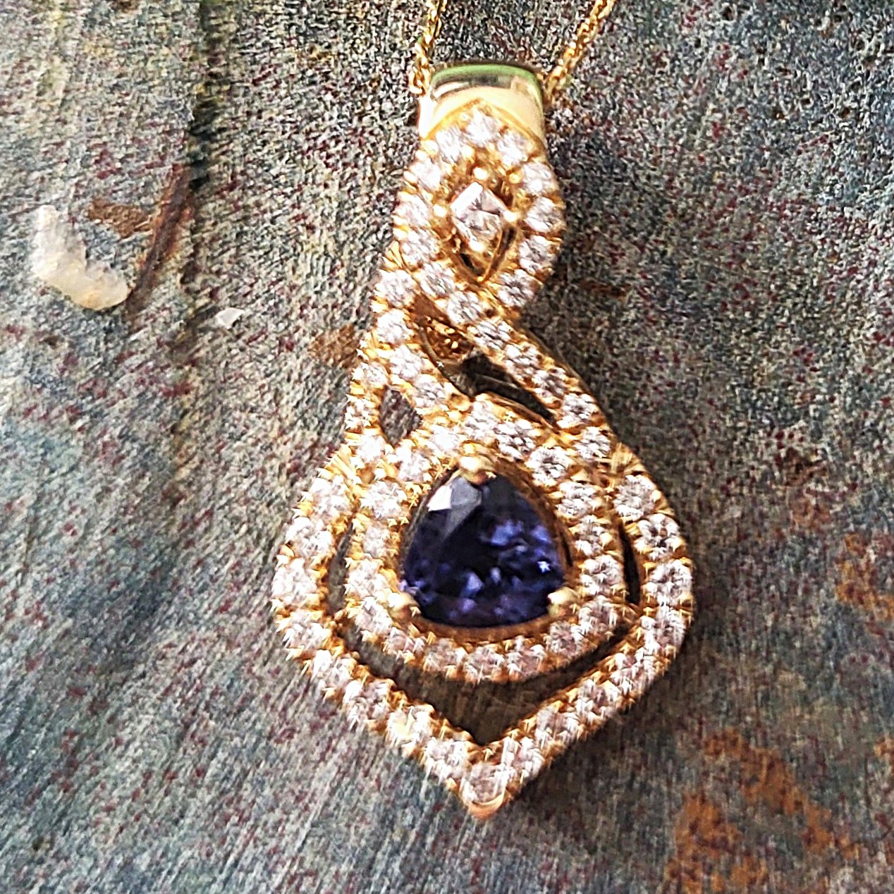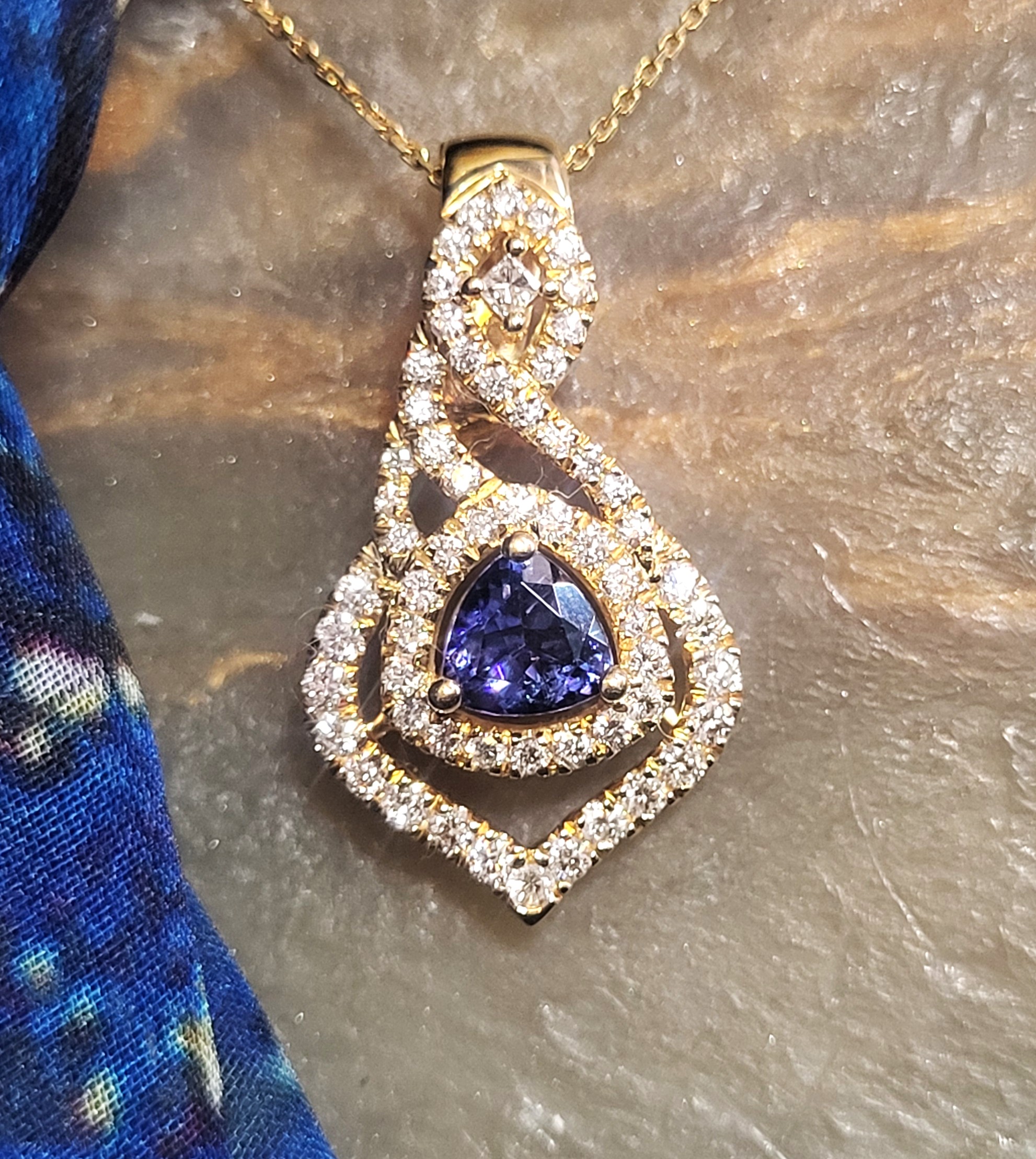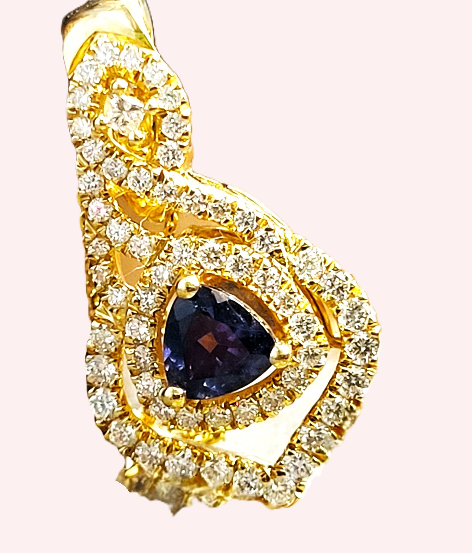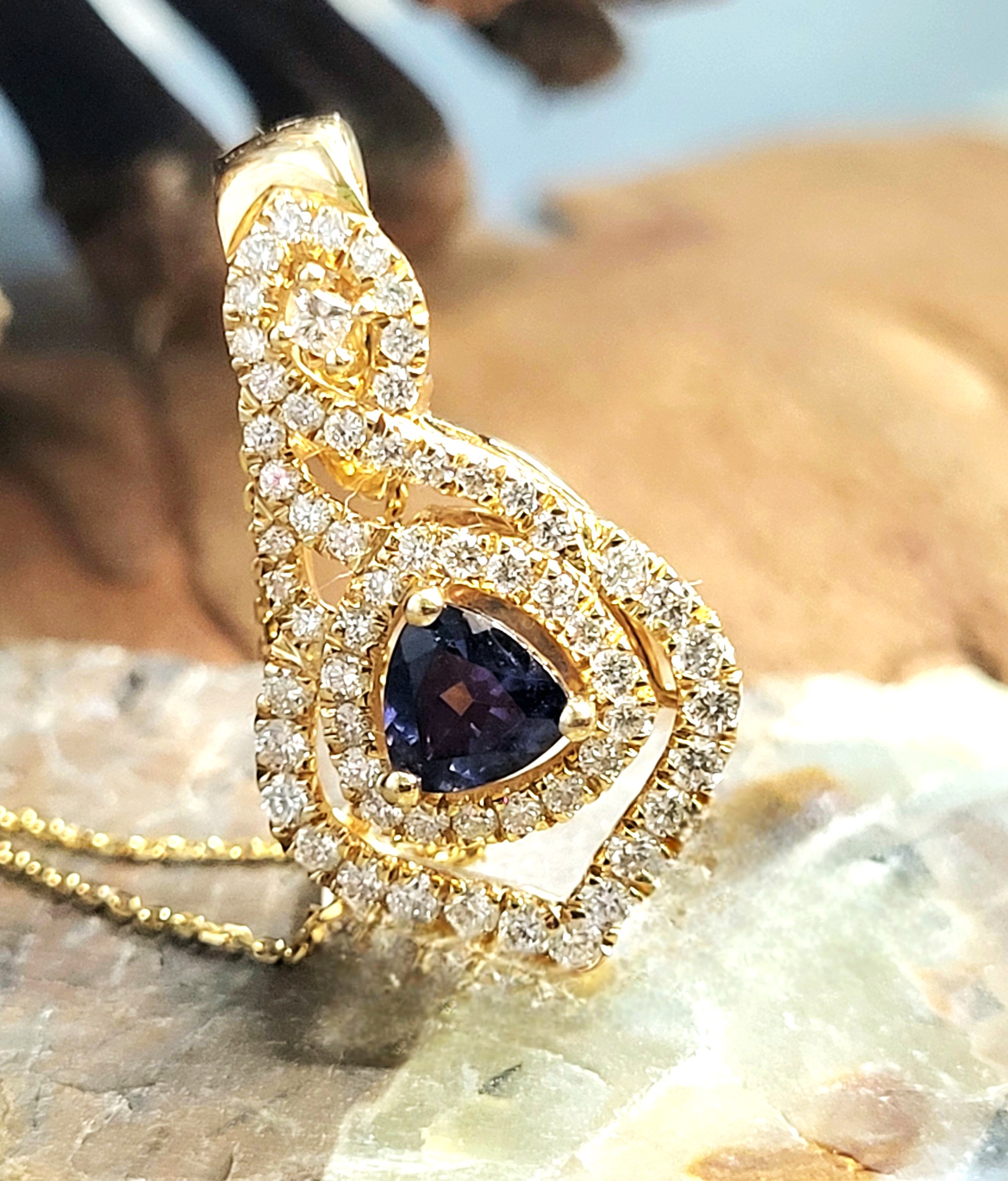 A RARE trilliant-cut benitoite (0.42 CT) blazes from the center of this ornate 18K yellow gold pendant, framed by a swirl of 0.41 CTW ideal-cut diamonds. The design is both architectural and ethereal—each diamond precisely placed to echo the gemstone’s celestial fire. Suspended from an 18″ fine rolo link chain, this piece is a tribute to rarity, craftsmanship, and California’s most elusive treasure. See the bottom of this listing for other important information.