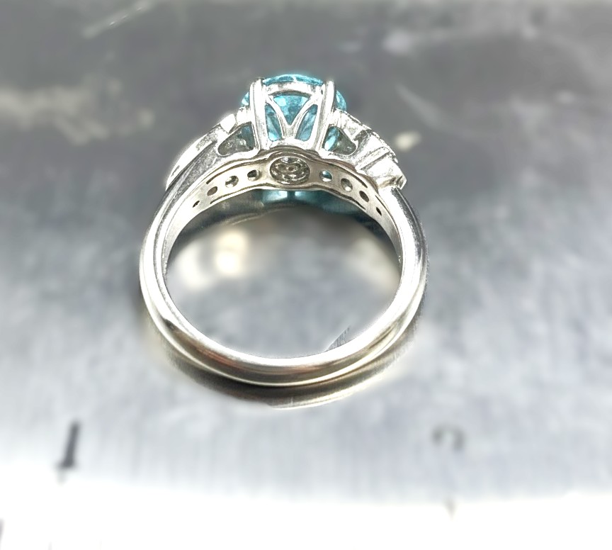 A vibrant treasure in 18K white gold, size 6.75, weighing 5.87 grams. The centerpiece is a 4.78 ct round, faceted natural blue zircon, radiating exceptional brilliance and fire. Accenting the gem are .12 ctw of round brilliant-cut diamonds (G color, SI1 clarity), set along the swirled shoulders for a graceful touch of sparkle. Claw prongs secure the zircon, while the firm under gallery ensures both comfort and durability. A rare gemstone paired with refined craftsmanship, perfect for collectors of distinctive elegance. See sizing details and other information below. AdminCode: 6282/1 -bgrr