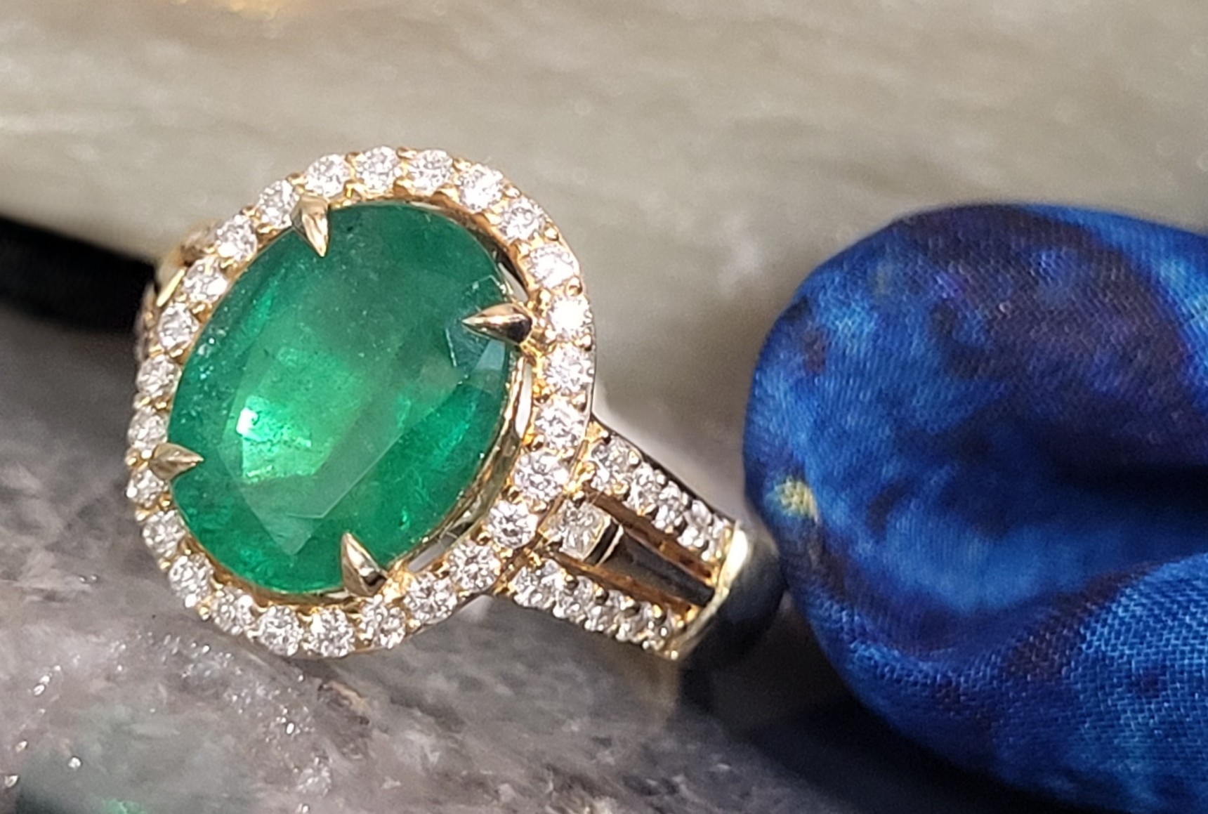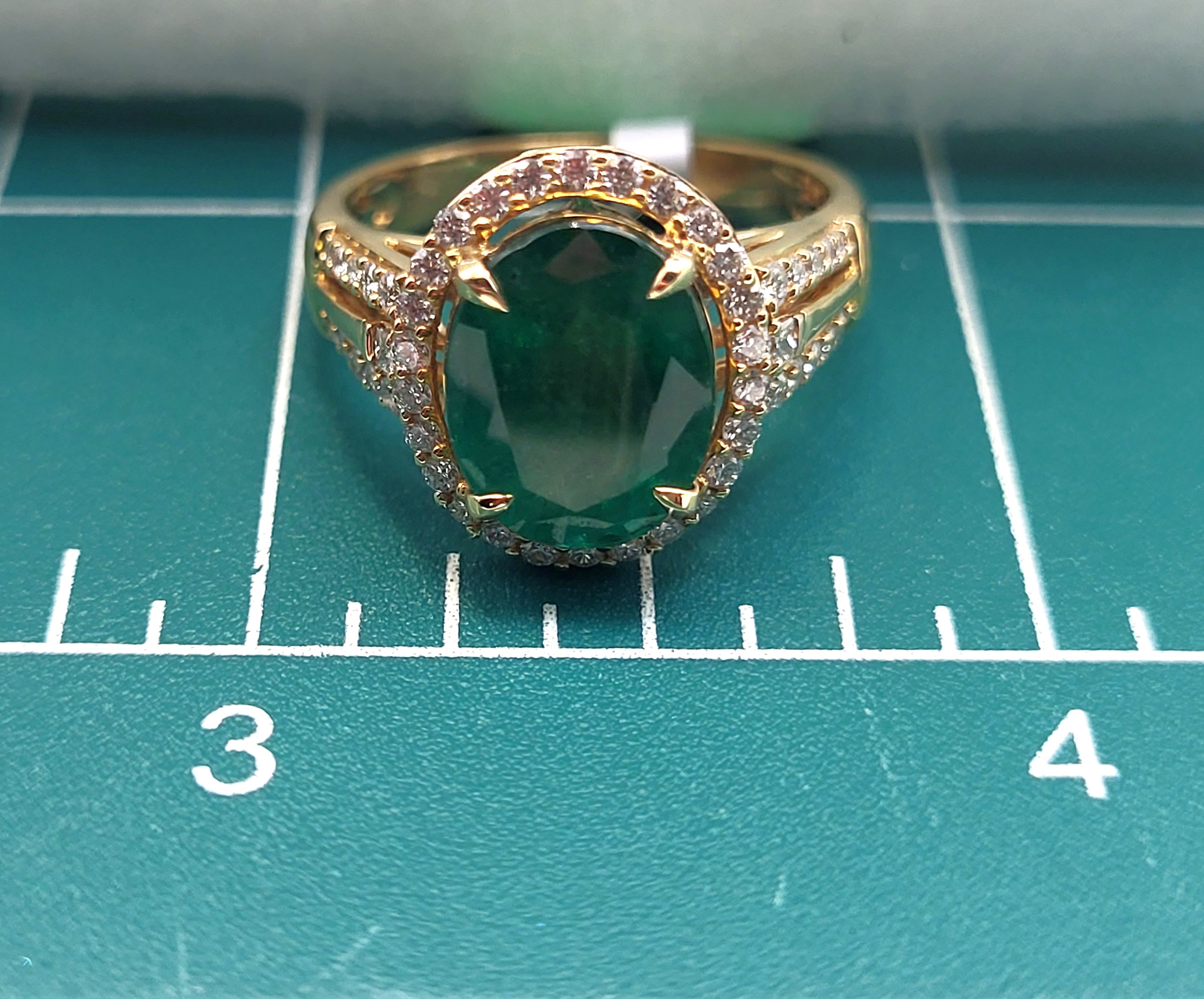 A regal masterpiece in 18K yellow gold, size 7, weighing 5.75 grams. The centerpiece is a vivid 3.7 ct oval-cut emerald, held in claw prongs and framed by a halo of .47 ctw round brilliant-cut diamonds (G color, SI1 clarity). Diamonds continue along the sculpted shoulders, adding brilliance and balance to the design. The supportive under gallery ensures comfort and durability, while the rich green hue of the emerald evokes timeless elegance. A crown jewel for collectors of refined taste. See sizing details and other information below. AdminCode: 6282/22