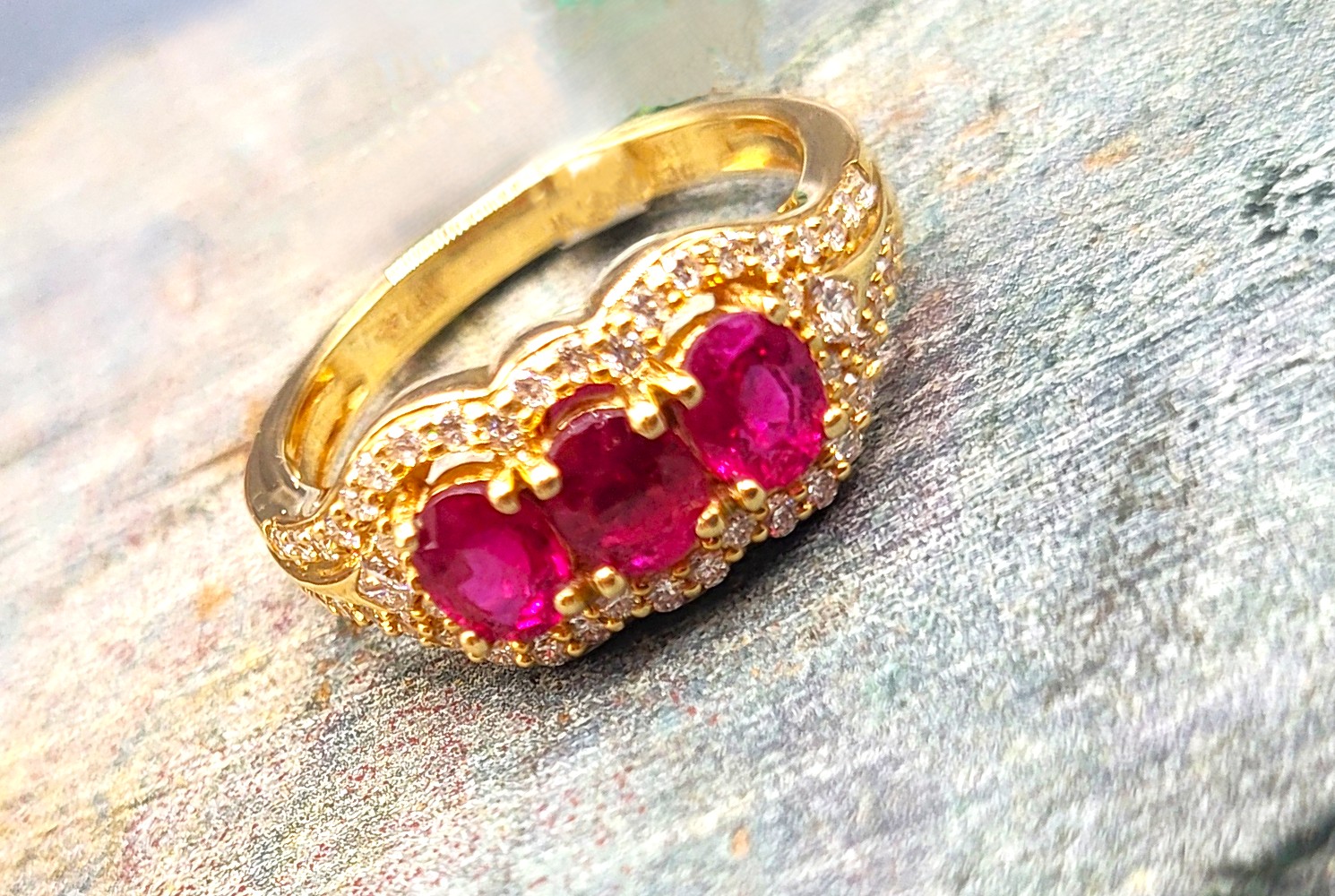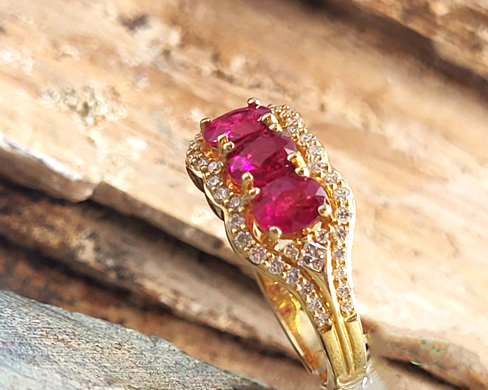 Three gem-quality oval rubies (1.43 CTW) blaze across this 18K yellow gold band, each securely mounted with individual prongs—no sharing, no compromise. Their rich magenta hue is the result of standard heat treatment only, preserving their natural integrity. Surrounding the rubies are ideal-cut round diamonds (SI1 clarity, G color), totaling 0.36 CTW, with two princess-cut accents on each shoulder for added brilliance. The under gallery is supportive and elegant, ensuring comfort and stability. This ring is a masterclass in balance—bold yet refined, radiant yet restrained.