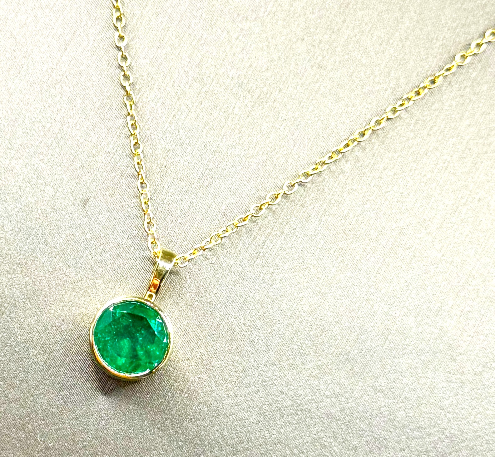 A rare breath of green from the heart of Colombia. This 2.00 ct round, faceted emerald—certified from the legendary Muzo mine—glows with vivid intensity and timeless mystique. Bezel-set in solid 14K yellow gold, the pendant features an open back to invite light through its crystalline depths. Suspended from an 18" lightweight link chain with a lobster clasp, the design is both delicate and enduring. The bail accommodates up to a 4mm chain, offering versatility without compromising elegance. See sizing details and other information below. 3 grams AdminCode: CKP5/grrr