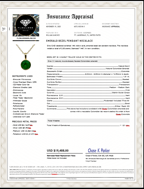Setting: 14K Yellow Gold Primary Gemstone: Genuine Emerald Geographic Origin: Colombia, South America Mine Information: Muzo, Colombia Link Stye/Length: Extra-Fine Link/18" Closure: Lobster Clasp Certificate of Appraisal: Prepared by Flawless Gem Lab (11/2025)