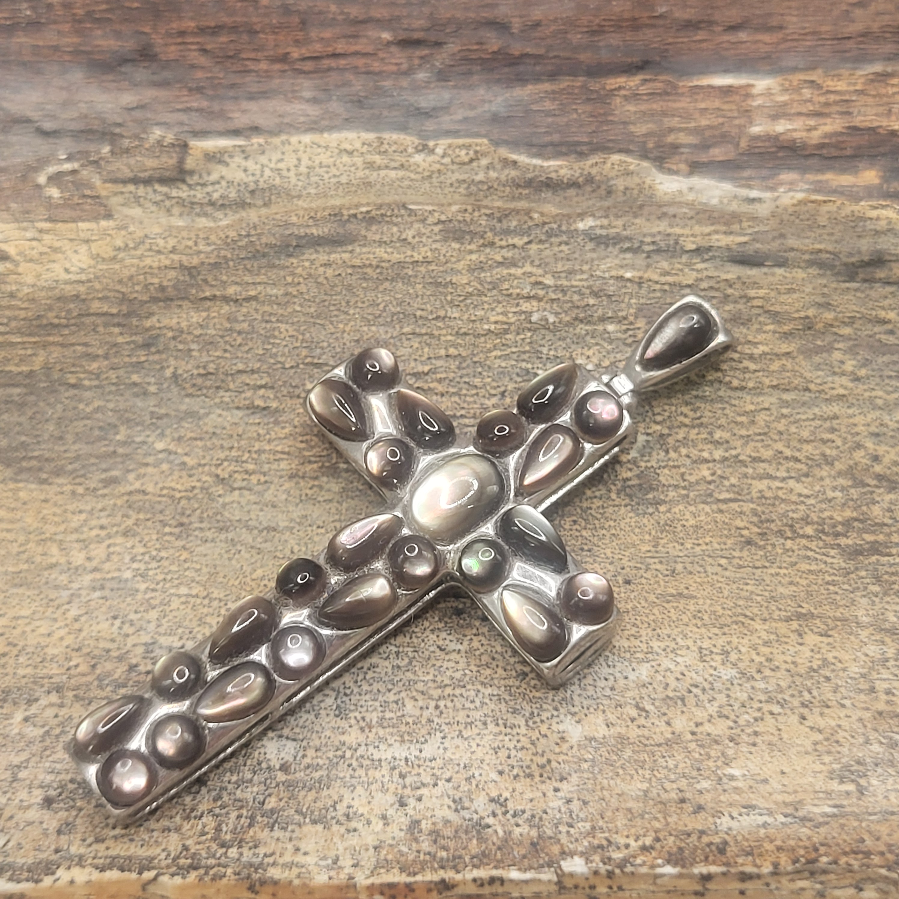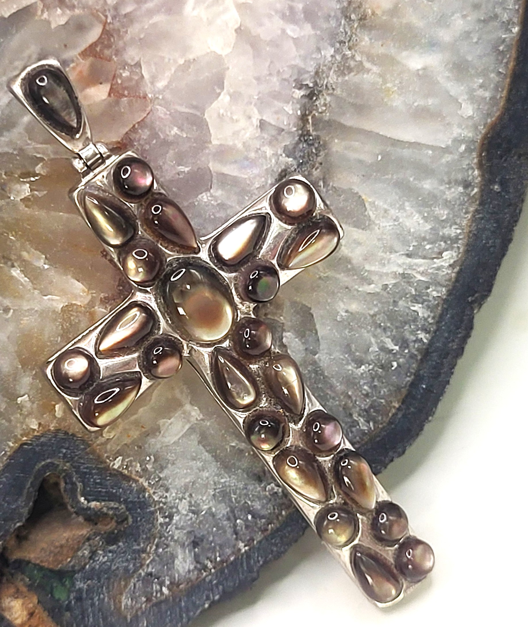 Setting: Sterling Silver .925 Primary Gemstone: Abalone Shell Dimensions: 2″ x 1″ This sterlng silver pendant is quite stunning with polished cabachon abalone shells encrusting the front of the cross in a cobblestone look, whle the back of the cross is equallly beautiful with a reticulated, ornate back gallery. The bail is decorated with a cut-out heart on the back and a pear-shaped abalone cabochon on the frong. The bail is attached to the cross with a hinge, so it folds forward and backward and can accommodate an approximate 3mm wide chain. It weighs 6.56 grams. AdminCode: KBJS/bg 1. This item is brand new and offered for sale at auction by a manufacturer or individual consignor. The item is in new condition with only the slight possibility of evidence of storage or handling for sale preparation. 2. All weights, sizes, measurements, as well as the color or clarity of any gemstones or diamonds mentioned in the titles, descriptions, introductions, notes or anywhere in the auction catalog shall be considered “approximate” regardless of the inclusion of the word “approximate” or any similar adjective. 3. Props used to aid in photography are NOT included in any lot, unless specified in the title and/or description.