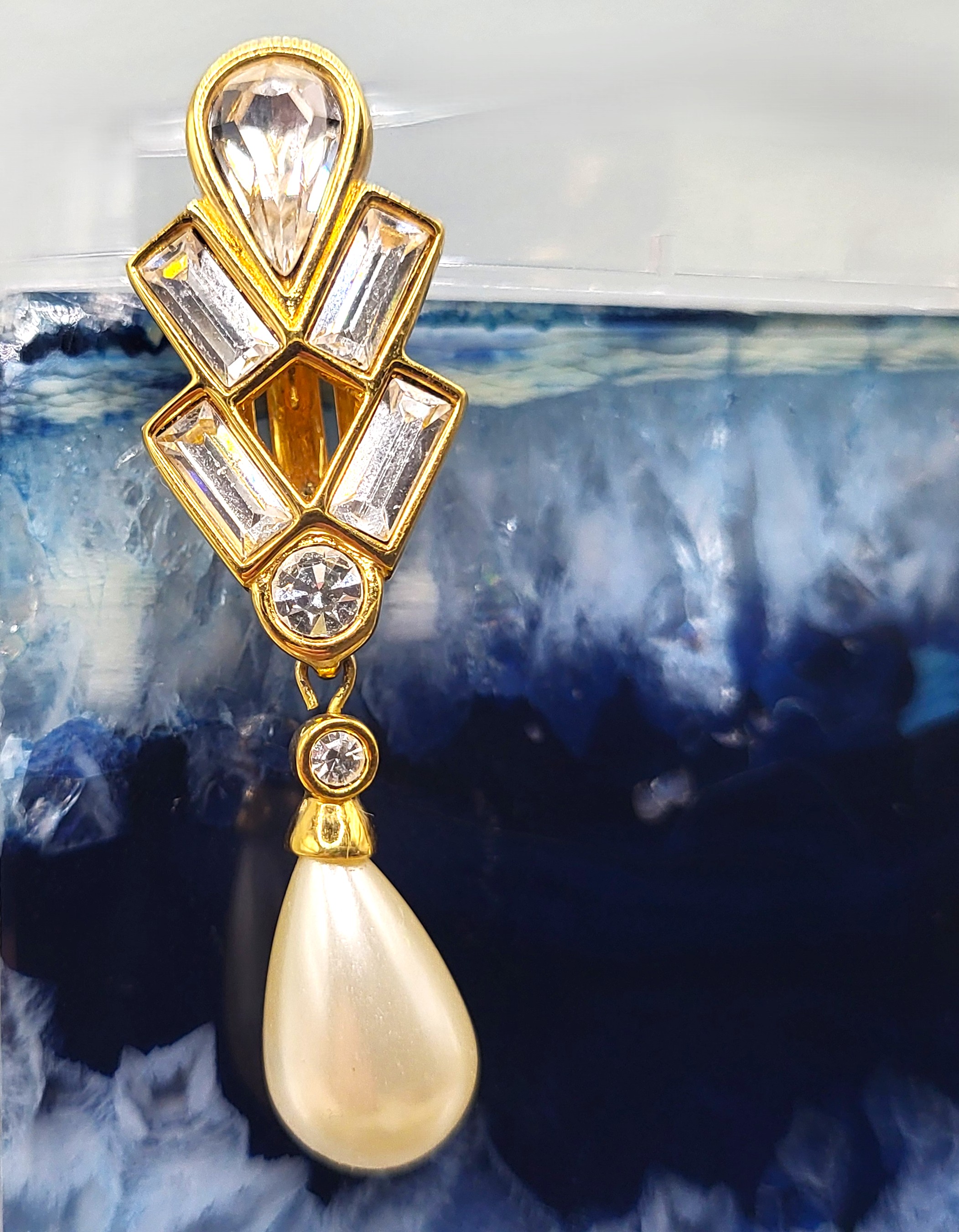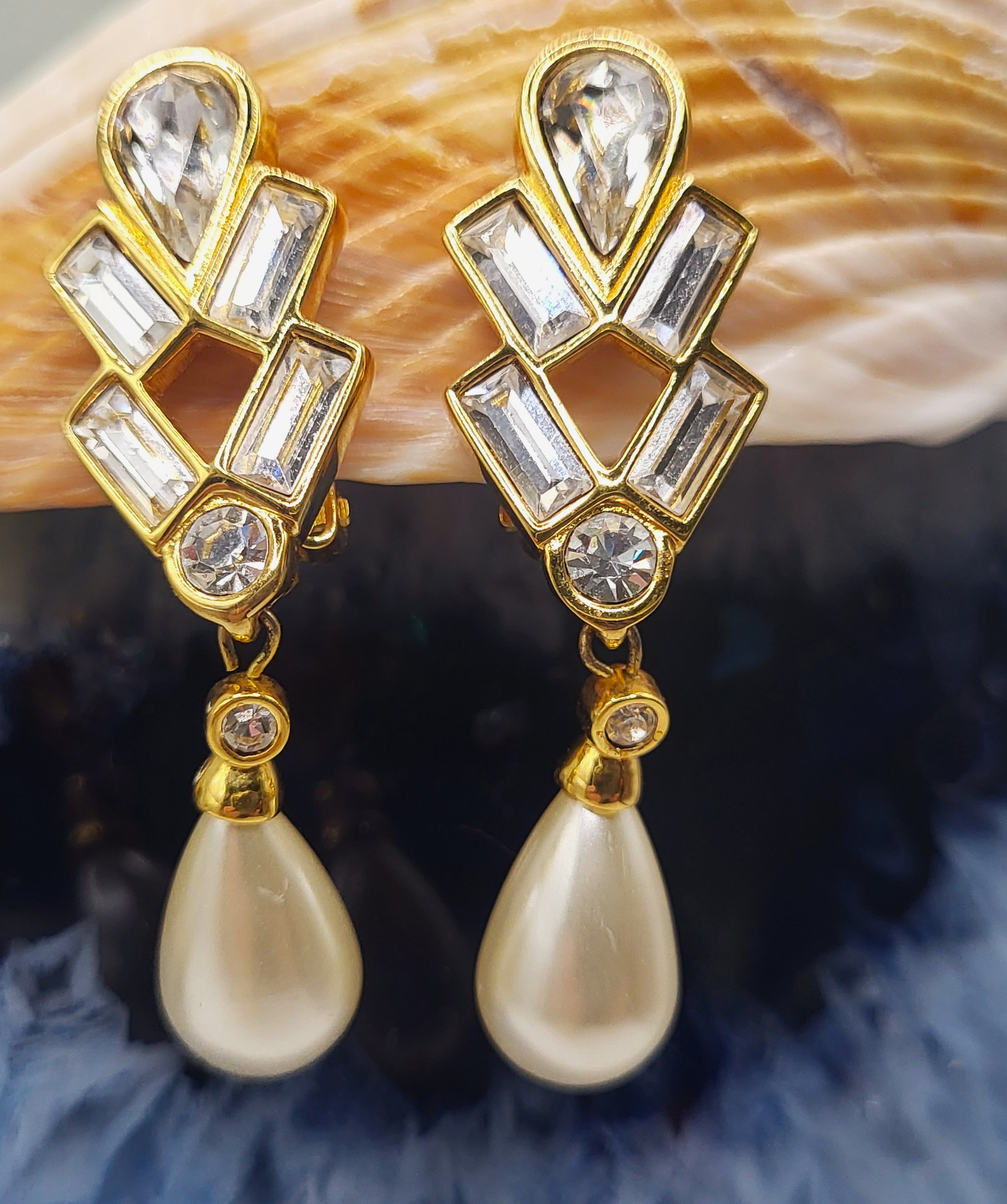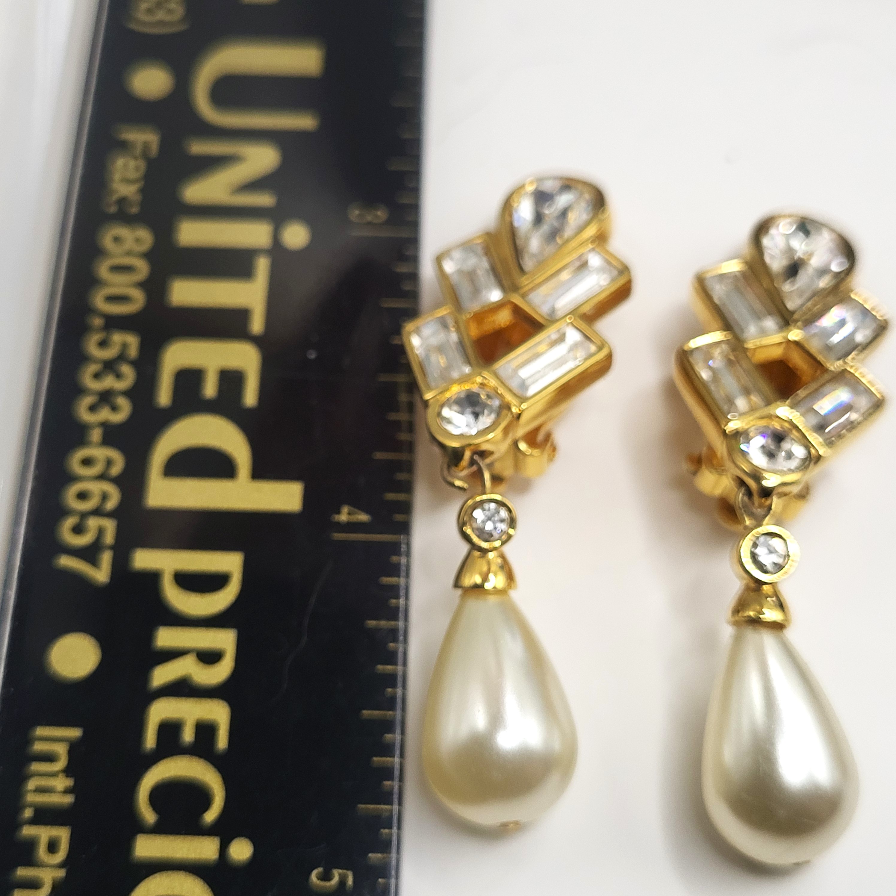 This is a pair of vintage Swarovski (c) chunky gold-tone earrings with dangling faux baroque pearls. The earrings feature emerald-cut, clear Swarovsky crystals and they hang 2". The earrings attach to the earlobes with spring-loaded clips. They can be worn on unpierced ears. The earrings appear like new, however there is no original box. AdminCode: AZ6/ir