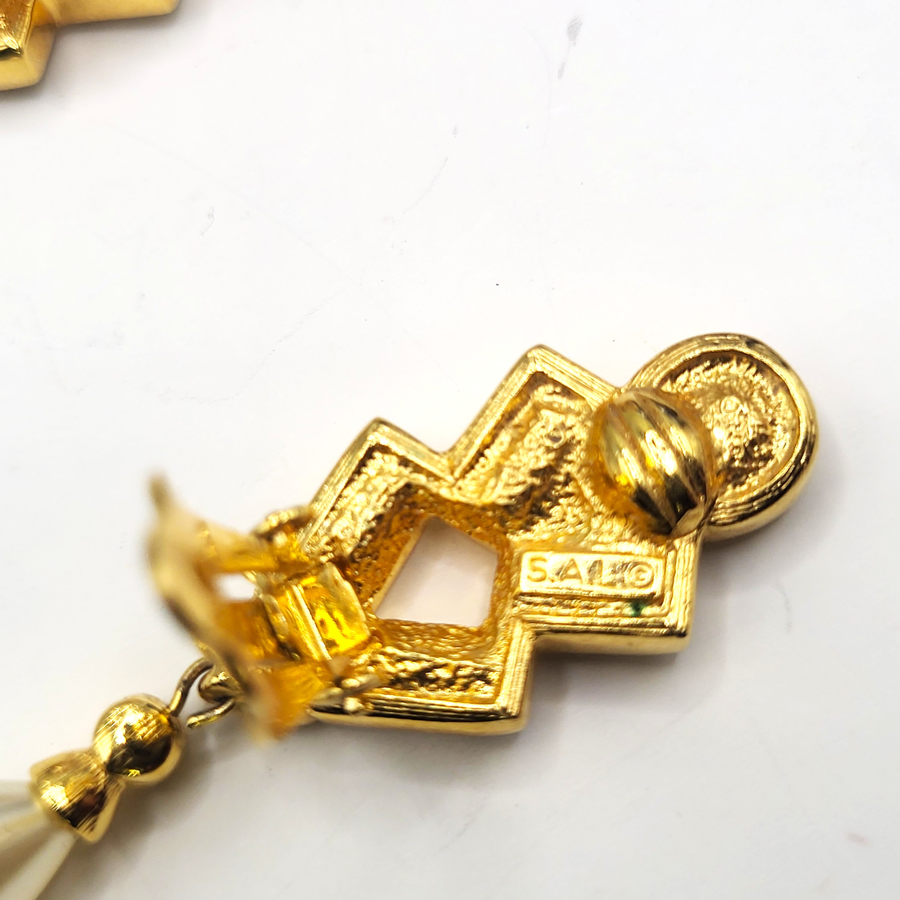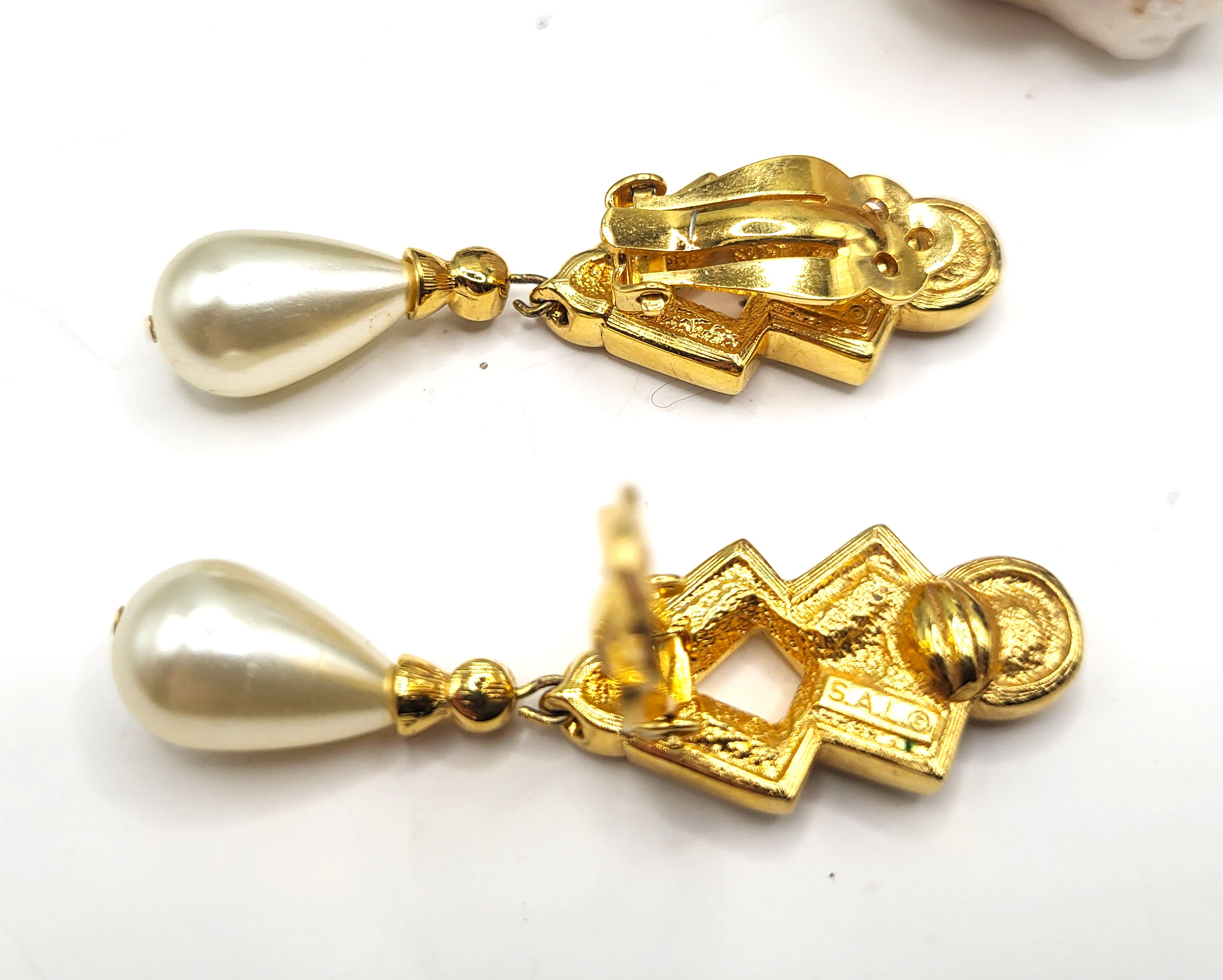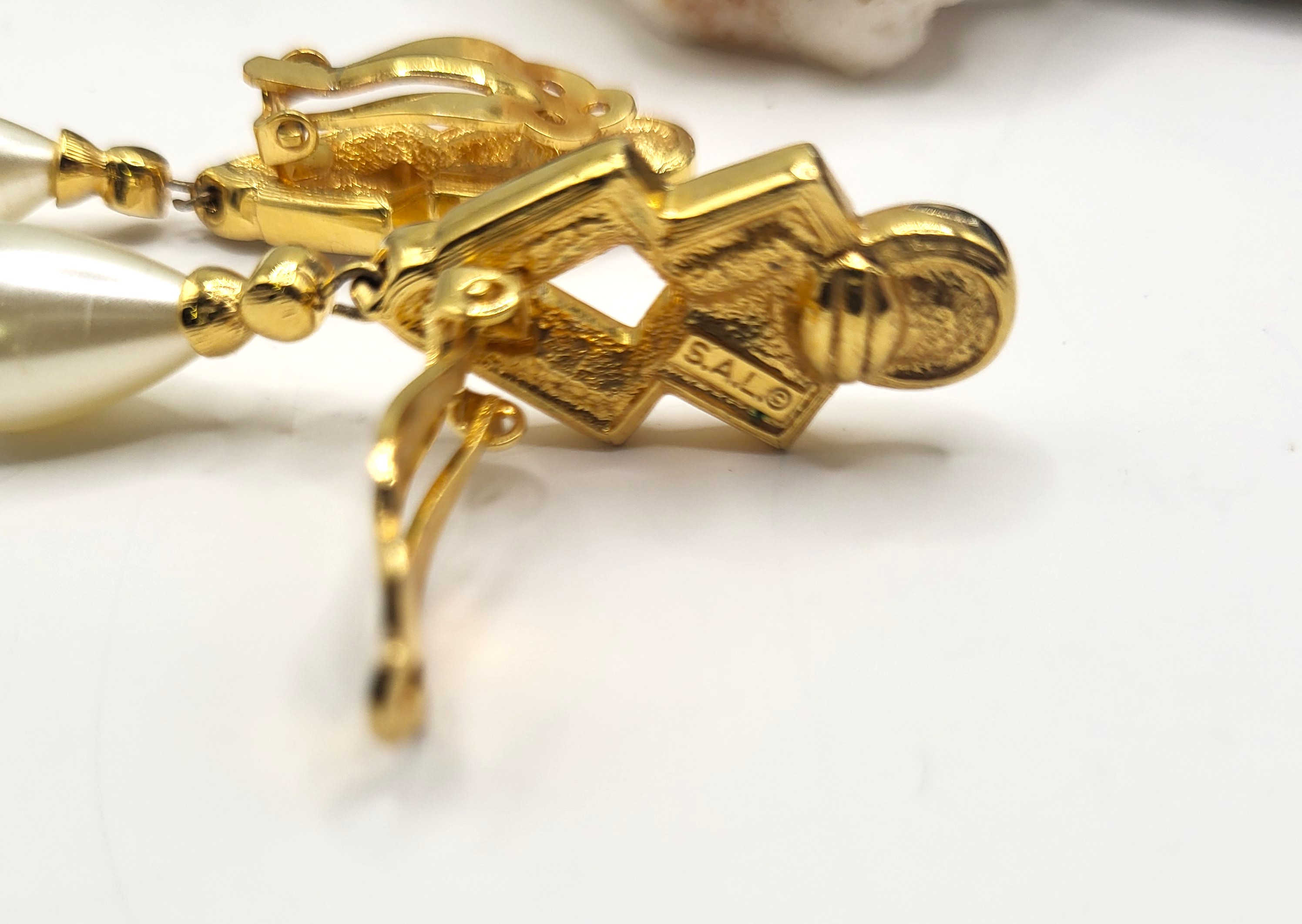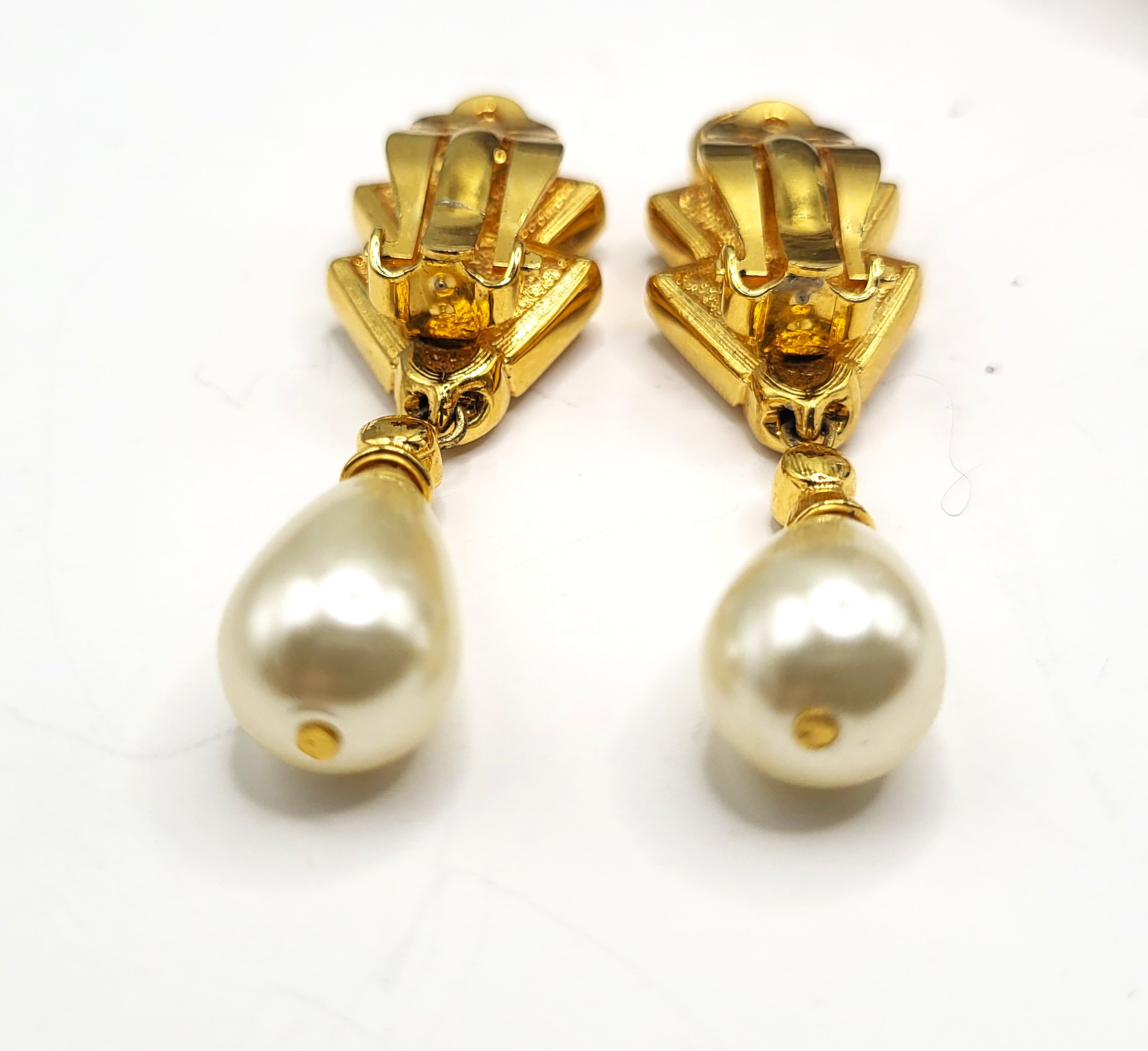 This is a pair of vintage Swarovski (c) chunky gold-tone earrings with dangling faux baroque pearls. The earrings feature emerald-cut, clear Swarovsky crystals and they hang 2". The earrings attach to the earlobes with spring-loaded clips. They can be worn on unpierced ears. The earrings appear like new, however there is no original box. AdminCode: AZ6/ir