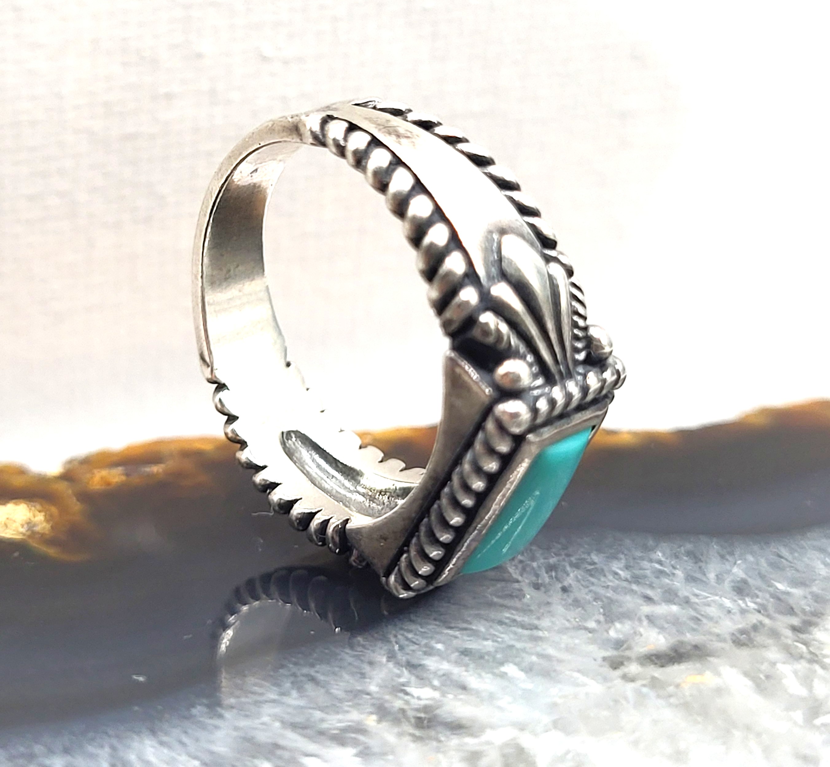 This sterling silver ring design precedes the ‘stacker’ style ring by decades, but it is so simply sophisticated and modern, it may just as well be called a stacker ring. Cast in sterling silver and set with an approximate 8mm x 3mm elongated cabochon of genuine* turquoise, the ring is subtly decorated with iconic Southwestern designs. Abraided borders accentuates the turquoise and the smooth tapered shank has epaulette shoulders and twisted rope borders. The ring is US size 8. The under gallery bears the Caroly Pollock-Relios hallmark and sterling silver mark. AdminCode: 33120/16.i