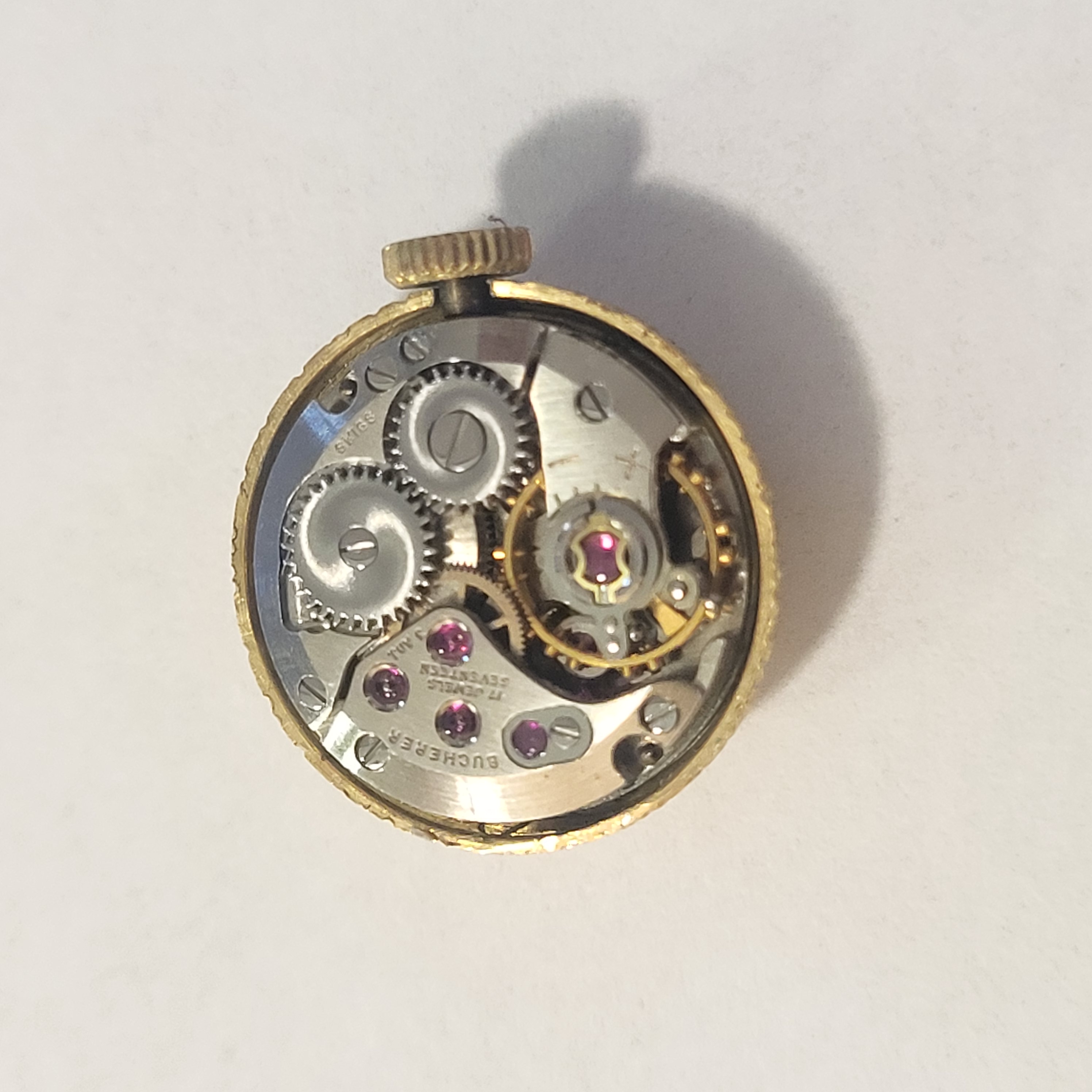 This is a wonderful example of mid-century class and style. A dainty gold-colored bracelet styled for the 1940’s and 1950’s, holds a smalll, round, wristwatch that is only 15mm in size plus the crown. The button-shaped case has a diamond-cut finish that contrasts with the smooth silver dial, where batons mark the hours. The slightly bubbled, plastic crystal is in excellent condition. The case, back, crown, kugs and dial test as 18 karat gold. The back is stamped with an identifying number. The watch runs when wound, but needs a service. AdminCode: AZM 1. This is an estate item that is in very good condition. The clasp works well, there are no scratches on the crystal, the bracelet (band or strap) is not damaged and only shows age related wear, if any. The watch runs when wound, although may be losing time and needs to be serviced. 2. All weights, sizes, measurements, as well as the color or clarity of any gemstones or diamonds mentioned in the titles, descriptions, introductions, notes or anywhere in the auction catalog shall be considered "approximate" regardless of the inclusion of the word "approximate" or any similar adjective. 3. Props used to aid in photography are NOT included in any lot, unless specified in the title and/or description. See sizing details and other information below.