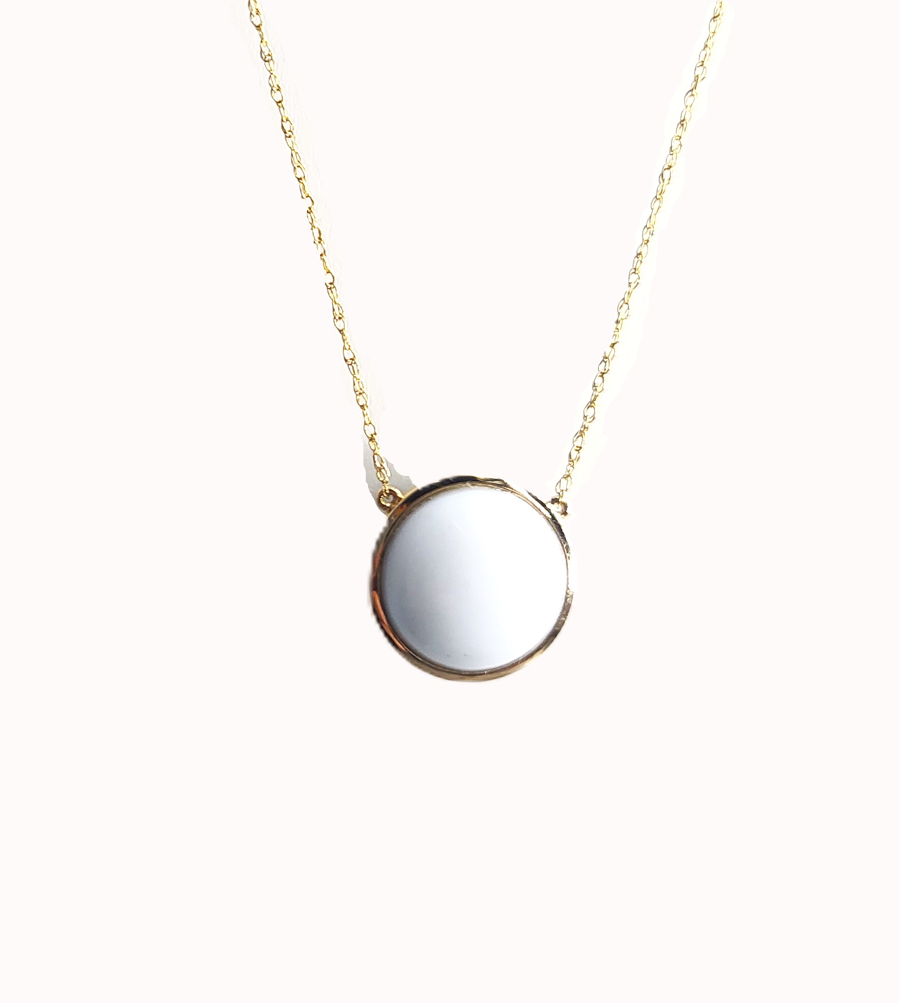 Setting: 18K Yellow Gold Primary Gemstone: Genuine Malachite Secondary Gemstone: Genuine White Opal Link Stye: Fine Cable Link Closure: Spring Ring Length: 18″ Adjustable A stylish study in contrast and versatility, this 18″ fine rope chain necklace features a reversible pendant showcasing half-round cabochons of lush green malachite and luminous white opal. Each stone is set in a wide bezel, offering a bold yet refined silhouette. The pendant remains stationary on the chain—9″ on each side—creating a balanced, symmetrical drape. Finished with a classic spring ring clasp. Total weight: 4.2g. Admin Code: 6282/36.nrr 1. This item is brand new and offered for sale at auction by a manufacturer or individual consignor. The item is in new condition with only the slight possibility of evidence of storage or handling for sale preparation. 2. All weights, sizes, measurements, as well as the color or clarity of any gemstones or diamonds mentioned in the titles, descriptions, introductions, notes or anywhere in the auction catalog shall be considered “approximate” regardless of the inclusion of the word “approximate” or any similar adjective. 3. Props used to aid in photography are NOT included in any lot, unless specified in the title and/or description. – #MalachiteNecklace – #WhiteOpalJewelry – #ReversiblePendant – #GoldJewelryDesign – #EstateJewelryAuction – #LuxuryNecklace – #GemstoneStyle – #BidFairAuction – #JewelryCollectors – #OpalAndMalachite – #FineJewelryFinds – #AuctionJewels – #StatementNecklace – #VintageJewelryLovers – #JewelryWithStory