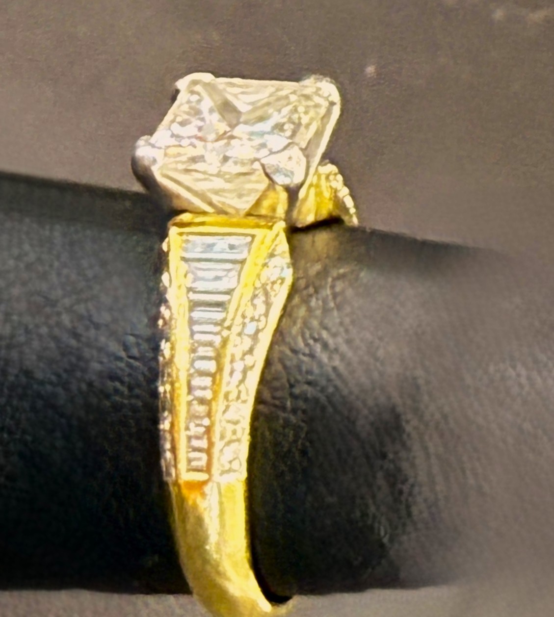 Setting: 18K Yellow Gold Primary Gemstone: Genuine, Natural Diamond, Princess-Cut Secondary Gemstone: Genuine, Natural Diamond, Mixed Cuts Size: US 6.5 Geographic Origins: All Earth-Mined Diamonds Certicate of Appraisal prepared by Flawless Gem Lab (11/2025) states appraised value of $14,500.00 A study in symmetry and brilliance. This engagement-style ring features a 2.01 ct princess-cut natural diamond (F color, SI2 clarity) set in polished 18K yellow gold. Flanked by twenty-four round brilliant-cut diamonds (F–G color, VS1–VS2 clarity, .31 ctw), the tapered baguette silhouette evokes timeless devotion and architectural grace. The center stone’s very good cut and inert fluorescence ensure crisp fire and clarity, while the side diamonds shimmer with precision. A ring that speaks in geometry and light. Stamped “750”, size 6.5, total weight 4.87 grams. See sizing options and other important details below. AdminCode: CKP4/grrr 1) This is an estate item in excellent to like new condition with little to no evidence of previous wear. 2) All weights, sizes, measurements, as well as the color or clarity of any gemstones or diamonds mentioned in the titles, descriptions, introductions, notes or anywhere in the auction catalog shall be considered “approximate” regardless of the inclusion of the word “approximate” or any similar adjective. 3) Props used to aid in photography are NOT included in any lot, unless specified in the title and/or description. 4) This ring can be sized for an additional charge. Normally, sizing will delay shipping by 2-5 days. Please contact Bidfair Fine Jewelry for a sizing quote and turnaround time. This ring can be size up 1 to 1.5 sizes and down 1 size with minimal compromises to the ring structure. Please keep this in mind, if size is a factor, when bidding. 5) The Certificate of Appraisal is included with this item. Please send required information to change the “ownership” of the Appraisal, which can be shipped separately from the ring, if preferred. #PrincessCutDiamond #BaguetteBrilliance #EngagementElegance #18KGold #BidfairRare #Auction13 #TimelessDesign #DiamondDesires
