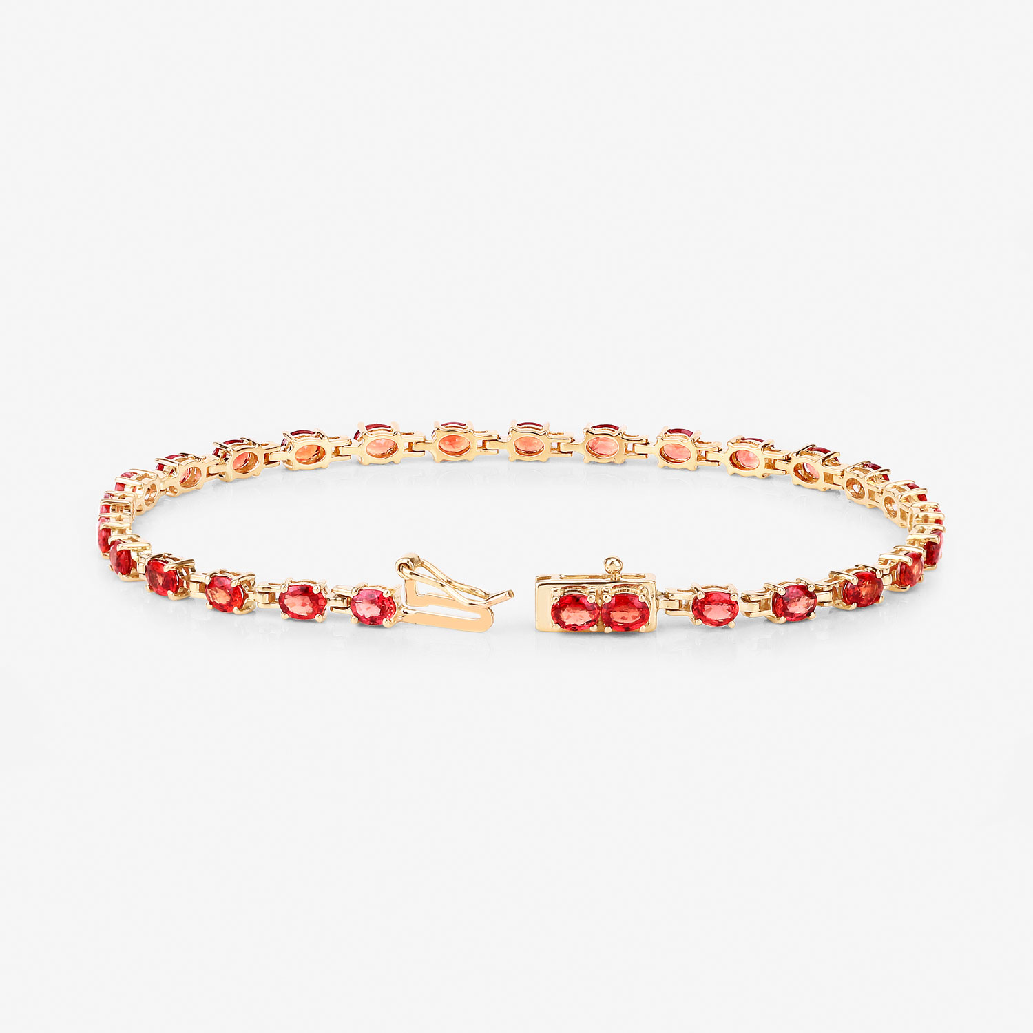 QUALIFIES FOR FREE APPRAISAL OFFER (LIMITED TIME-SEE DETAILS IN AUCTION PREFACE) Setting: 14K Yellow Gold Main Gemstone: Genuine Orange Sapphire Length: 7″ Closure: Hidden Box Clasp with Safety Clip FunFact Matches: This amazing 14 karat yellow gold bracelet features 7.00 carats of intense, reddish-orange, round, faceted, genuine sapphires. The sapphires are prong-set on dedicated links, making for a flexible bracelet that ends with a hidden box clasp with a figure 8 safety clip. Admin: Q5743/33-wwg 1. 1)This item is brand new and offered for sale at auction by a manufacturer or individual consignor. The item is in new condition with only the slight possibility of evidence of storage or handling for sale preparation. 2) All weights, sizes, measurements, as well as the color or clarity of any gemstones or diamonds mentioned in the titles, descriptions, introductions, notes or anywhere in the auction catalog shall be considered “approximate” regardless of the inclusion of the word “approximate” or any similar adjective. 3) The winning bidder may consider getting an appraisal report prepared by an independent* GIA graduate gemologist for a small additional fee. Please contact Bidfair Fine Jewelry for details. 4) Props used to aid in photography are NOT included in any lot, unless specified in the title and/or description.