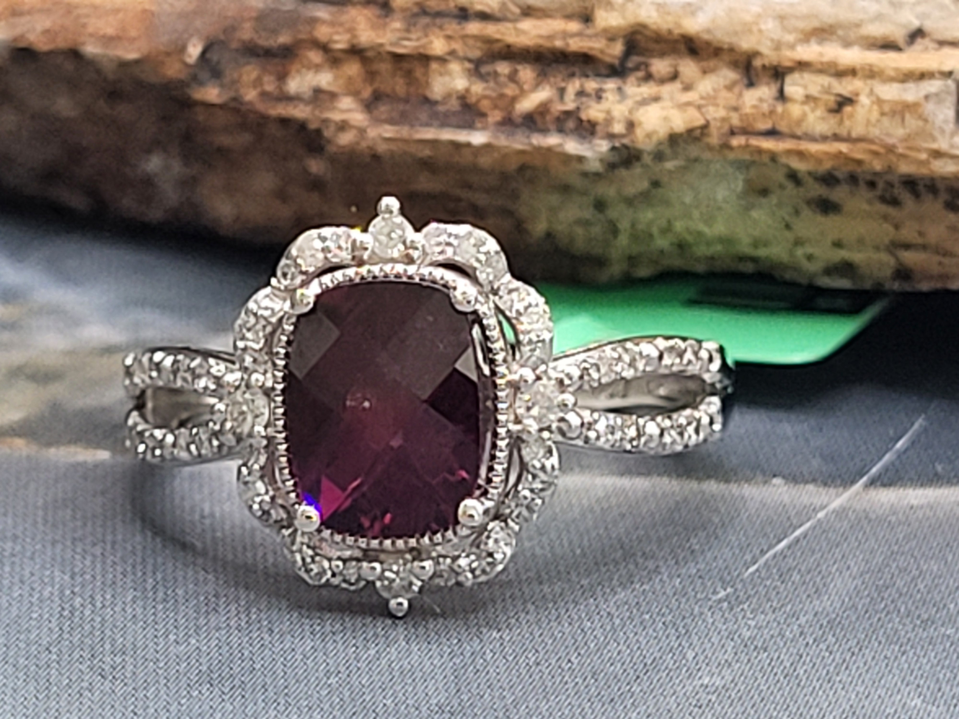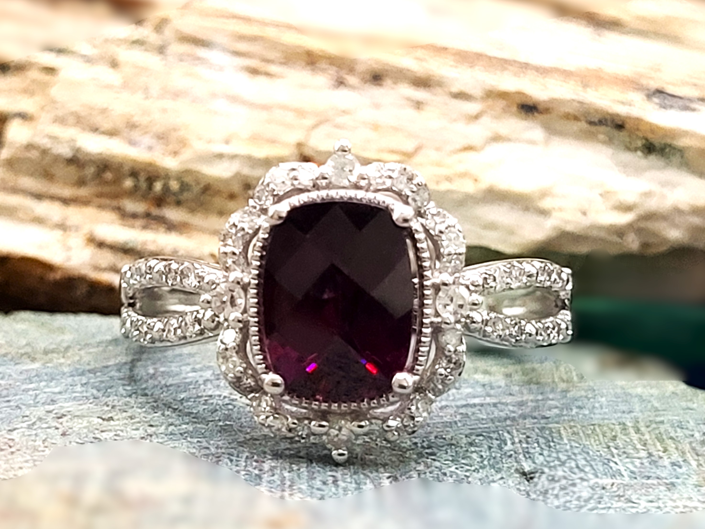 Setting: 14K Yellow Gold Primary Gemstone: Genuine Garnet Gemstone Variety: Pyrope Secondary Gemstone: Genuine, Natural Diamond Size:7 A regal cushion-cut pyrope garnet (1.25ct) glows with deep red fire at the heart of this vintage-inspired ring. Framed by a staggered halo of round, faceted diamonds (.22ctw, H–I color, I1 clarity), the setting evokes timeless glamour. The split, pinched shoulders add graceful symmetry and sparkle, while the 14K white gold band offers a polished, enduring finish. Gemstone: Rhodolite Garnet (1.25ct, cushion-rectangle) Accent Stones: Diamonds (.22ctw, round, H–I color, I1 clarity) Ring Size: 7 (See sizing details and other information below) Gross Weight: 3.19 grams 1. This item is brand new and offered for sale at auction by a manufacturer or individual consignor. The item is in new condition with only the slight possibility of evidence of storage or handling for sale preparation. 2. All weights, sizes, measurements, as well as the color or clarity of any gemstones or diamonds mentioned in the titles, descriptions, introductions, notes or anywhere in the auction catalog shall be considered “approximate” regardless of the inclusion of the word “approximate” or any similar adjective. 3. Props used to aid in photography are NOT included in any lot, unless specified in the title and/or description. 4. This ring can be sized for an additional charge. Normally, sizing will delay shipping by 2-5 days. Please contact Bidfair Fine Jewelry for a sizing quote and turnaround time. 5. The winning bidder may consider getting an appraisal report prepared by an independent GIA graduate gemologist for an additional fee. Most appraisals are as follows: 1) Formal appraisal that is emailed to you and you can print- $75. A printed appraisal (several pages, trifold in a holding sleeve) – $90. Items that are more labor-intensive differ in price. Appraisals may delay shipping, so please contact Bidfair Fine Jewelry for more details. 6282/26-nrr RED GARNET