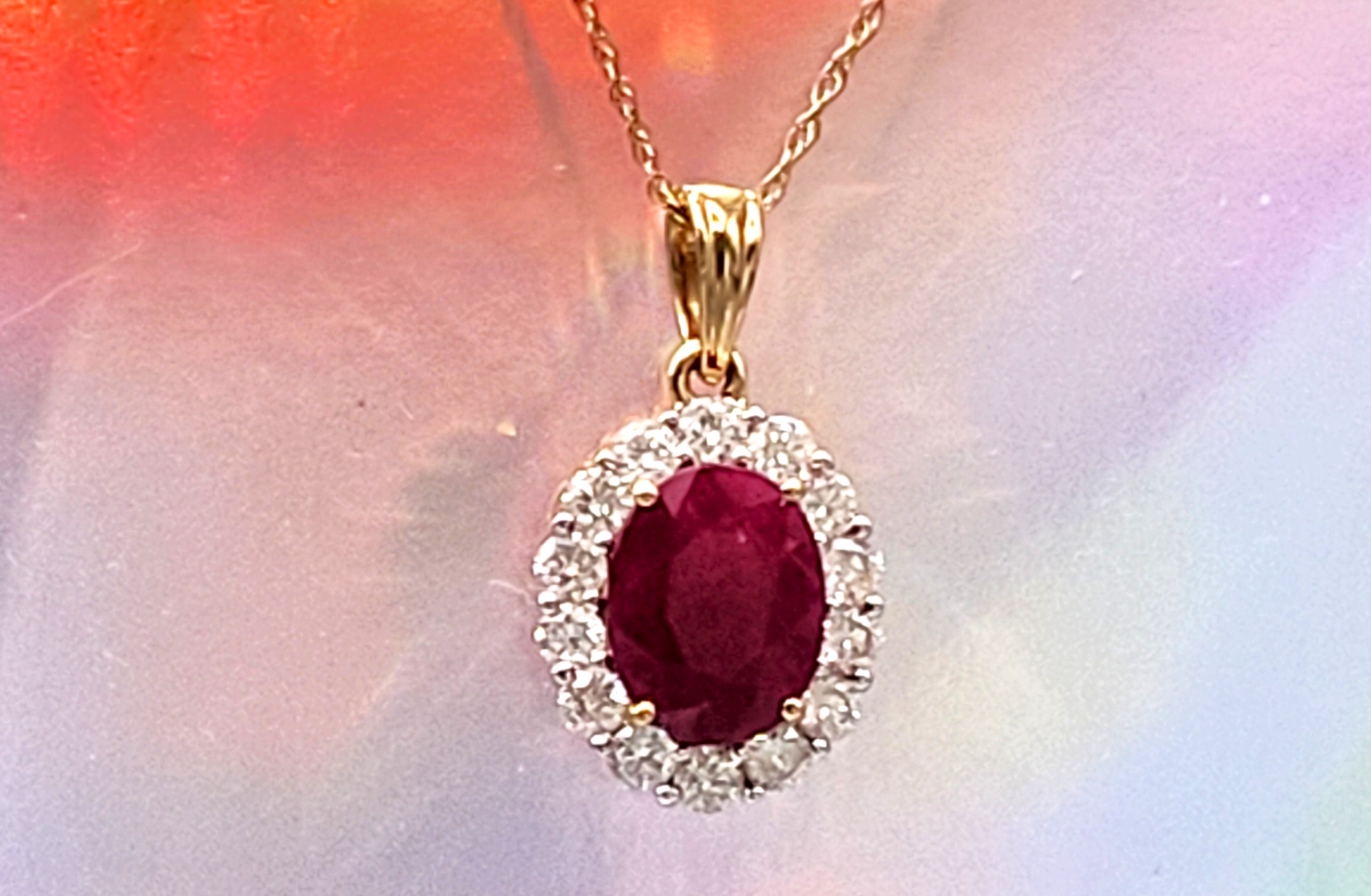 Burma rubies have long been considered one of the most treasured gemstones. So, perhaps you can treasure this 18 karat yellow gold necklace that features a semi-translucent, 2.00 carat oval-cut, genuine Burma ruby* that is prong-set in a halo of .56 carats round, brilliant-cut, H-I color, I1 color, natural diamonds. The pendant has an open back, and a raised rib gallery for support. The solid bail is attached to a fixed ring at the top of the pendant and can accommodate up to an approximate 2.75 mm chain. The pendant currently hangs from an 18 karat yellow gold, ultra-fine rope chain that is 18" long with a lobster clasp.Admin: Q5743/19-brrr – *This ruby is assumed to be heat-treated, the most common method of treating over 95% of marketable rubies.