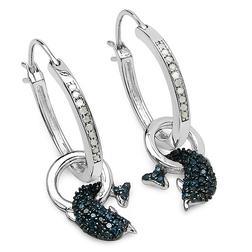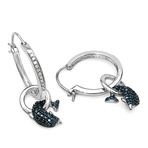 These sterling silver dolphin hoops are guaranteed to bring smiles. These 3/4" hoops are lined with .10 carat total weight of round, faceted, I-J color, I2-I3 clarity glittering diamonds and removeable sterling silver charms with happy, jumping dolphins that are encrusted with .42 carats total weight of round, faceted, genuine fancy blue diamonds. A black rhodium finish beneath teh dolphins brings out the beauty of the blue diamonds and the rest of the earrings have a tarnish–resistant, rhodium finish. The earrings attach to the earlobes with a hinged, wire post and a snap-in safety clip. See below for other details. Weight: 5.78 grams. AdminCode: NNQK/1216-bgl