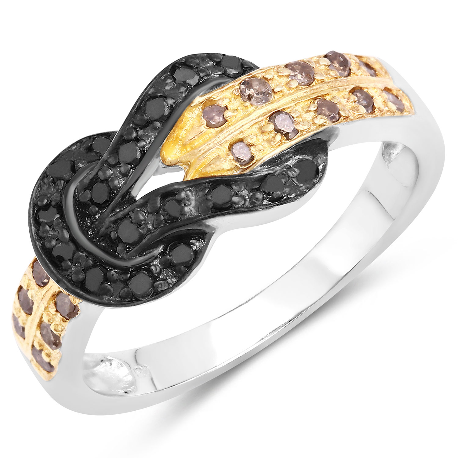 This sterling silver ring features a new era classic design variation of the Hercules Knot, also called the Love Knot. Approximately one-third carats total weight round, faceted black and champagned-brown colored diamonds are encrusted along this ‘lover’s knot’ and enhanced with a tarnish-resistant black and gold-colored rhodium finish. The ring is US size 7. With the specialty finish, there are no sizing options offered with this ring. Weight: 2.95 grams AdminCode: NNQK1215/wn
