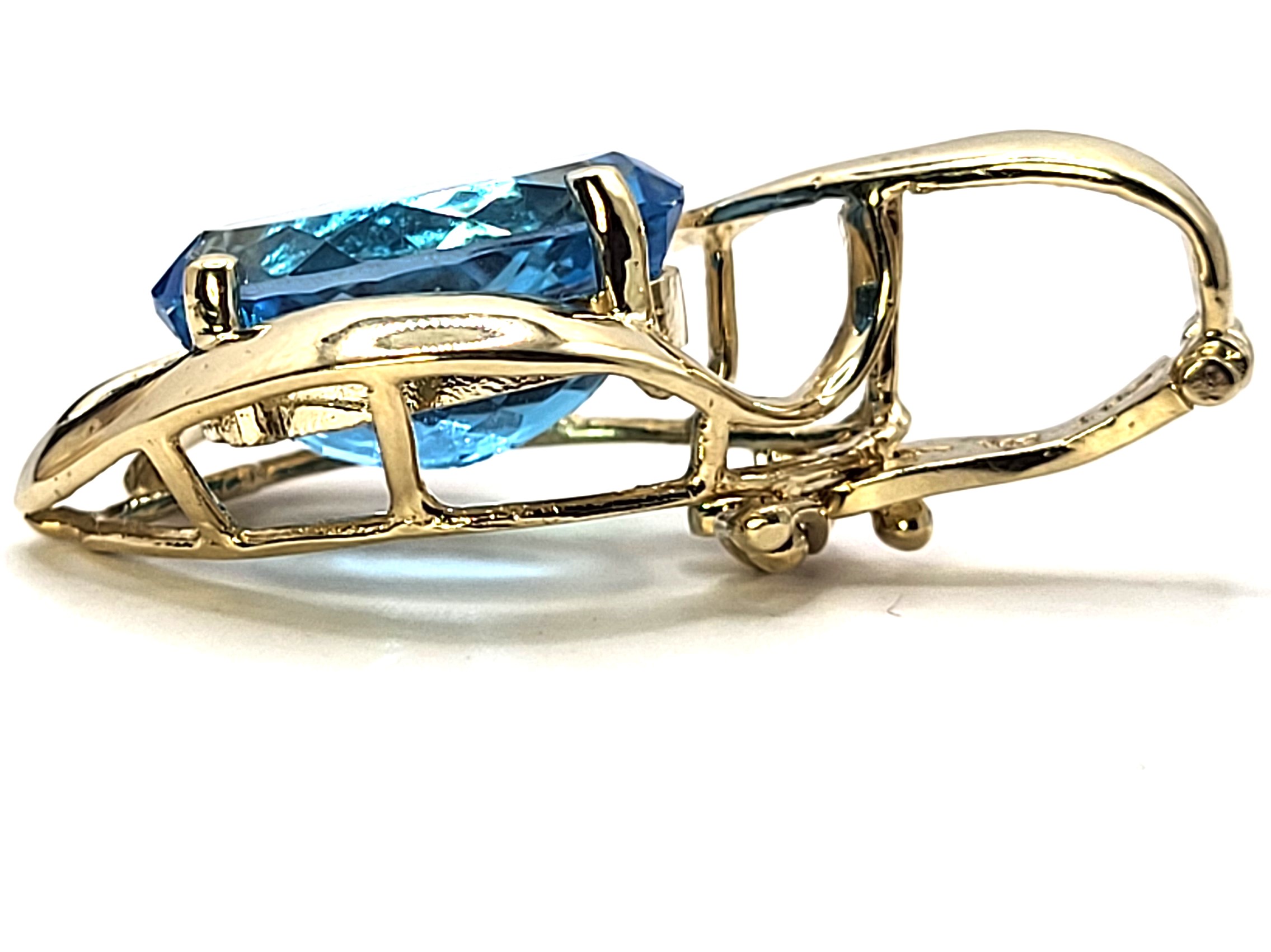 With its hinged bail, this pendant easily becomes an enhancer for pearls or bead-style jewelry. This 14 karat yellow gold pendant (or enhancer) features an approximate 7 or 8.00 Carat oval-cut, prong-set, genuine Swiss Blue Topaz with wide, sweeping ribbons of 14K yellow gold and a built-in hinged bail and a safety clip. approx 1.25" long. Admin:33110-1lgt 100195/4.119G