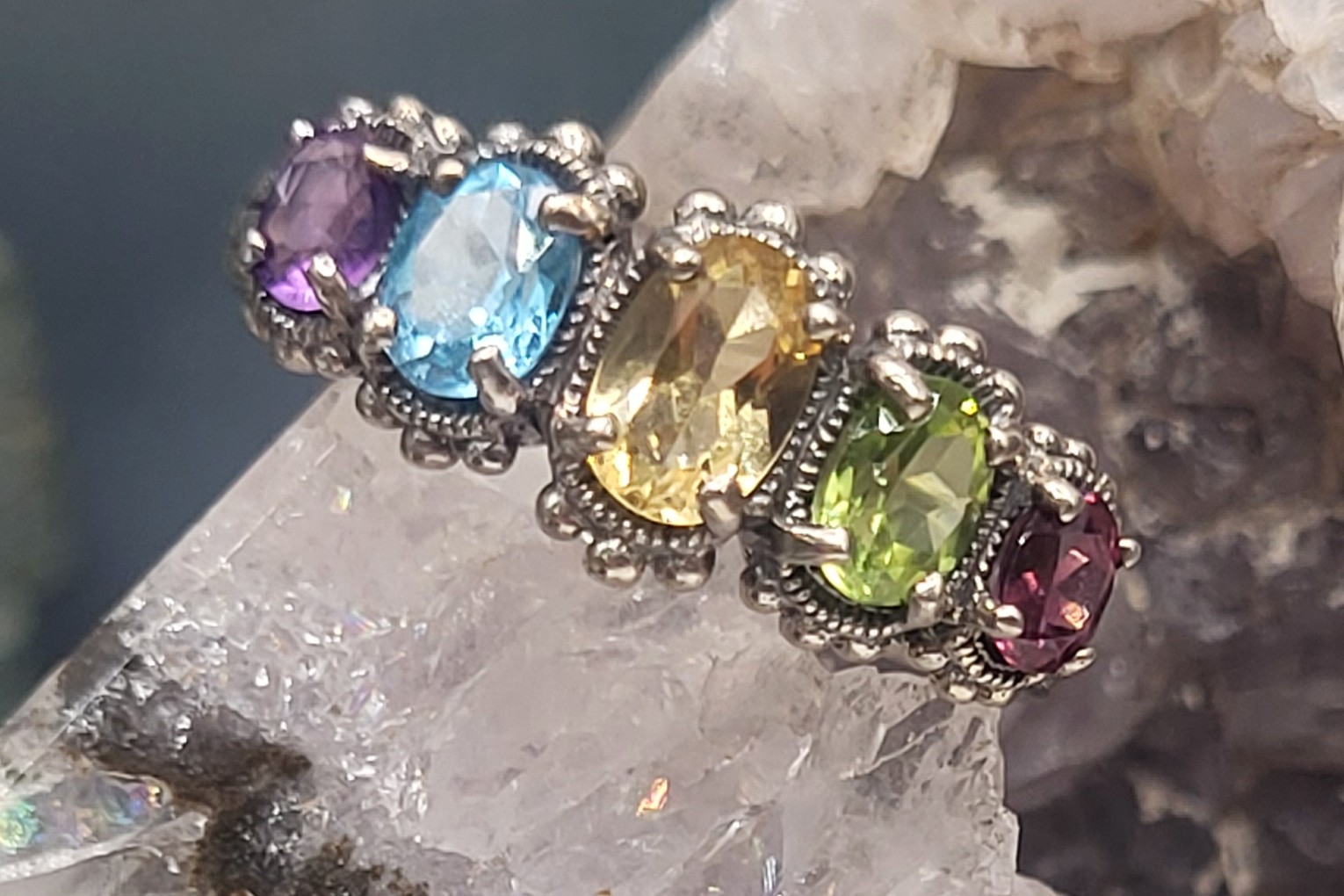 Setting: Sterling Silver .925 Primary Gemstone: Multiple Semiprecious: Rhodolite Garnet, Peridot, Citrine, Swiss Blue Topaz, & Amethyst Size: 7.5 Geographic Origin: All are Earth-mined gemstones.
