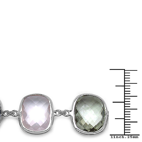 This sterling silver bracelet will be your new favorite for sure! Stationed along the 7.5" strand of sterling silver chain are bezel-set, checkerboard-faceted, genuine, semi-precious gemstones. Included are black onyx and smoky quartz that contrast remarkably with the rose quartz and lemon quartz gemstones, and to balance it out is peaceful green quartz (green amethyst). It seems all the chakras are covered with this bracelet! It latches with a lobster clasp. The bracelet has a tarnish-resistant finish to keep your new favorite in gleaming condition! Weight: 213. grams. AdminCode: NNQK/1216-bpg