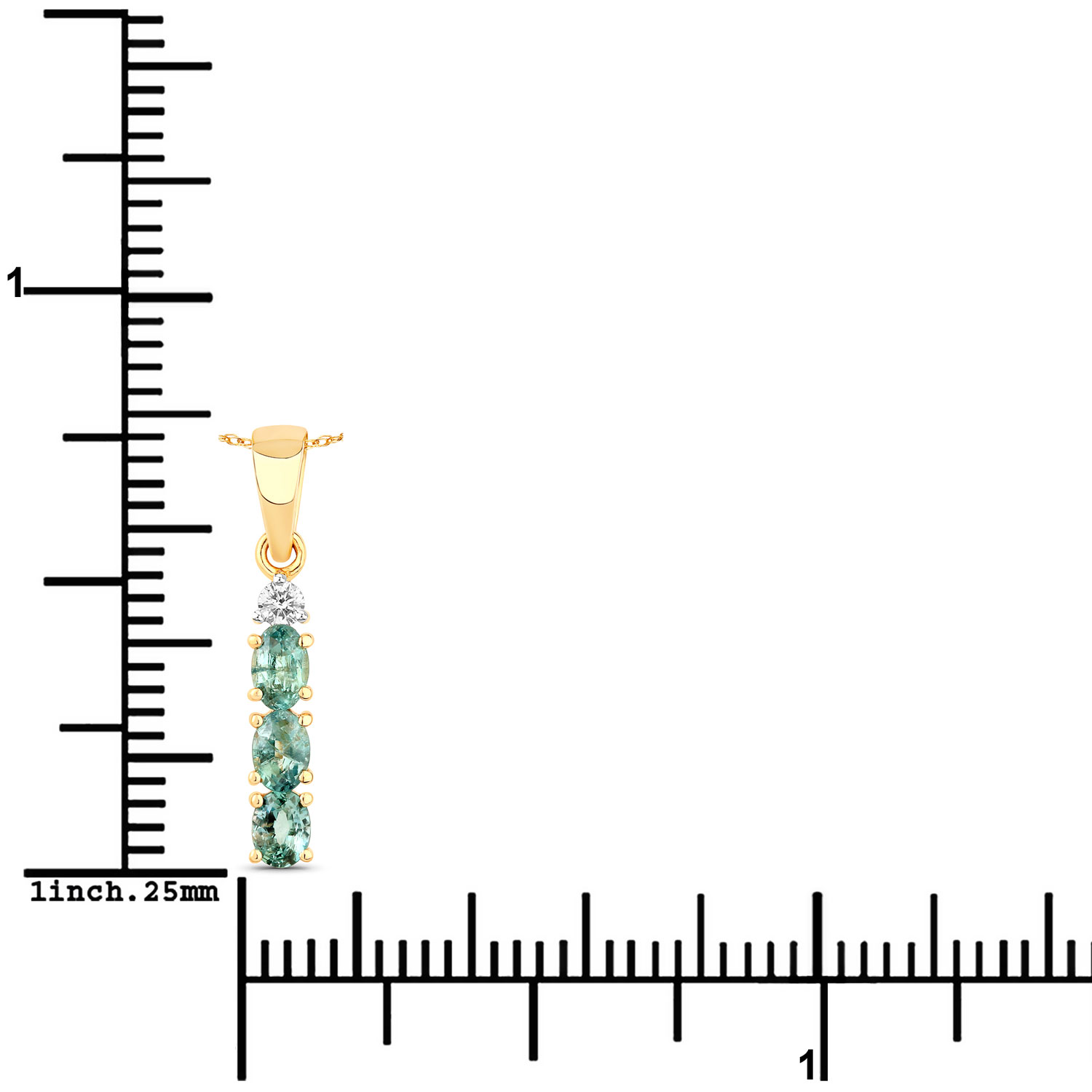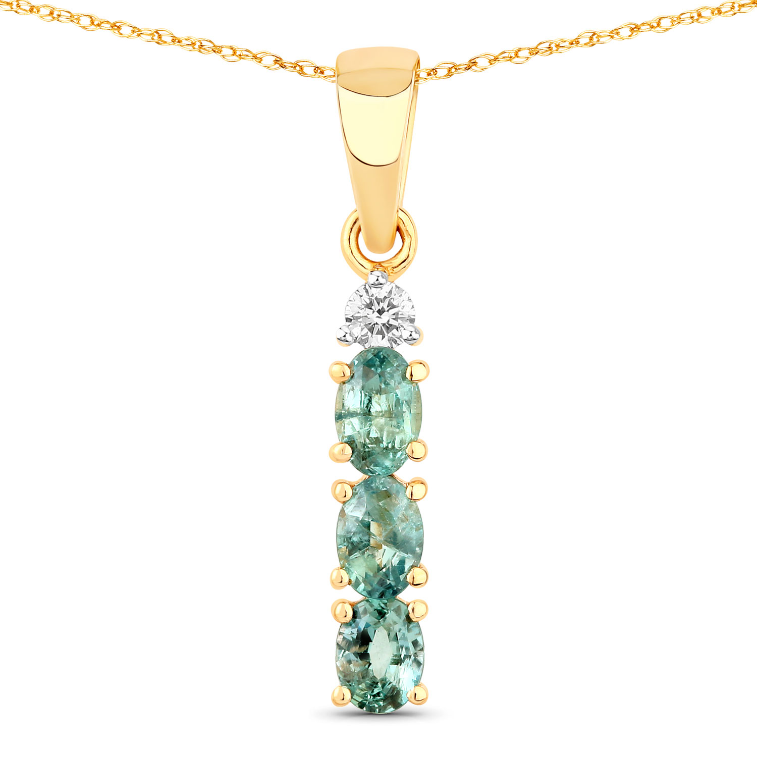 This 18 karat yellow gold three-stone pendant features .39 carats total weight of oval-cut, genuine, allluring, Alexandrites. These mysterious, color-changing gemstones are 3.5mmx2.5mm and are prong-set beneath a round, brilliant-cut, genuine, G-H color, SI1-SI2 diamond. The built-in, solid bail at the top of the pendant can accommodate an approximate 2mm wide chain. Weight: .82 grams. See other information below. AdminCode: NNQK1116/geo