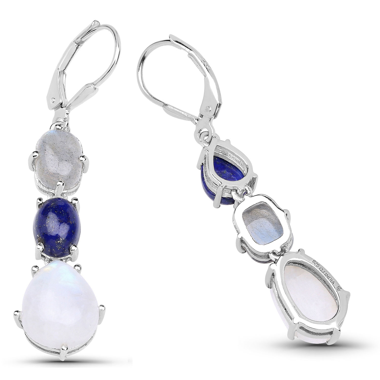 Be the first to style in your town with these sterling silver mixed-gemstone, mixed-cut dangling earrings! Set with mixed cut genuine lapis cabochons, a pear- and oval-cut cab (one in each earring) for a total of 2.44 carats total weight, and two 8x6mm cushion-cut, genuine labradorites (one in each earring) for 1.62 carats total weight, and a 12x10mm and 12x8mm (one in each earrings) fancy-shaped, genuine rainbow moonstone for a total of 6.11 carats total weight, these earrings ‘foot the bill’ for one of the hottest jewelry trends for 2026! They are 2" long and attach to the earlobe with lever backs. The tarnish-resistant rhodium finish with keep them shining for many years to come. Gross Wt:6.6 See other important informaton below. AdminCode: NNKQ/pb