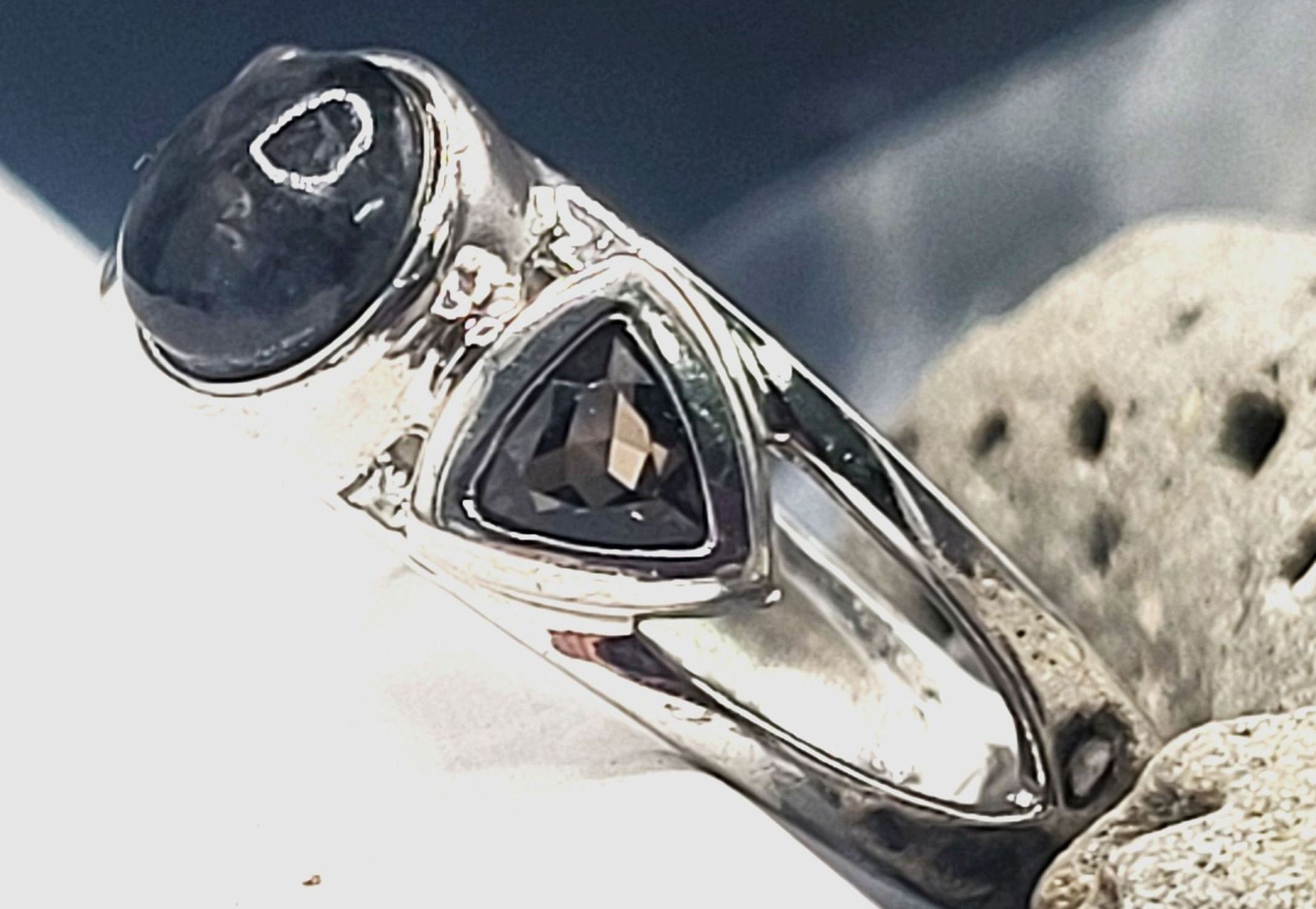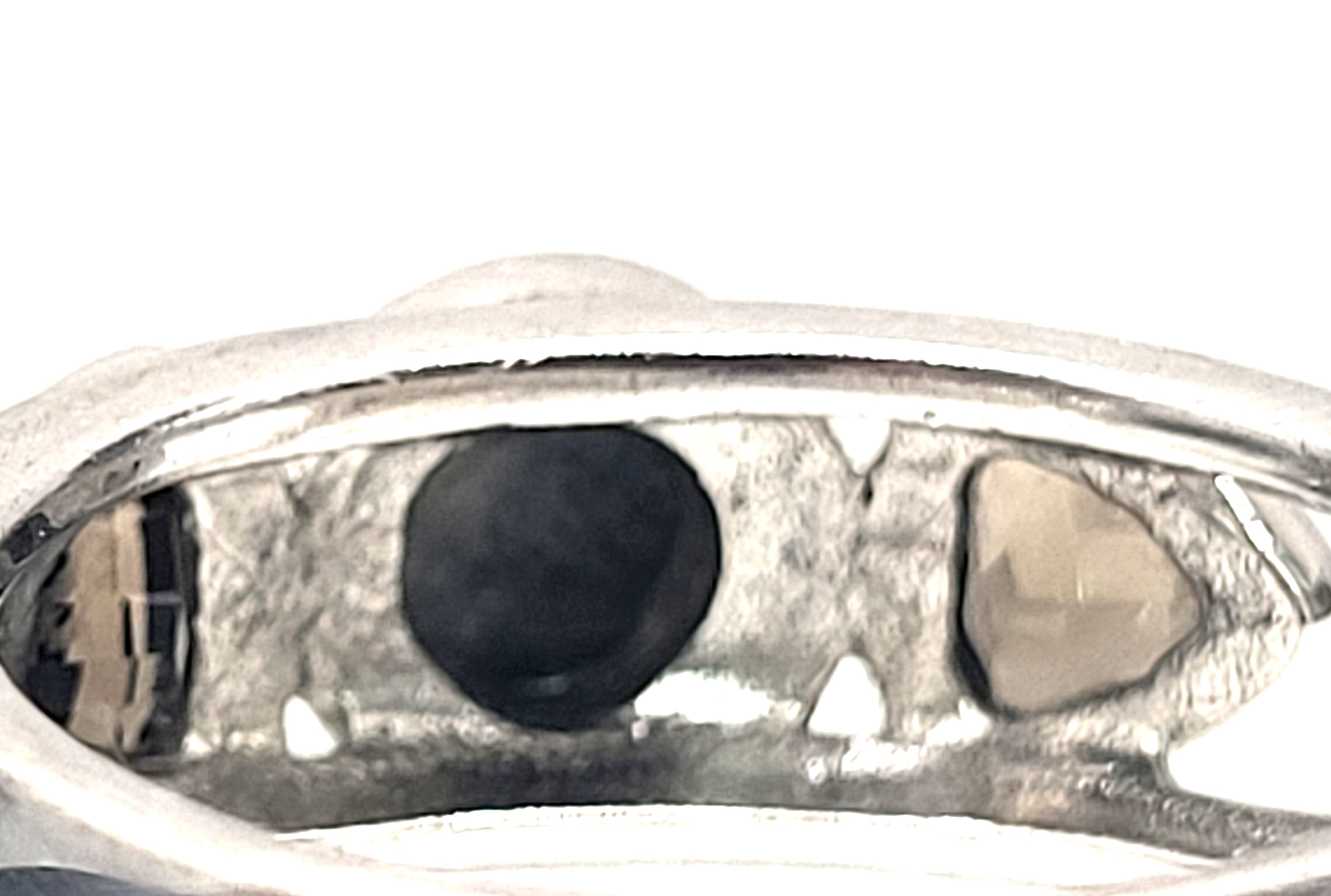 This is a sterling silver ring that features a cabochon center amethyst and trilliant-cut citrine adjacent. The open (split) shoulder design and the bezel-set gemstones make an attractive ring for a man or a woman The ring is US size 9.75. See sizing options and other idetails below. 6.53 grams.. Admin: KMEL3/lg 1) All weights, sizes, measurements, as well as the color or clarity of any gemstones or diamonds mentioned in the titles, descriptions, introductions, notes or anywhere in the auction catalog shall be considered "approximate" regardless of the inclusion of the word "approximate" or any similar adjective.