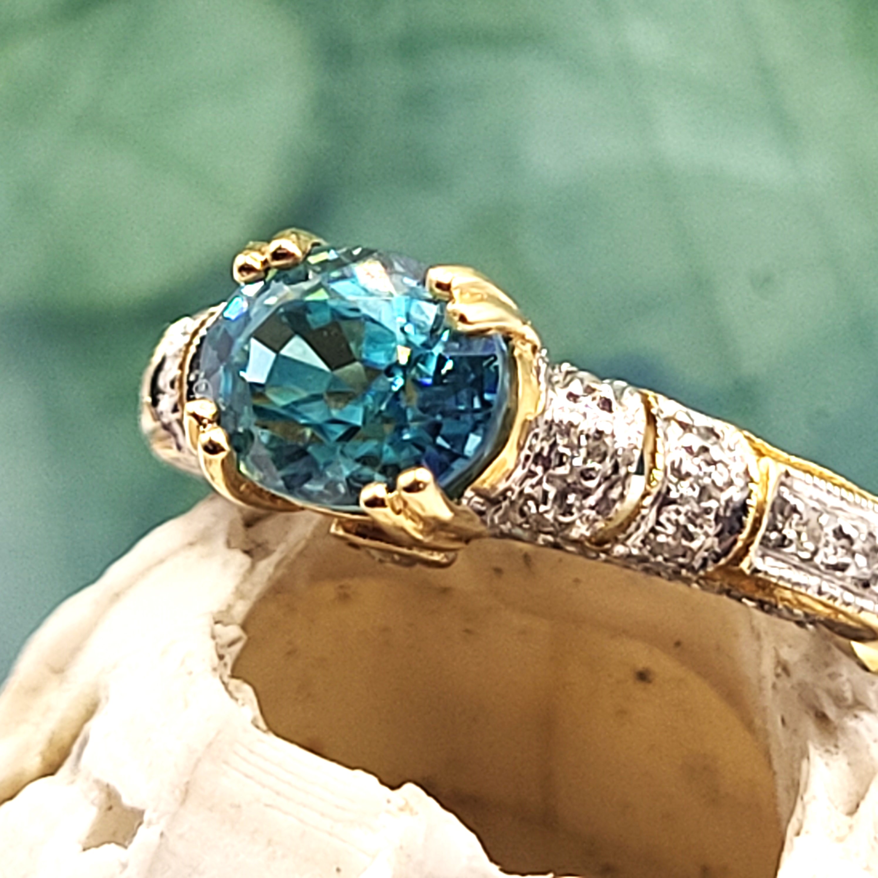 This is a 14 karat yellow gold ring that features a gorgeous oval-cut, East-West set with double prongs, genuine blue zircon, approximately 2.00 carats. There are .25 carats total weight of round, brilliant-cut diamonds in the bridge and along the shoulders. This ring is an approximate US size 10 and can be sized for an additional charge. Please contact Bidfair Fine Jewelry for sizing details. Admin: 33110/10lh
