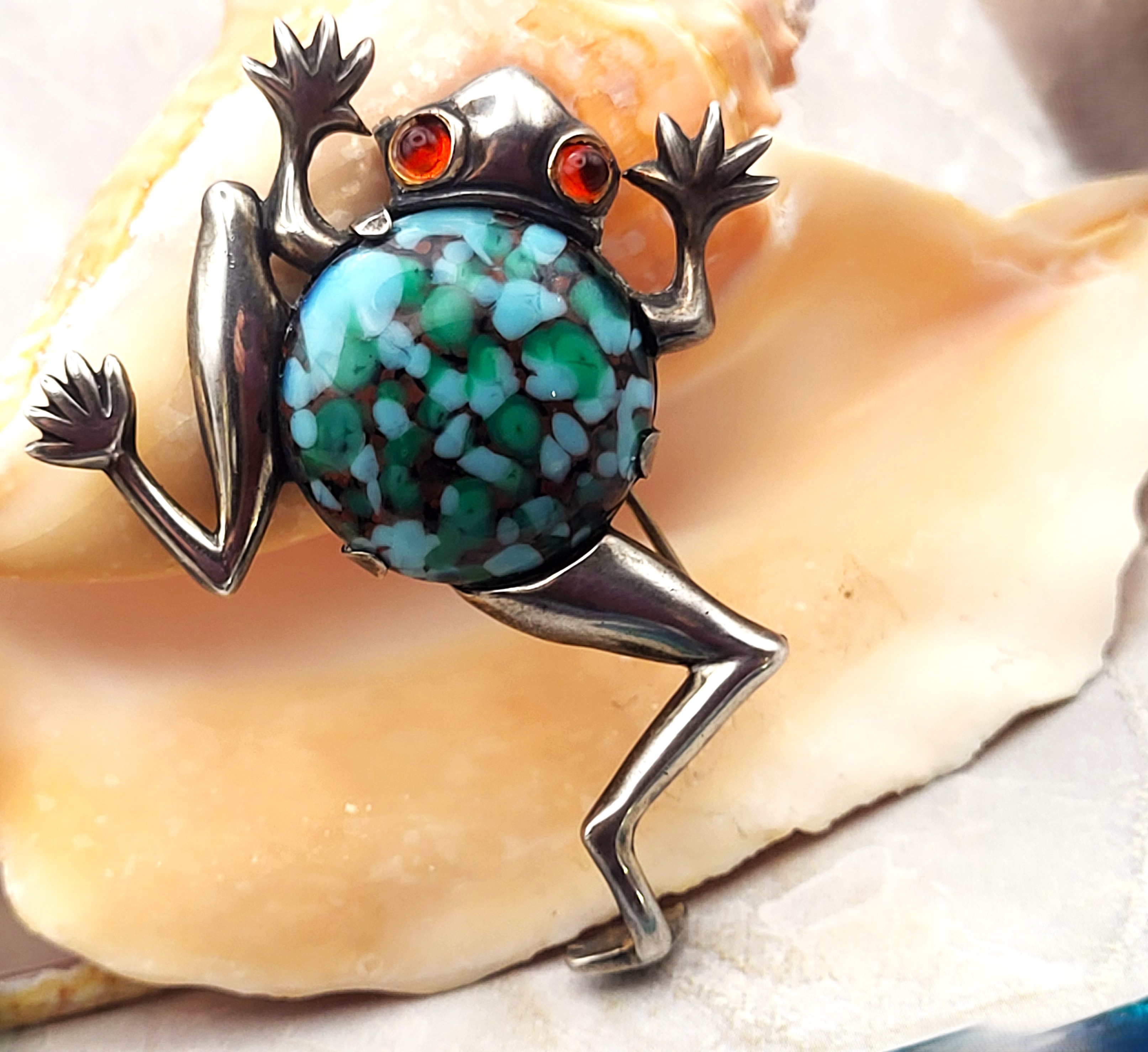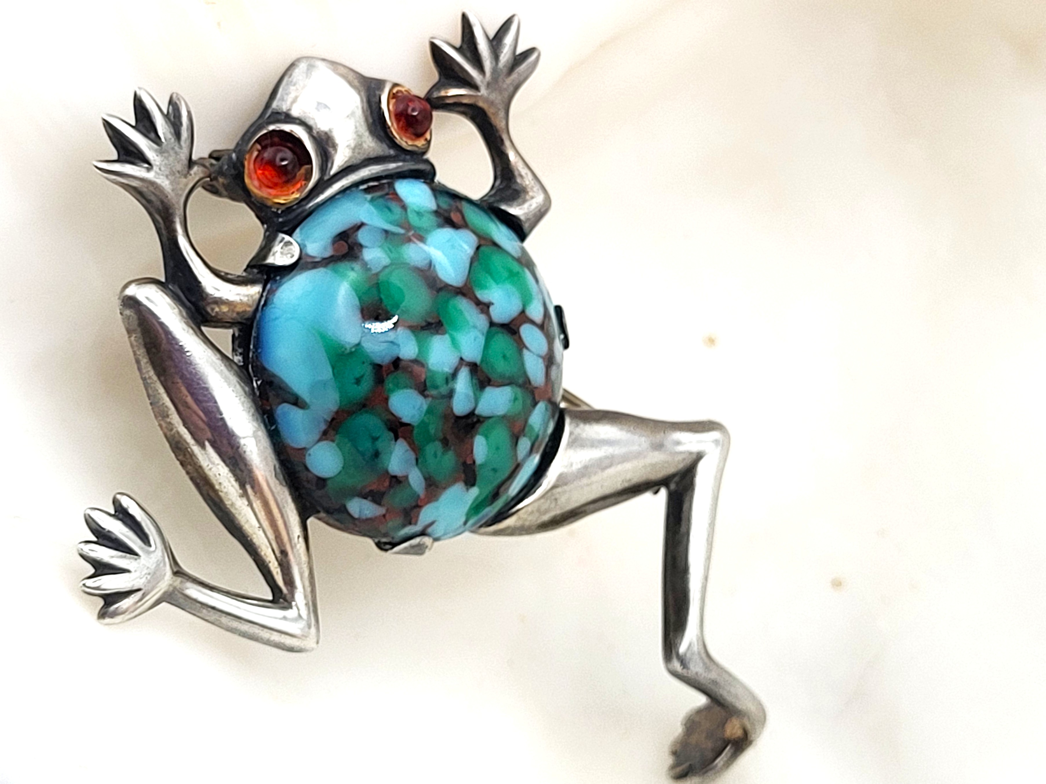 2) All weights, sizes, measurements, as well as the color or clarity of any gemstones or diamonds mentioned in the titles, descriptions, introductions, notes or anywhere in the auction catalog shall be considered "approximate" regardless of the inclusion of the word "approximate" or any similar adjective. 3) Props used to aid in photography are NOT included in any lot, unless specified in the title and/or description. #FrogBrooch #HandmadeJewelry #SterlingSilverStyle #NatureInspired #BidfairStyle #UniqueFinds #VintageJewelry #VintageFrog #Vintage #Brooch #FiguralFrog