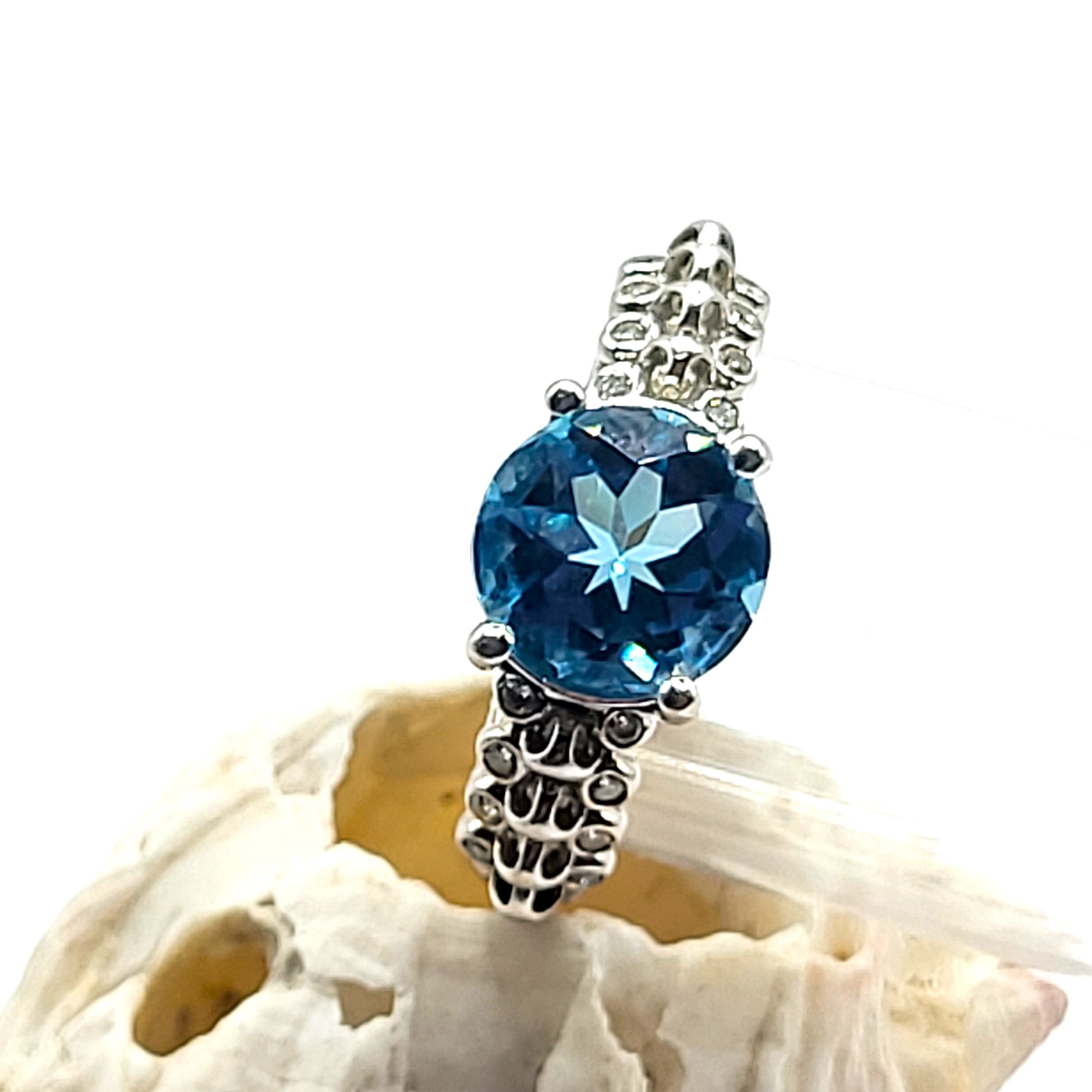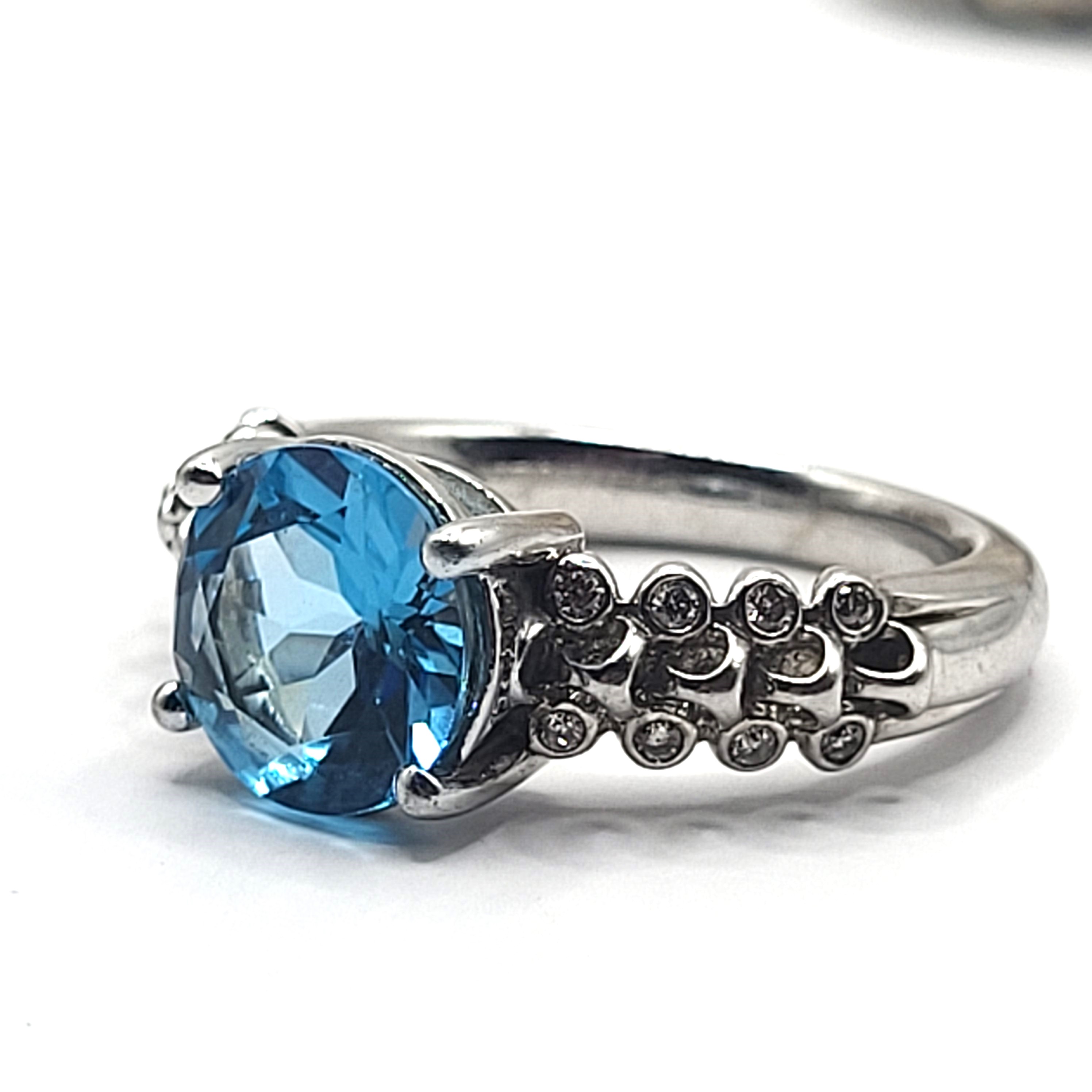 Setting: Sterling Silver Main Gemstone: Genuine Blue Topaz Adjacent Gemstone: Genuine, Natural Diamond Size: US 6.25 Designer/Hallmark: DiModolo Di Modolo jewelry in Milan, Italy, began in 2001 when Dino Di Modolo founded the luxury jewelry brand that is crafted with the finest Italian workmanship and has focused on the essence of the modern woman . This sterling silver ring by Di Modolo, Italy, features an approximate 2.00 carat round, faceted, genuine Swiss blue topaz and .16 carats total weight round, brilliant-cut, H color, SI2 clarity diamonds that are bezel-set on the shoulders. The shoulders are further adorned with sterling silver beads between the diamonds. The shoulders taper to an approximate 2.80mm comfort-fit shank. This ring is US size 6.25. See sizing details and other information below.additional charge. Rest assured, the master jeweler Bidfair Fine Jewelry partners with for sizing will NOT destroy the hallmark that is stamped inside the shank. Admin: 33122/8g 1) This is an estate item that is in very good to excellent condition, with little to no scratches, dents, or patina. 2) All weights, sizes, measurements, as well as the color or clarity of any gemstones or diamonds mentioned in the titles, descriptions, introductions, notes or anywhere in the auction catalog shall be considered “approximate” regardless of the inclusion of the word “approximate” any similar adjective. 3) Props used to aid in photography are NOT included in any lot, unless stated in the title and/or description. 4) This ring can be sized for an additional charge. Please contact Bidfair Fine Jewelry for more information.