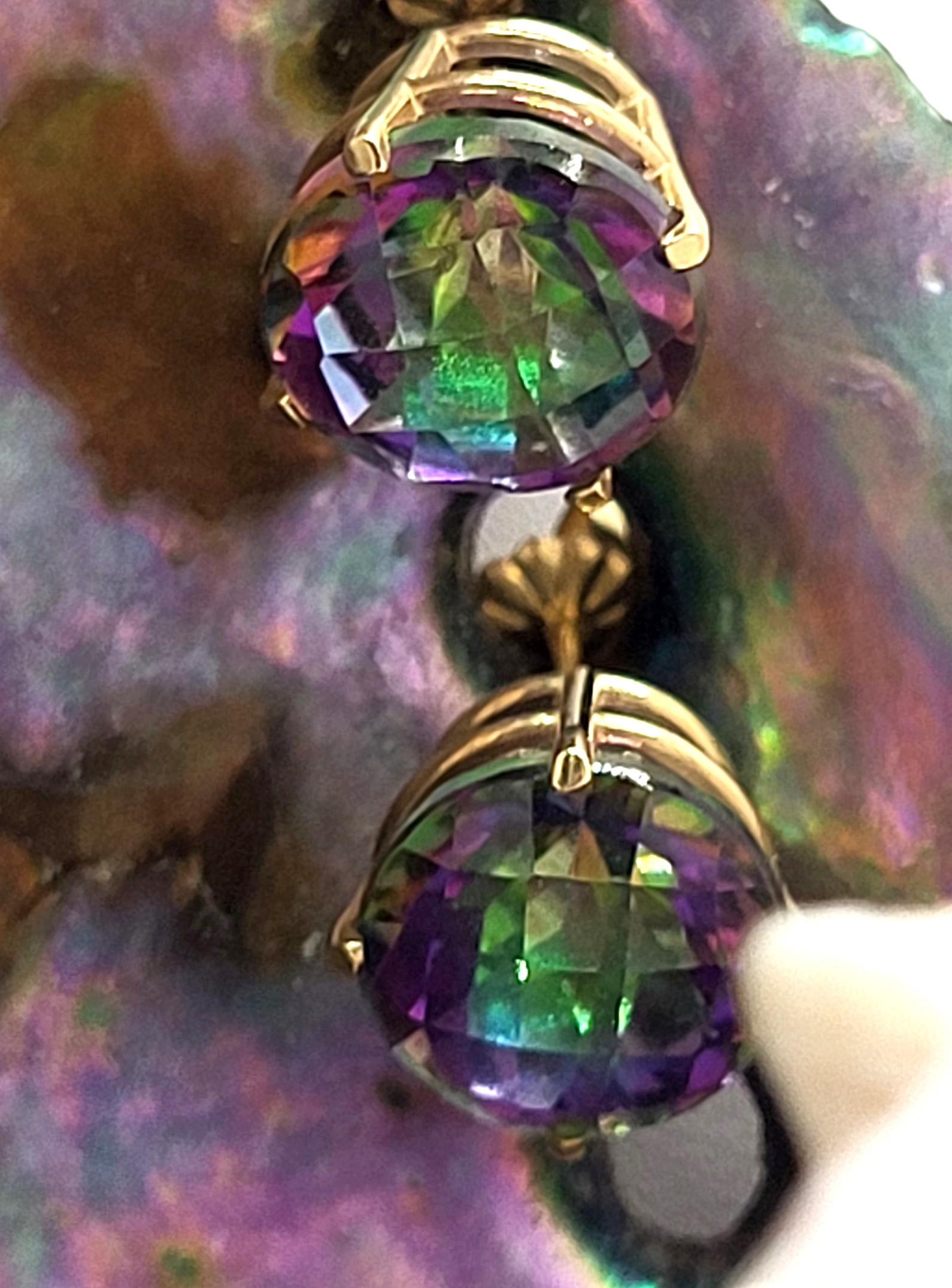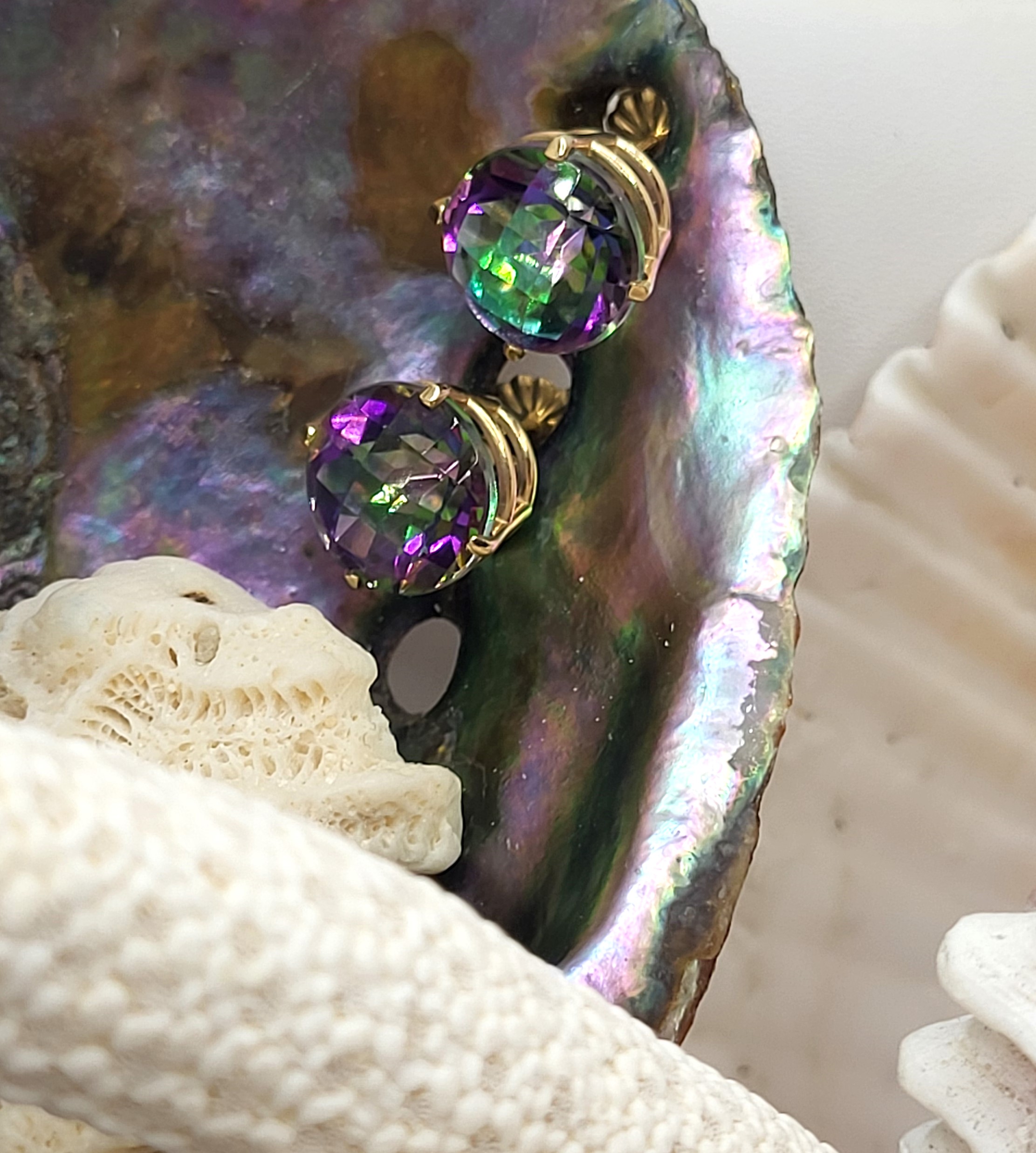 DOUBLE THE DAZZLE BY CREATING A DEMI-SUITE WITH THE MYSTIC TOPAZ PENDANT IN THE PREVIOUS LOT! Setting: 14K Yellow Gold Main Gemstone: Genuine Mystic Topaz* Closure: Posts and Friction Backs Footnote: Made by a local jeweler/crafstman (Florida’s Space Coast) This is a dazzling pair of 14 karat yellow gold mystic topaz earrings that have a combined total of approximately 6.00 carats, round-cut, top-faceted mystic topaz. The gemstones are secured in four-prong settings with a supportive gallery rail. The earrings are approximately 3/8″ diameter and attach to the earlobes with posts and friction backs. *Mystic Topaz are genuine clear topaz with a specialized treatment applied to the pavilion of the pendant. 1) This is a brand new item that has been held in back stock. It is in excellent condition, but may have minor signs of storage, such as fine scratches oratina. 2) All weights, sizes, measurements, as well as the color or clarity of any gemstones or diamonds mentioned in the titles, descriptions, introductions, notes or anywhere in the auction catalog shall be considered “approximate” regardless of the inclusion of the word “approximate” or any similar adjective. 3) Props used to aid in photography are NOT included in any lot, unless stated in the title and/or description.