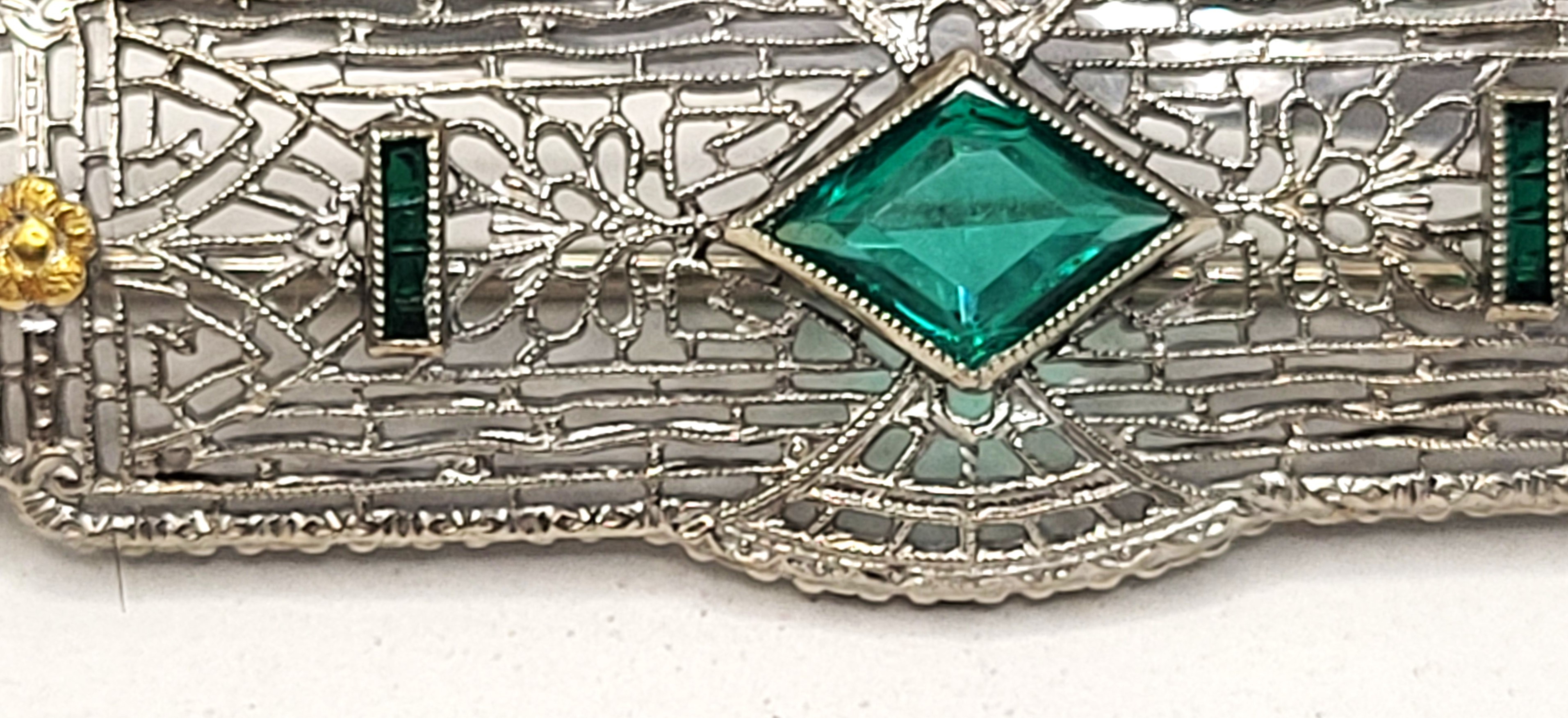 This antique bar brooch is a testament to the overlapping of the historical eras of jewelry making. It is believed to have been crafted in the middle of the Belle Epoque jewelry era, having characteristics of 4 different movements. It is crafted in 10 karat white gold, which only became commercially available around 1910. The beautiful filigree design and use of flower designs is characteristic of late-Victorian era until the Art-Deco era. The brooch is set with emerald simulants that were wildly popular as cinema and movie stars began influencing fashion to the general public instead of kings, queens, princes, and princesses. The centralized arches along the length of the brooch represents the Art Nouveau influence on this piece, as well as the use of yellow gold for the flowers, breaking away from the traditional ‘white on white’ look. The production of kite-shaped gemstones had just begun, although they became more popular about a decade later, in the Art Deco movement. The attached C-clasp with a lever safety closure is further indication that this brooch was crafted around 1910. This brooch has passed through over 100 years of history. It was probably worn daily for decades, stored for several more decades in a long-forgotten jewelry box, and is certainly ready to be worn again! It has minimal damage for its age, and is still in wearable condition.
