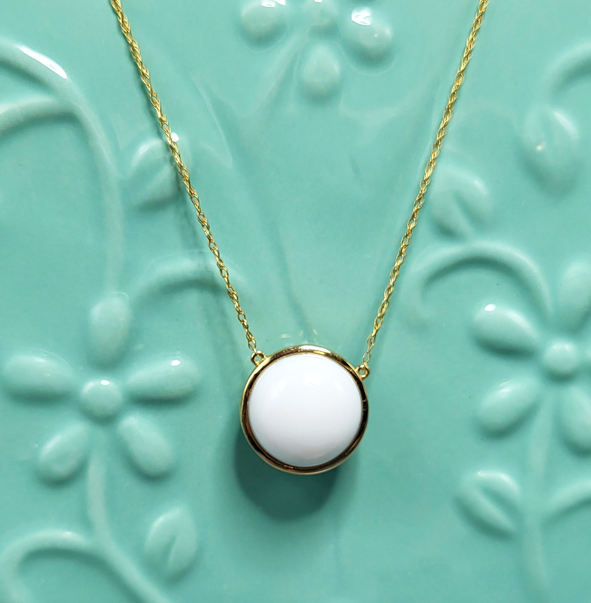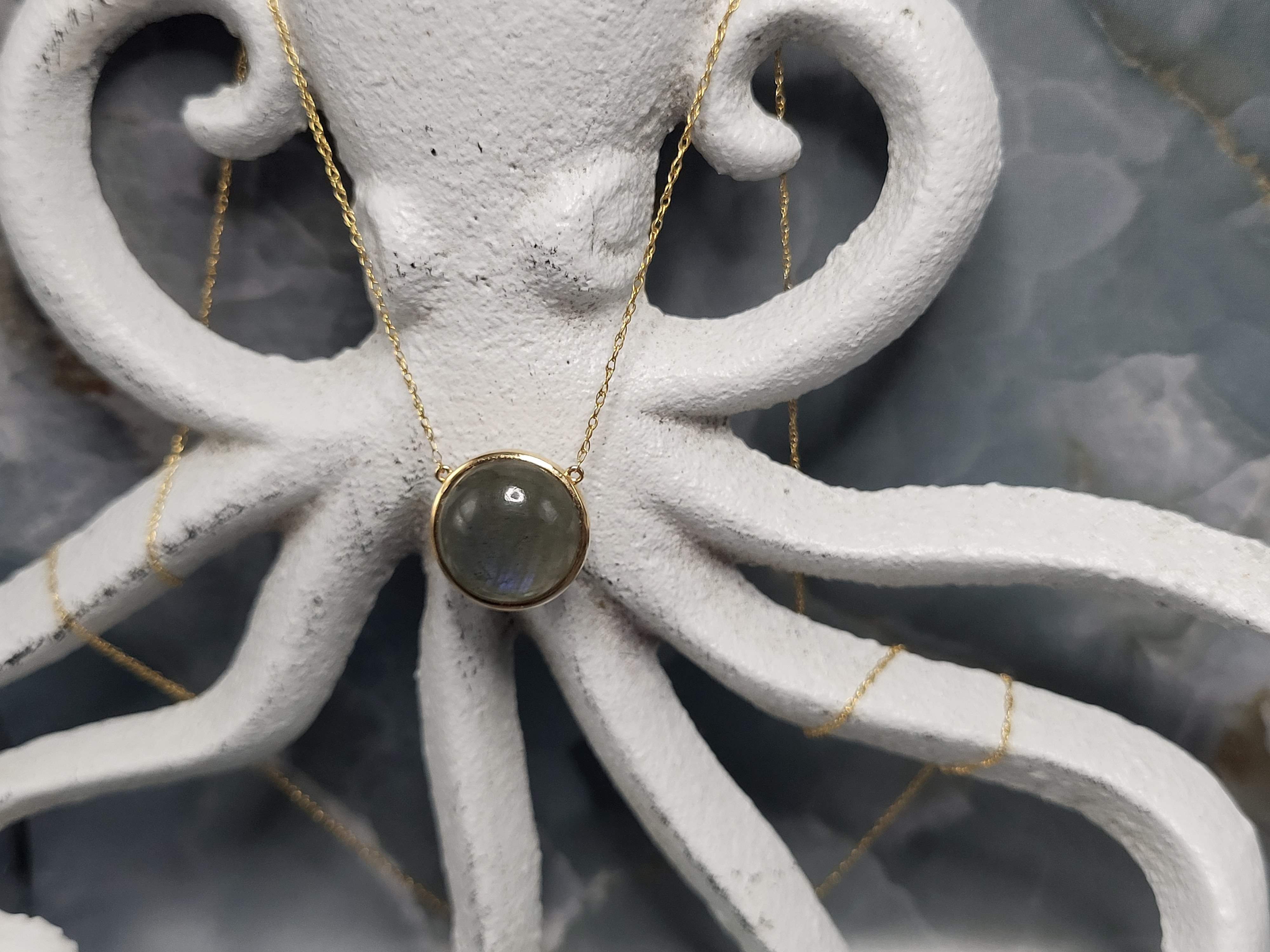 Setting: 18K Yellow Gold Primary Gemstone: Genuine Labradorite Secondary Gemstone: Genuine White Opal Closure: Spring Ring Length: 18″ Adjustable This reversible pendant necklace features a half-cut (mabe-style) labradorite on one side and a smooth white opal on the other—each bezel-set in rich 18K yellow gold. The 10mm pendant is stationary on a superfine rope link chain with a spring ring clasp and an extra “O” ring 2″ from the closure for adjustable wear. The labradorite glows with subtle depth, while the white opal offers a clean, luminous finish without play-of-color. A quietly luxurious piece with dual personality and timeless appeal. AdminCode: 6282/35 – nrr Weight: 3.77g Gemstones: 4.88 CT Labradorite, 4.31 CT White Opal (pastel)Chain: 18″ Superfine Rope with 2″ Adjustment Ring 1. This item is brand new and offered for sale at auction by a manufacturer or individual consignor. The item is in new condition with only the slight possibility of evidence of storage or handling for sale preparation. 2. All weights, sizes, measurements, as well as the color or clarity of any gemstones or diamonds mentioned in the titles, descriptions, introductions, notes or anywhere in the auction catalog shall be considered “approximate” regardless of the inclusion of the word “approximate” or any similar adjective. 3. used to aid in photography are NOT included in any lot, unless specified in the title and/or description. #ReversiblePendant #LabradoriteGlow #WhiteOpalElegance #18KGoldNecklace #MabeGemstones #MinimalLuxury #FineJewelryFind #BidFairExclusive #DualStyleDesign #SubtleStatement