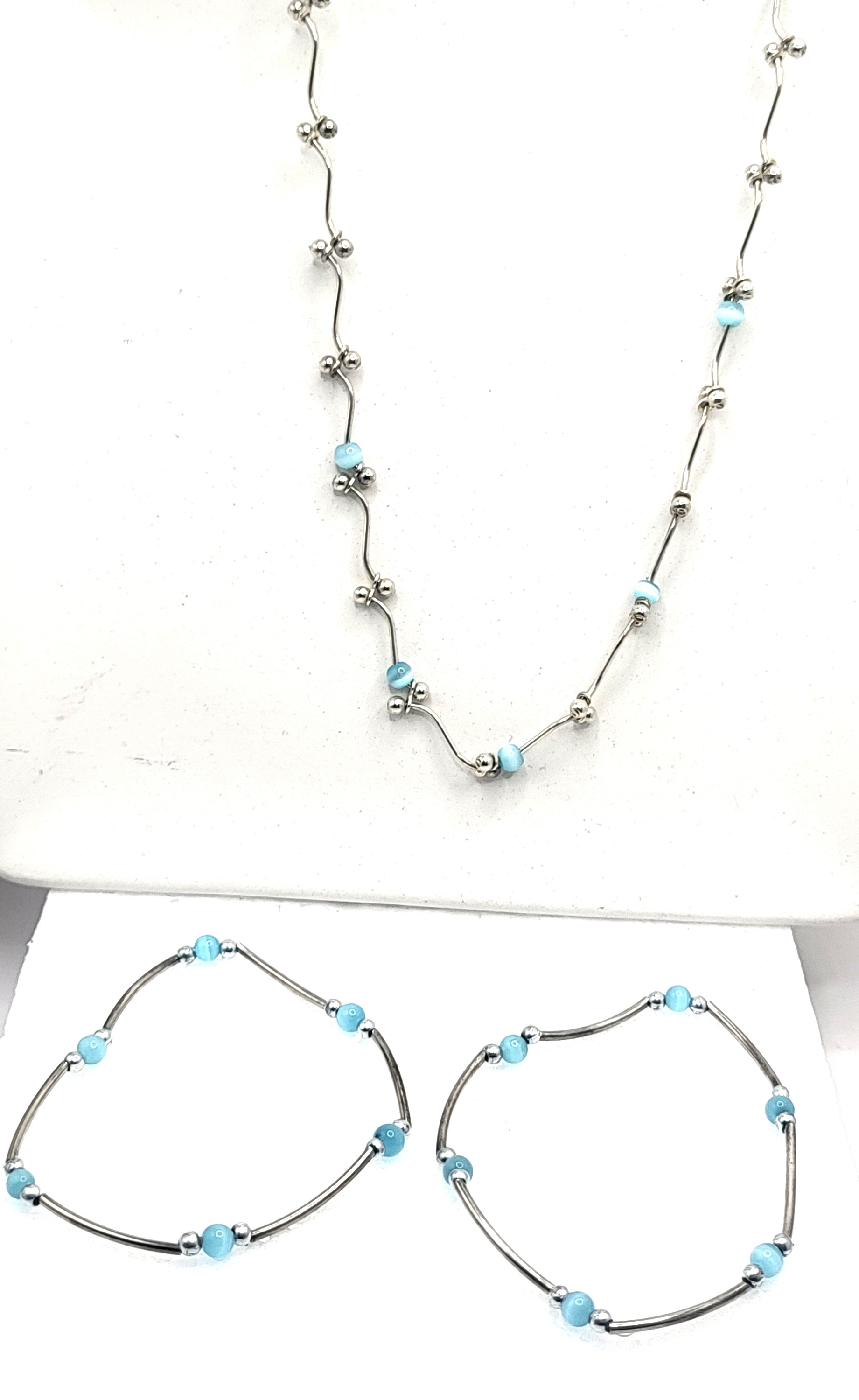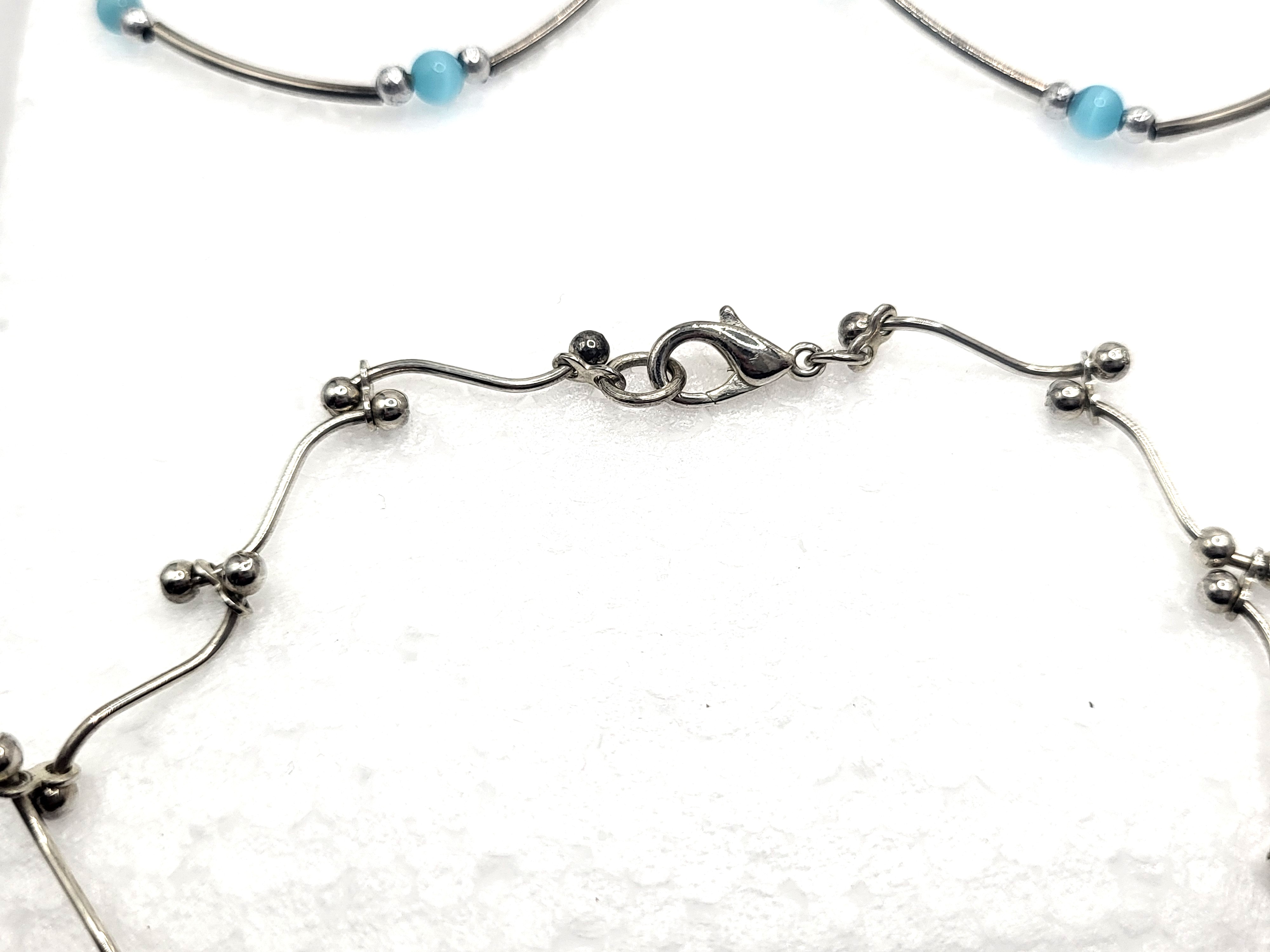 This sterling silver jewelry set includes two bracelets and one necklace. Both bracelets feature approximate 4-4.5mm beads of blue chrysoberyl, also called blue cat’s eye (most likely lab-created) and 2.75mm sterling silver beads that separate sterling silver tubes. Each segment of the combination is approximately 1" long and strung on elastic cord, making 2-7" bracelets. The necklace also features the lab-created blue cat’s eye and sterling silver beads and tubes, but the tubes in this necklace are tilda-shaped. The segments on the necklace are approximately 3/4" and connect to each other through an attached coupler. The necklace is approximately 17" with a lobster clasp. Admin: 33119-21bh