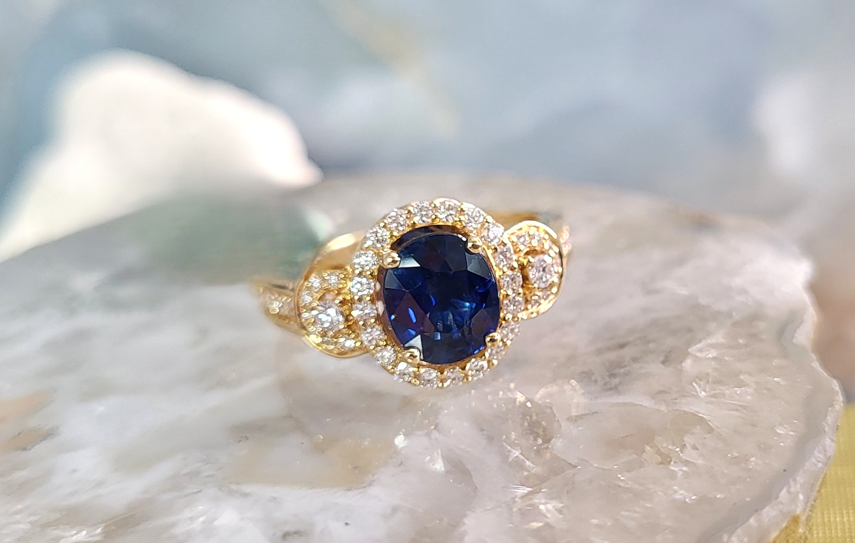 Setting: 18K White Gold Primary Gemstone: Genuine Blue Sapphire Secondary Gemstone: Genuine, Natural Diamond Size: US 7 This item qualifies for a FREE electronic appraisal. Upon payment in full, an independent GIA graduate gemologist will prepare and write the appraisal and email it to the winner. The appraisal can then be downloaded and printed. An elegant ring in 18K gold, size 7, showcasing a 1.67 ct cushion-cut blue sapphire of exceptional color and brilliance. Surrounding the sapphire is a halo of .41 ctw round brilliant-cut diamonds (G color, SI1 clarity), adding radiant sparkle and enhancing the gem’s vivid hue. The supportive under gallery ensures both comfort and durability, making this piece as practical as it is breathtaking. A timeless jewel for the collector who values classic sophistication and vibrant gemstones. See sizing details and other information below. AdminCode: 6282/7-lrrr 1. This item is brand new and offered for sale at auction by a manufacturer or individual consignor. The item is in new condition with only the slight possibility of evidence of storage or handling for sale preparation. 2. All weights, sizes, measurements, as well as the color or clarity of any gemstones or diamonds mentioned in the titles, descriptions, introductions, notes or anywhere in the auction catalog shall be considered “approximate” regardless of the inclusion of the word “approximate” or any similar adjective. 3. Props used to aid in photography are NOT included in any lot, unless specified in the title and/or description. 4. This ring can be sized for an additional charge. Normally, sizing will delay shipping by 2-5 days. Please contact Bidfair Fine Jewelry for a sizing quote and turnaround time. 5. The winning bidder may consider getting an appraisal report prepared by an independent GIA graduate gemologist for an additional fee. Most appraisals are as follows: 1) Formal appraisal that is emailed to you and you can print- $75. A printed appraisal (several pages, trifold in a holding sleeve) – $90. Items that are more labor-intensive differ in price. Appraisals may delay shipping, so please contact Bidfair Fine Jewelry for more details. #Auction13 #BlueSapphire #DiamondHalo #LuxuryRing #FineJewelry #18KGold #BidFairTreasures #CollectorGem #TimelessElegance #BrilliantDesign