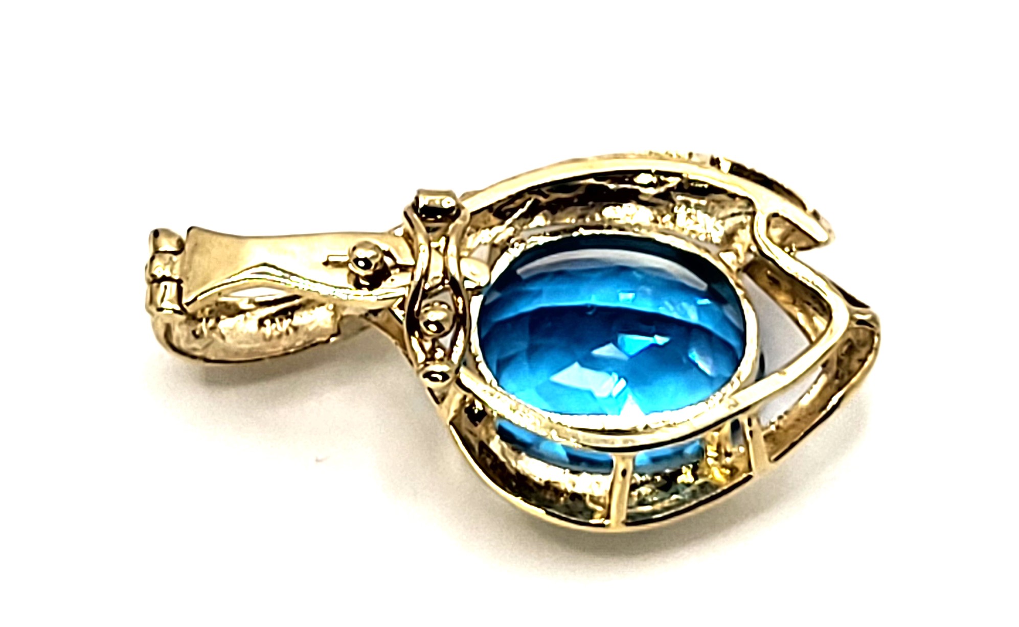 With its hinged bail, this pendant easily becomes an enhancer for pearls or bead-style jewelry. This 14 karat yellow gold pendant (or enhancer) features an approximate 7 or 8.00 Carat oval-cut, prong-set, genuine Swiss Blue Topaz with wide, sweeping ribbons of 14K yellow gold and a built-in hinged bail and a safety clip. approx 1.25" long. Admin:33110-1lgt 100195/4.119G
