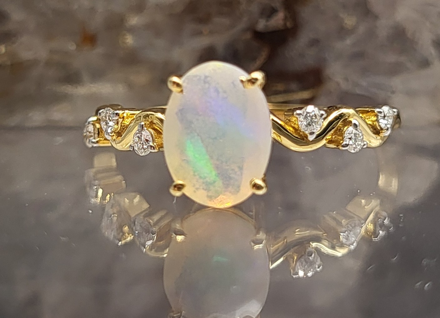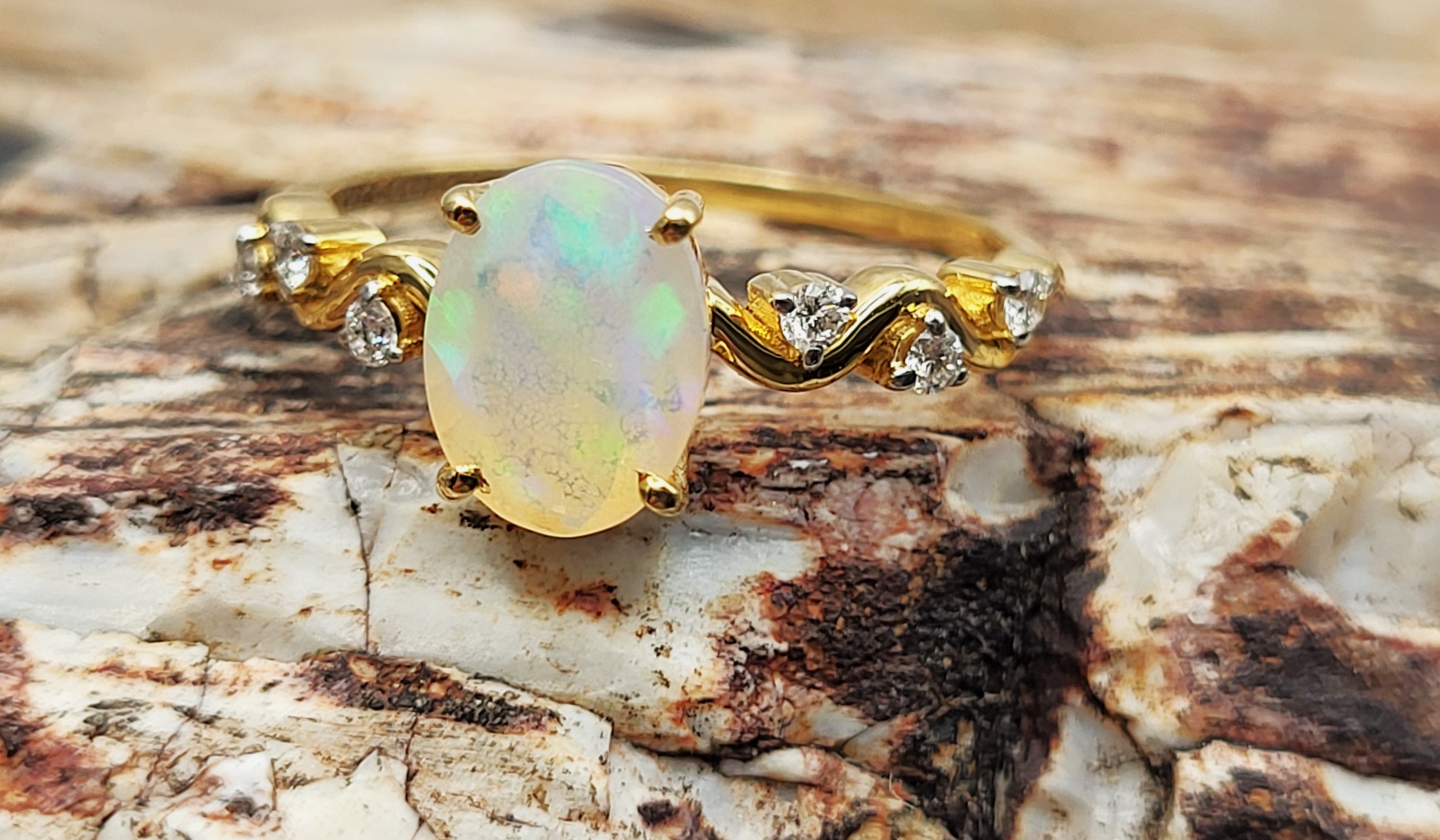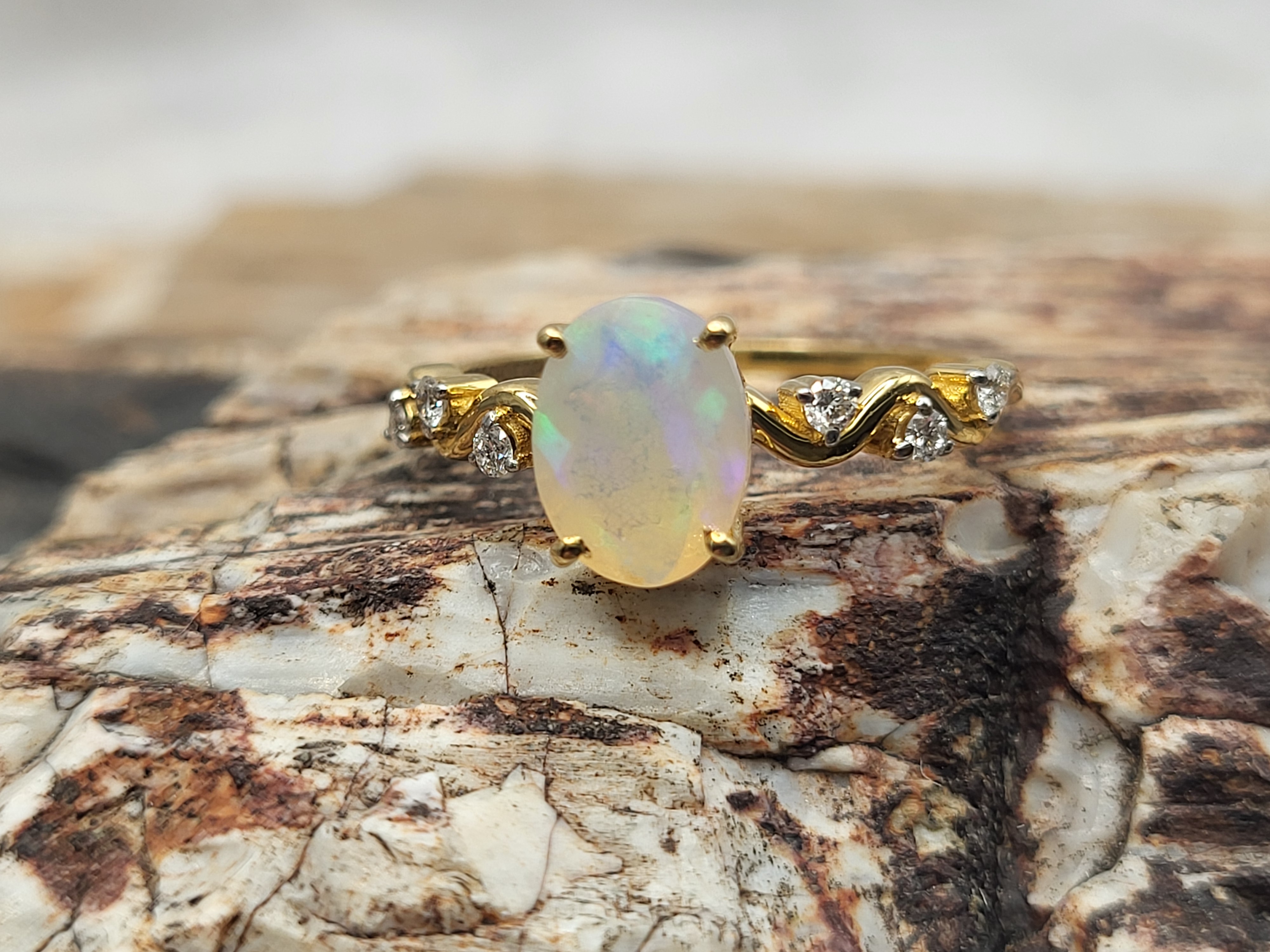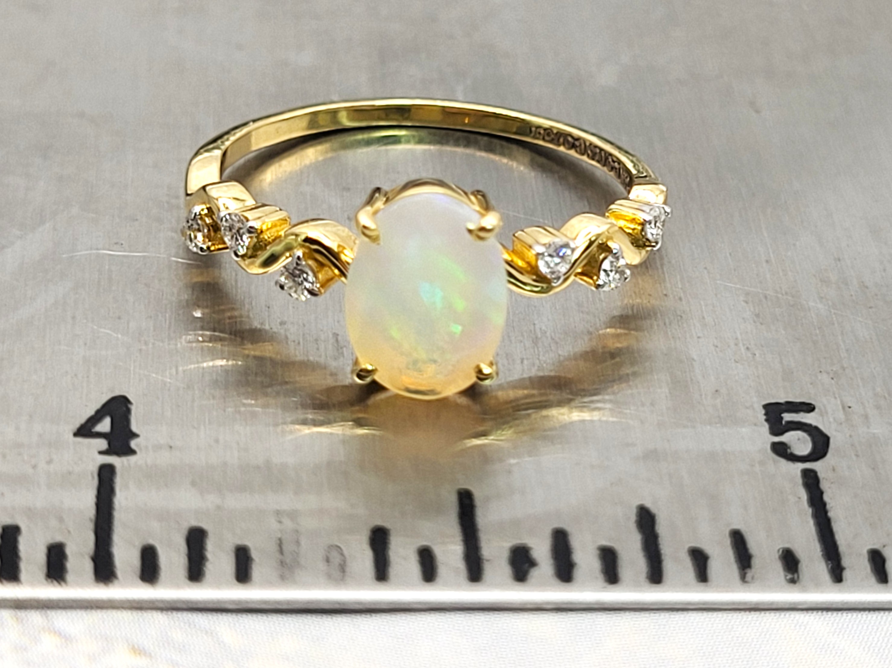 Petite in size, strong in structure, and elegant in design. This 14 karat yellow gold ring features a broad flash flanked with wavy diamond shoulders faceted opal .75ct .085 round, brillliant-cut G-H SI2 While daintier jewelry requires more caution, this beautifully-designed, contemporary ring was well-crafted with everyday wear durabliity in mind. 1.66g AdminCode: NAV
