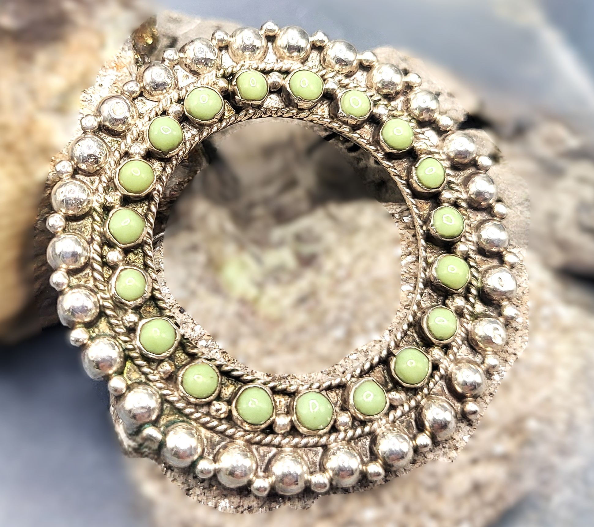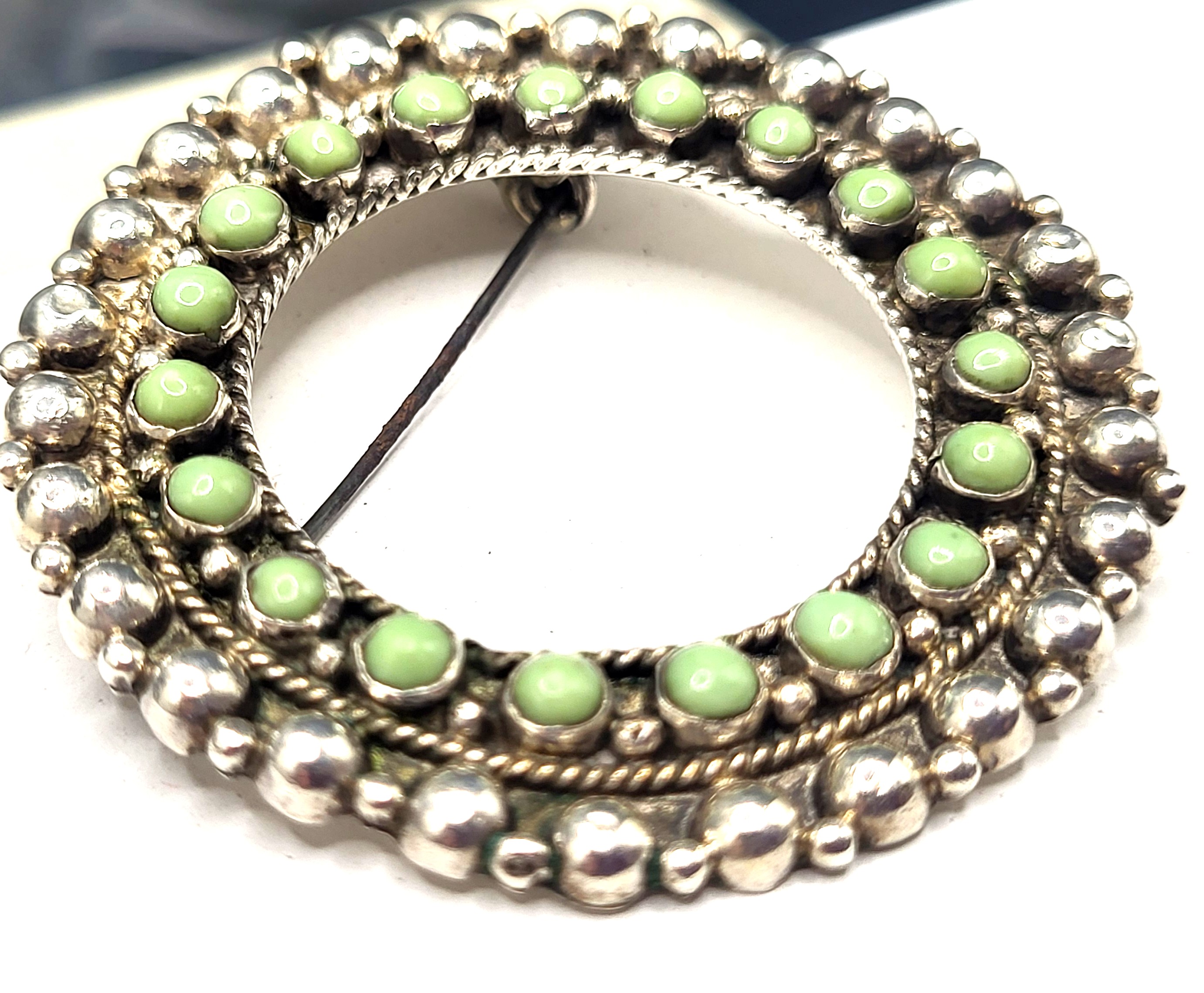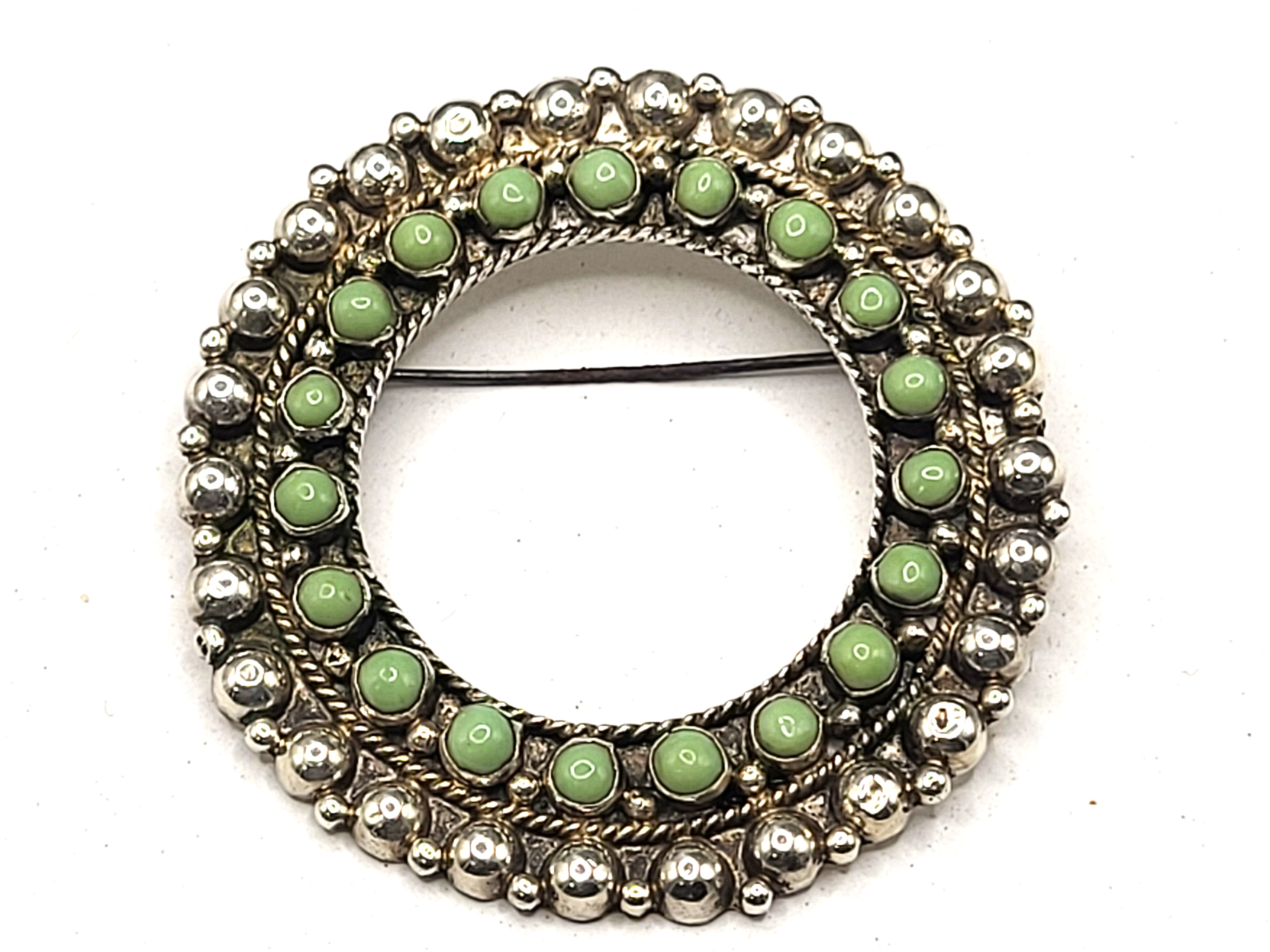 Hand-wrought in Mexico, this vintage sterling silver brooch features 19 round, polished green turquoise cabochons in a wreath-like circle. Circa 1950’s. The closure is a hinged pin on a locking "C" clasp, which is typical of jewelry from this era. The back is stamped Sterling MEXICO. Belonged to the grandmother of the lady whose estate this was. Believed to be Damele Turquoise, but could be Carico Lake.