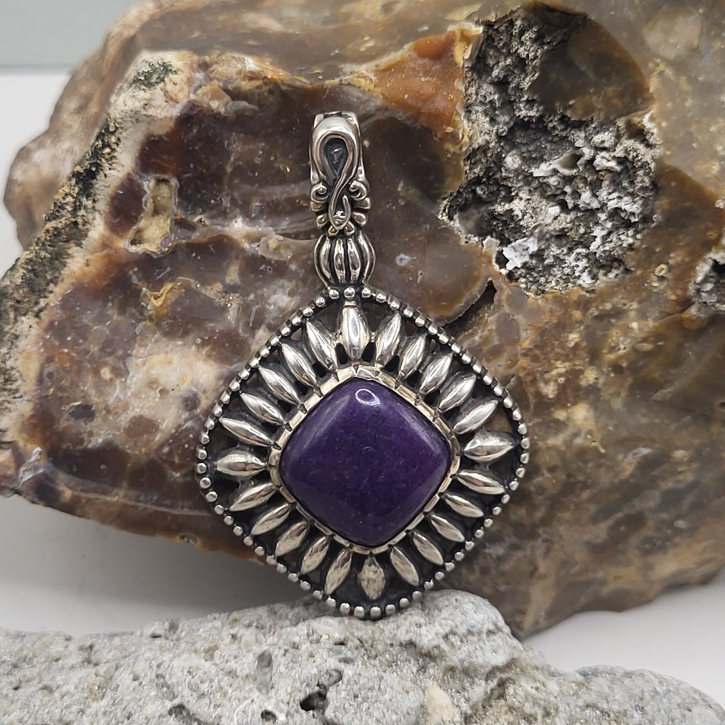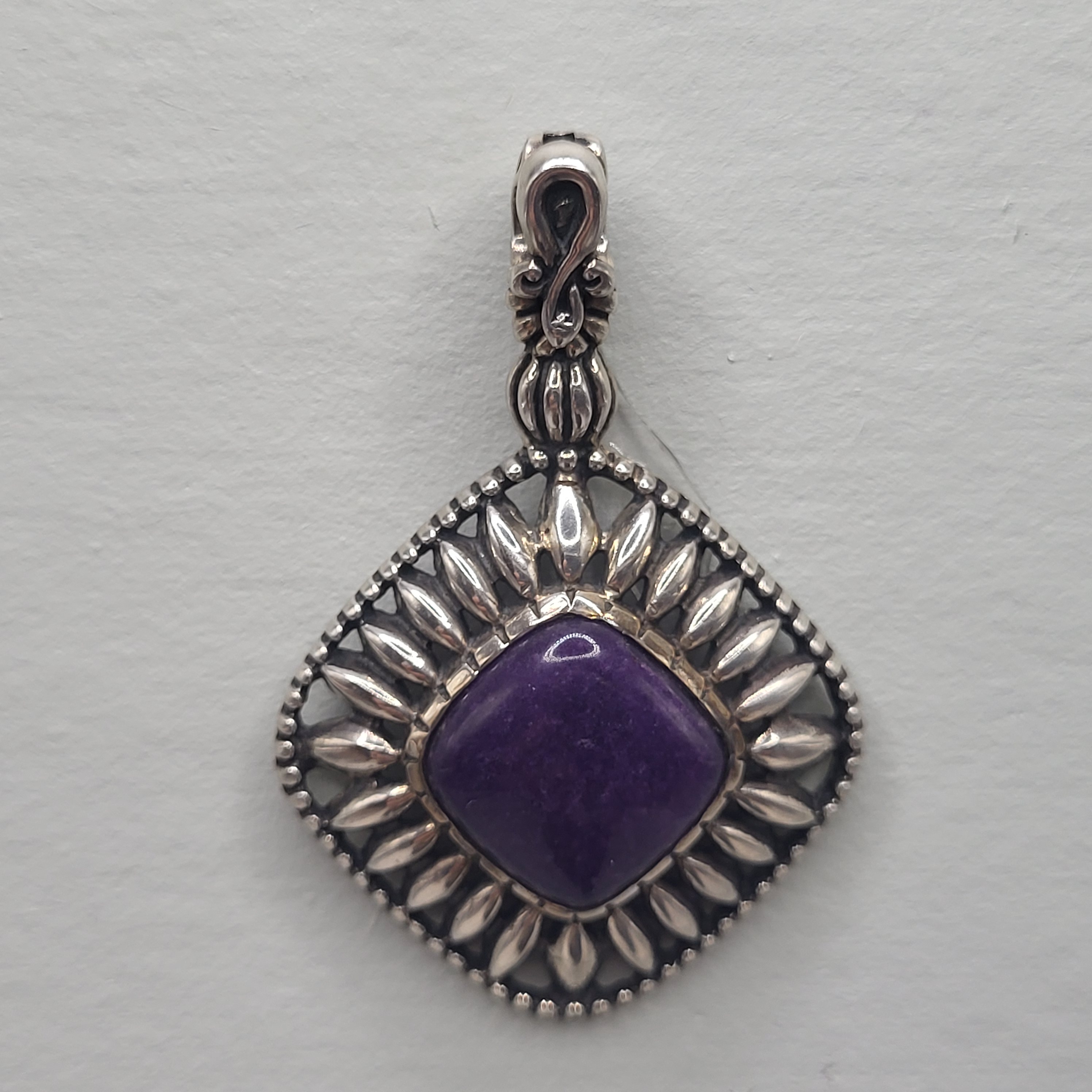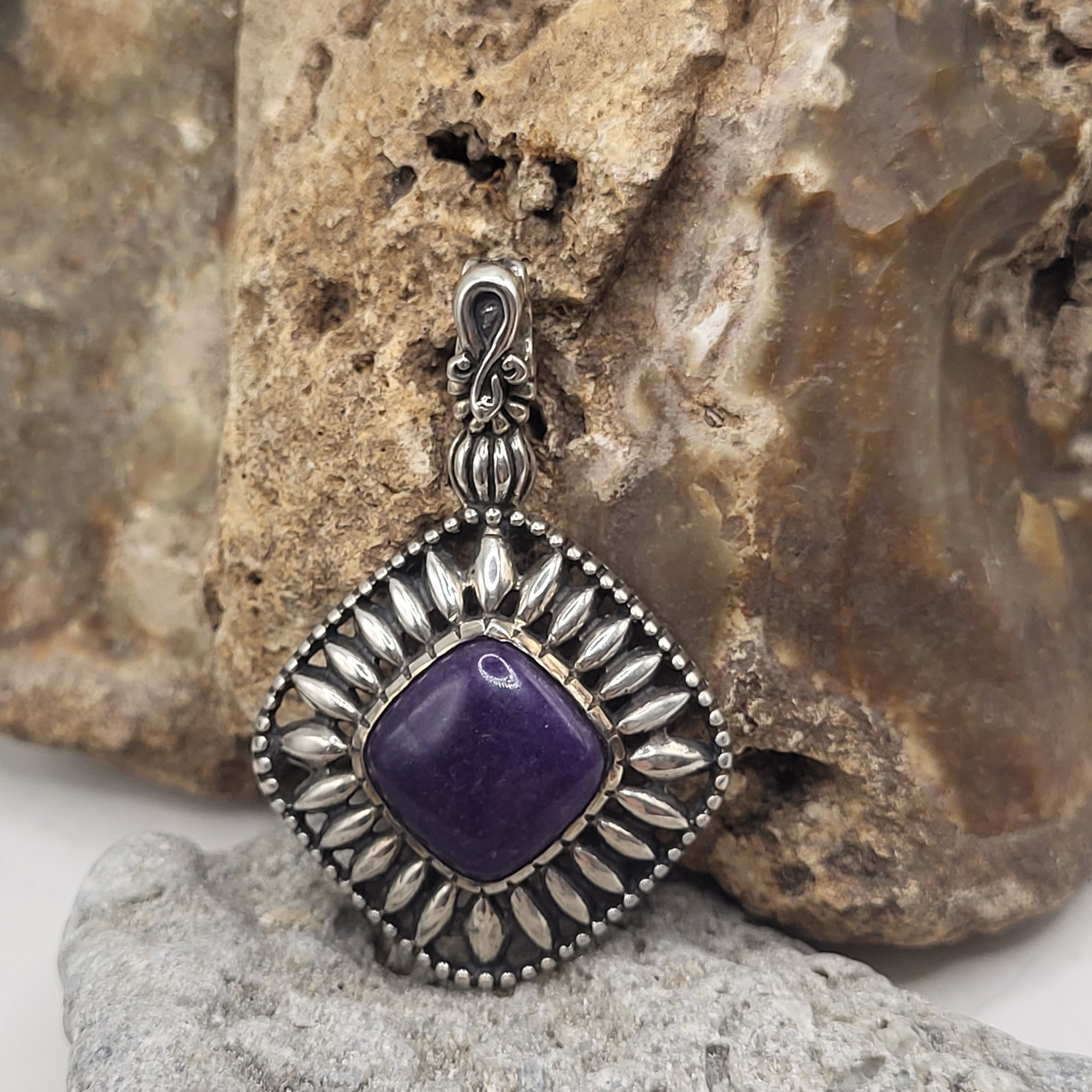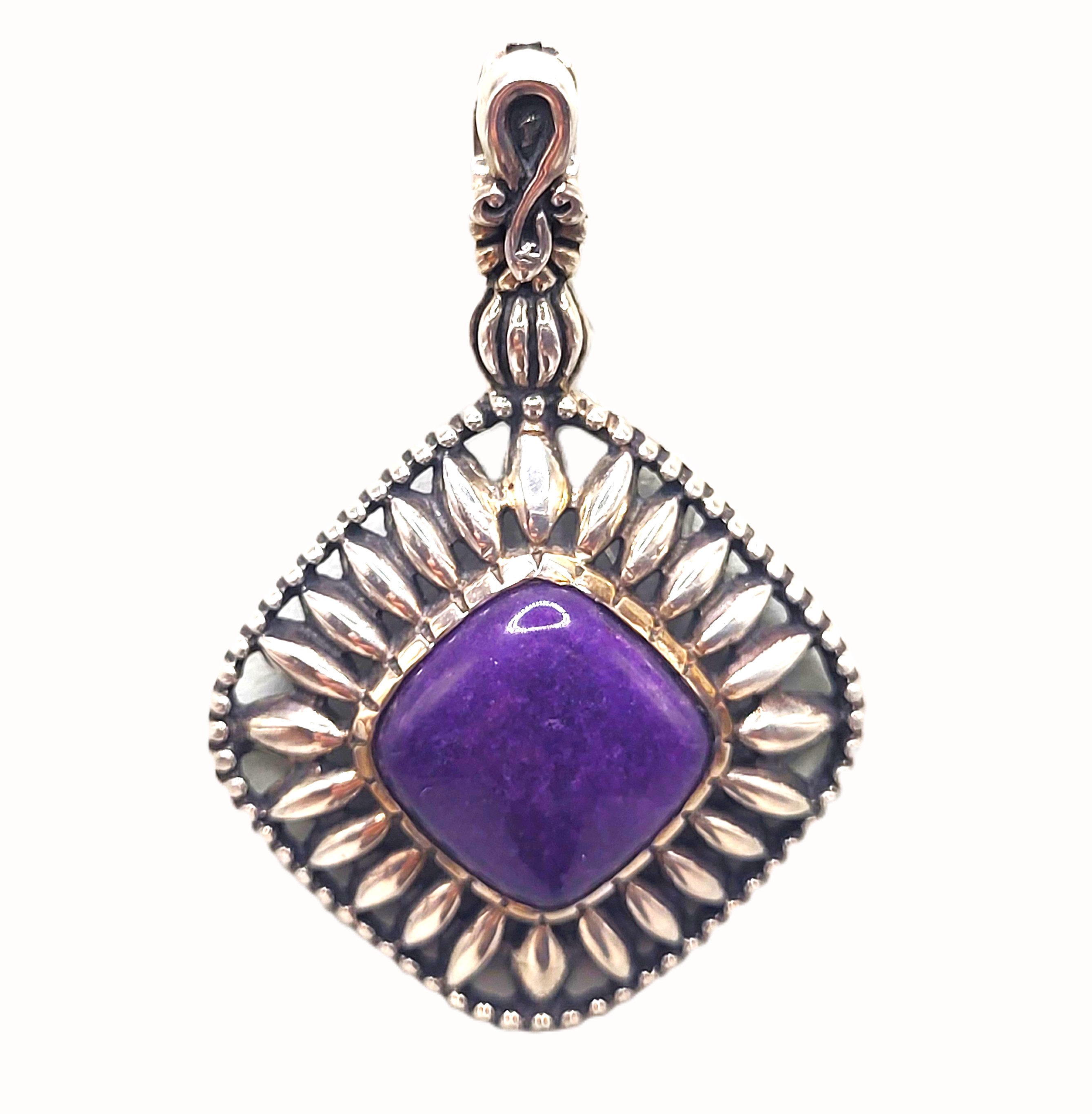 The square frame features a radiant floral motif with petal-like silver accents and beaded edges, while the bail is adorned with elegant scrollwork—signature touches of Carolyn Pollock’s Relios design.