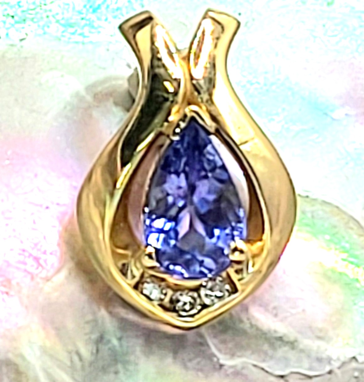 This is a 14 karat yellow gold pendant that features a 1.12 carat pear-cut, prong-set, rich bluish purple, genuine tanzanite. Channel-set at the bottom of the curvy yellow gold frame are .05 carats of round, brilliant-cut, H, SI2 clarity accent diamonds. The pendant is approximately 5/8" diameter and has a built-in bail that can accommodate an approximate 3.75mm wide chain. Admin: G11241/15grt