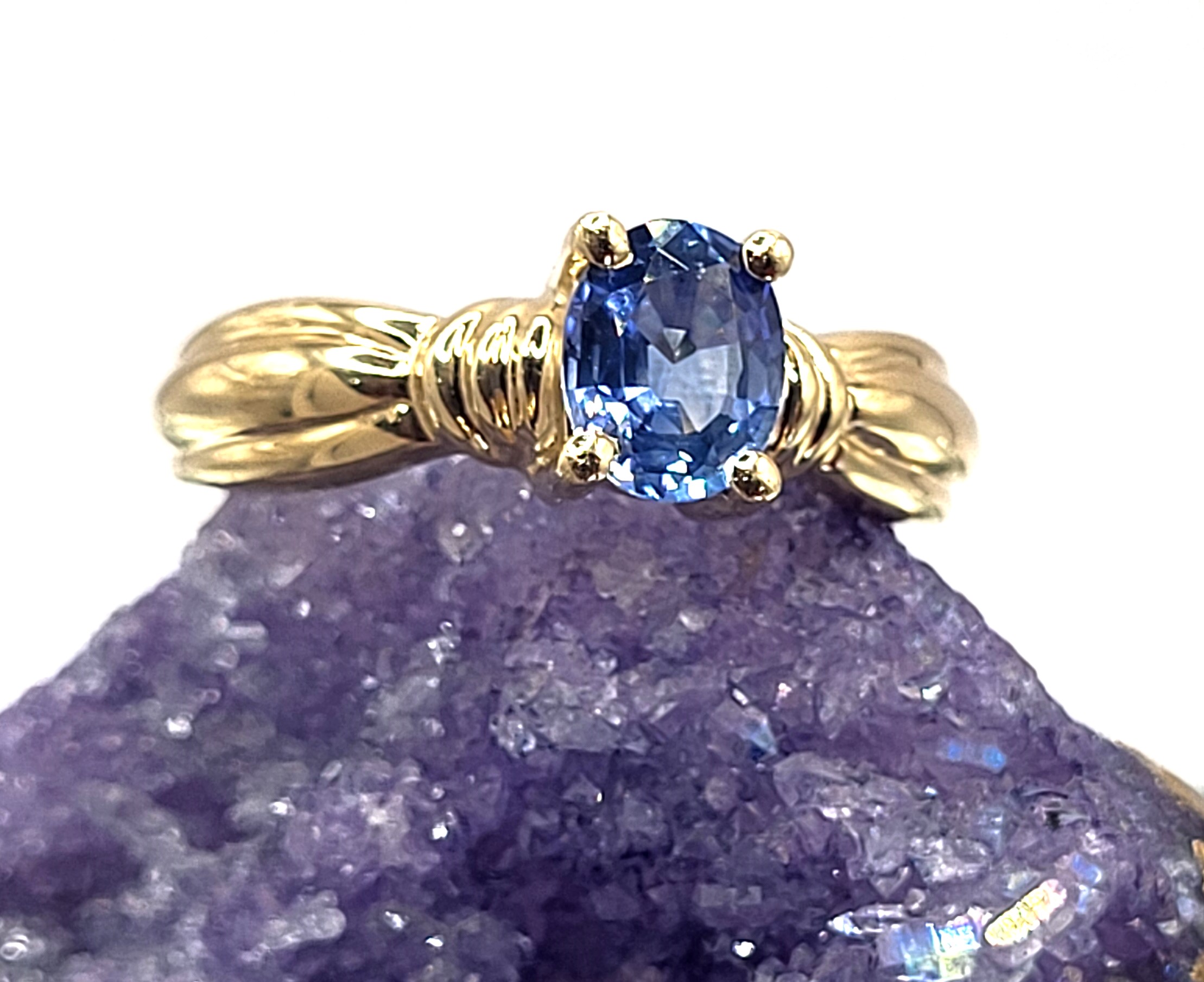This 14 karat yellow gold ring features an approximate .59 carat oval-cut, eye-clean, light blue sapphire that is prong-set above ribbed, pinched shoulders that widen, then taper to an approximate 2mm shank. The ring bears the CID hallmark of Clyde Duneier Inc., who has been an "internationally recognized leader in the jewelry industry since 1910*. This ring is US size 8. See below for sizing options and other important information. Admin:33109/21bal *ClydeDunier Website