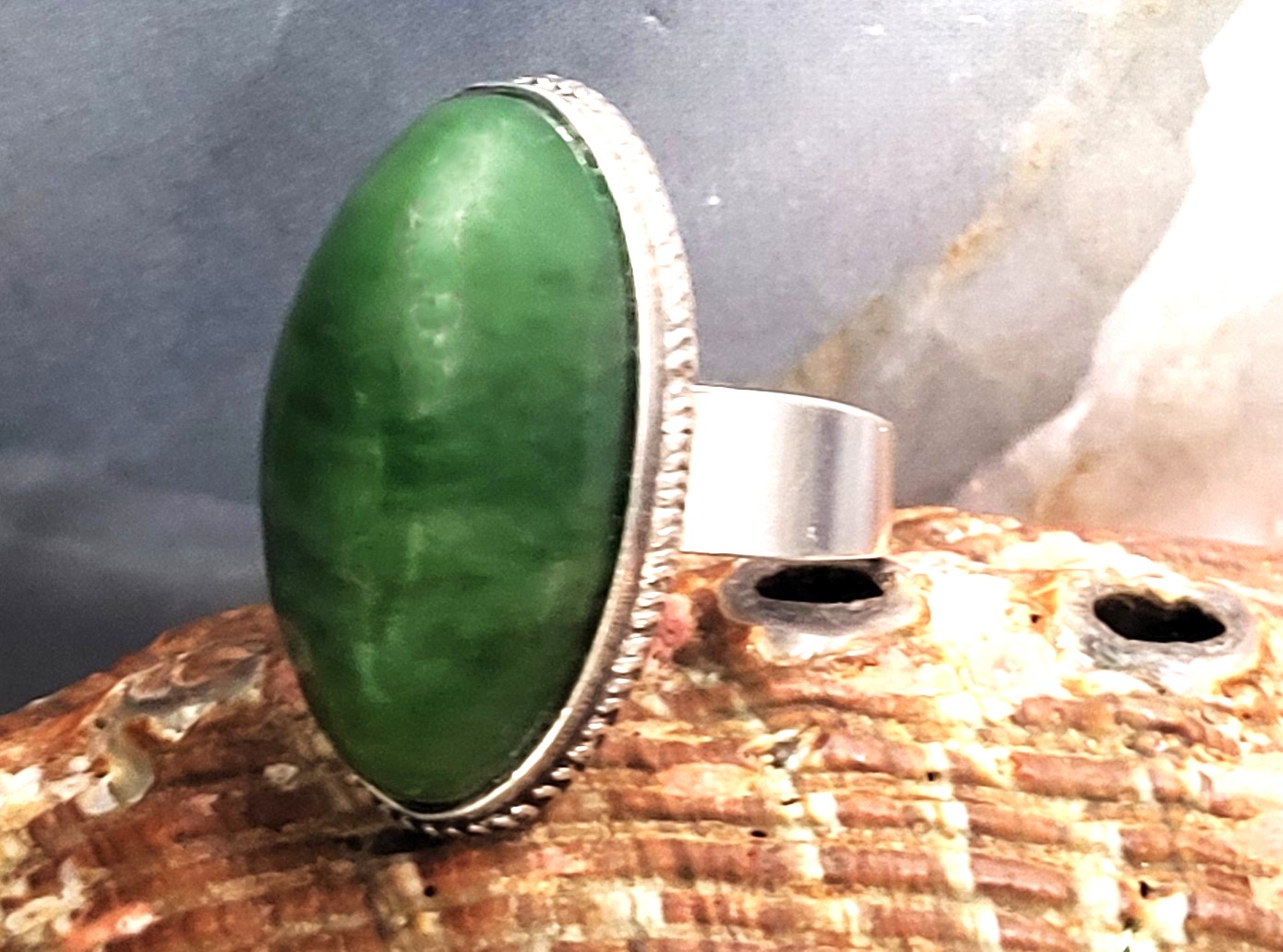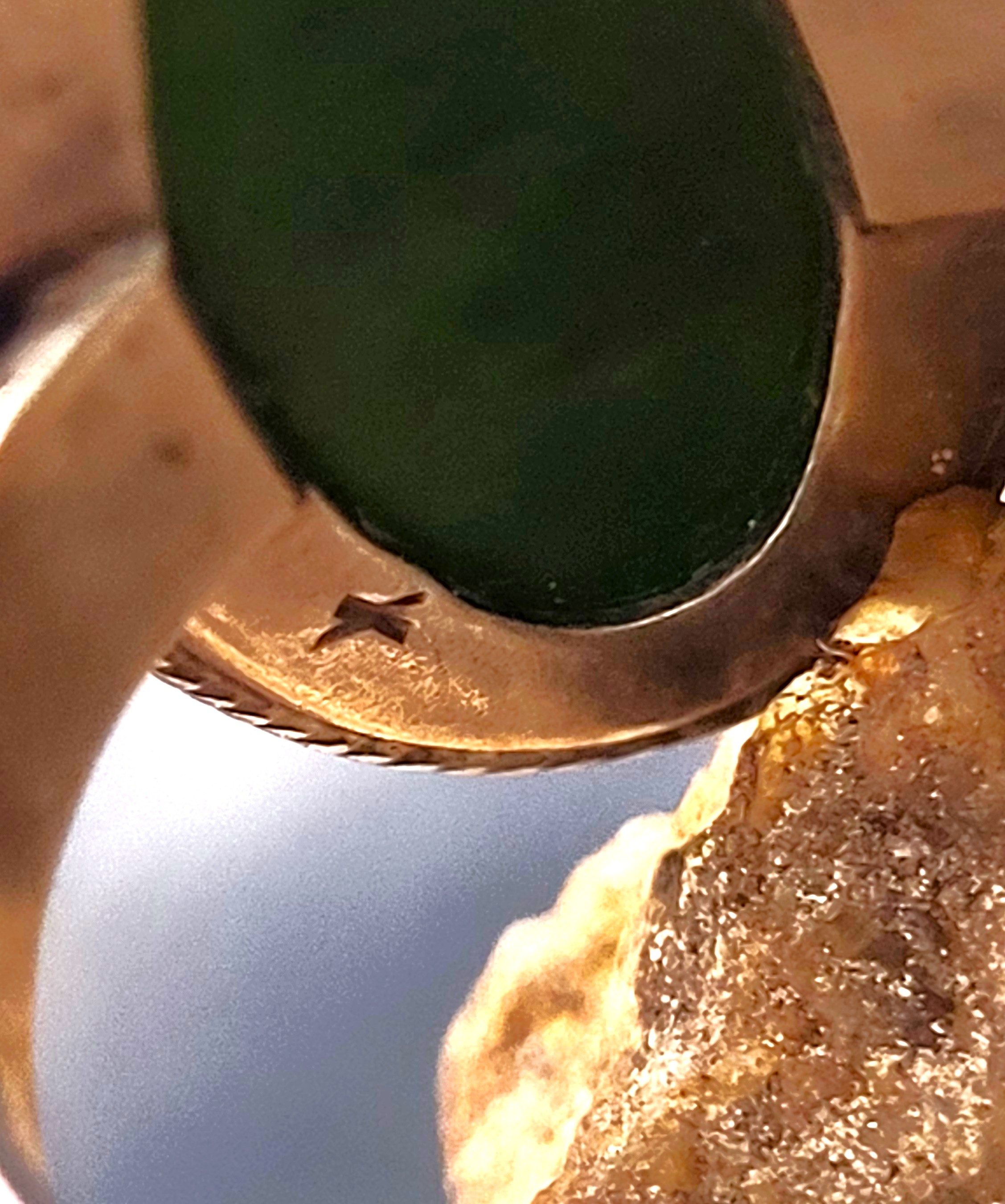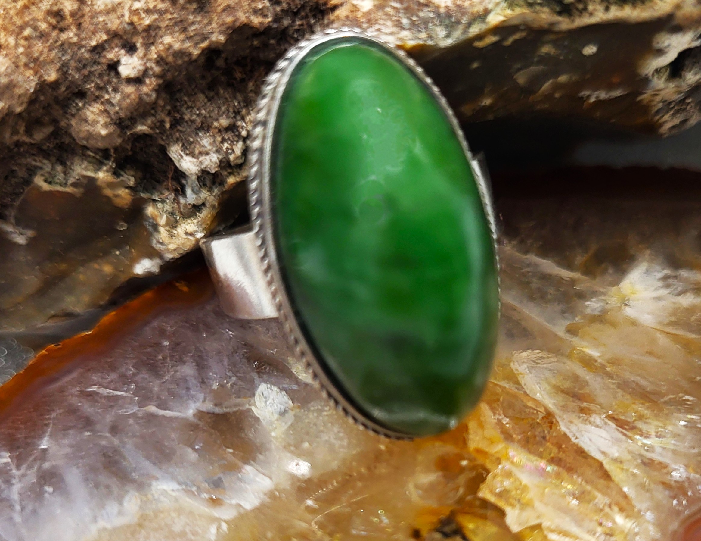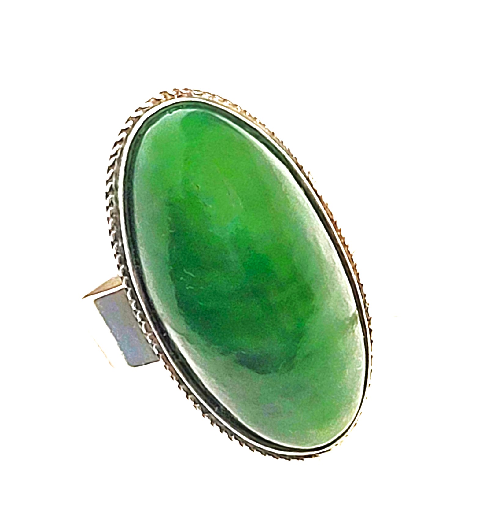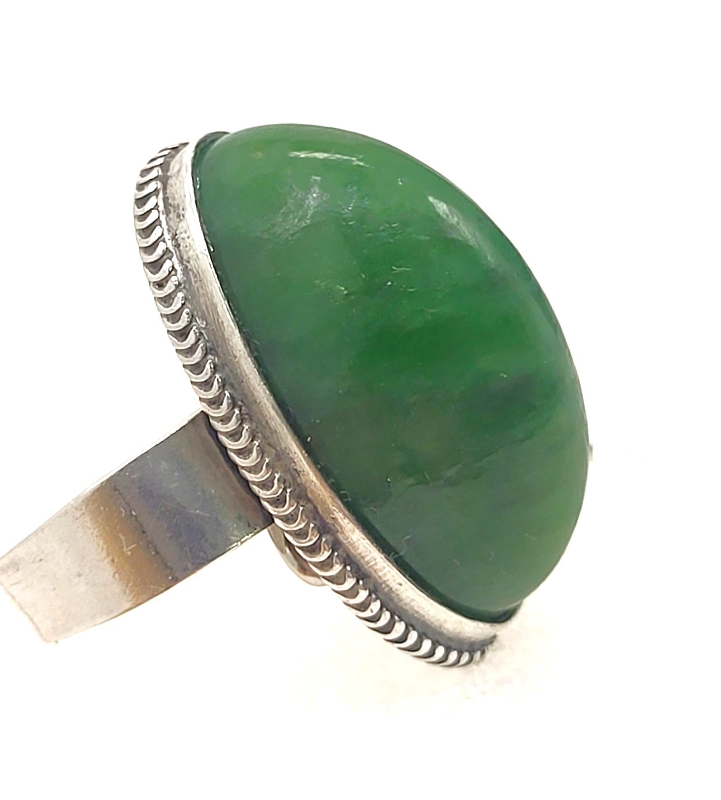 This ring is fashioned from .875 silver, the purity used by many the former Soviet Union, and other East European nations. The seating and bezel may have been made especially for this unusually shaped gemstone that tests as Nephrite on the Presidium II Gem Tester. The nephrite is approximately 1" long, 3/8" wide and 3/8" tall. The bezel is formed around the base of the gemstone and recently had a cleaning and maintenence by a professional jeweler. The base of the bezel is decorated with a braided border. The shank is a simple sterling silver band that tapers from 5.5mm to 3 3/4mm. This ring is US size 8.5. Read sizing options and other important information below.