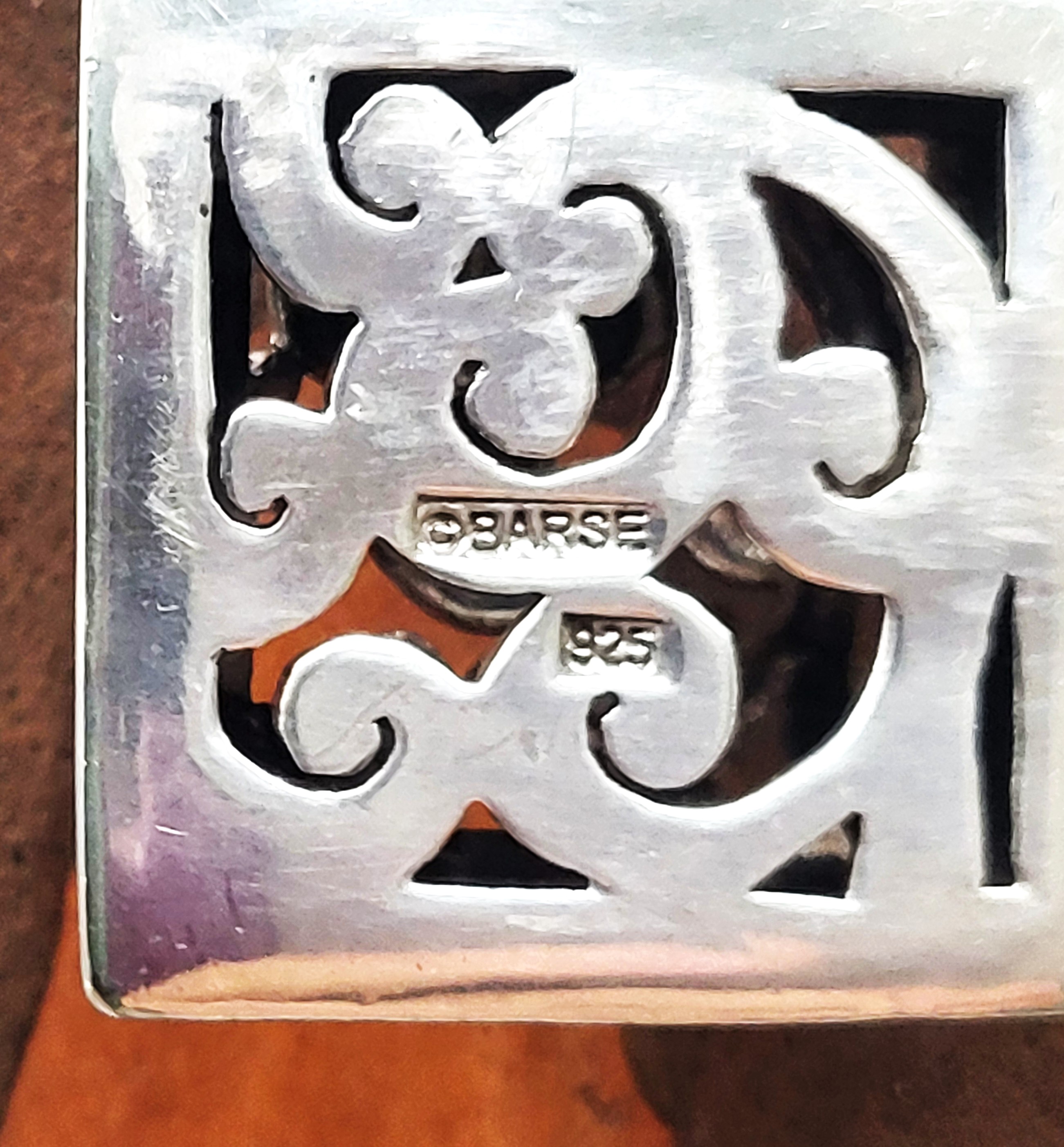 A bold designer piece by Melanie Barse Gobril of Texas, USA, crafted in die-struck sterling silver (.925). This reticulated square pendant measures 1" x 1" and weighs an impressive 20.62 grams, offering both substance and style. The hinged bail allows the pendant to rock gently back and forth, accommodating chains up to 5.5 mm wide for versatile wear. With its textured artistry and distinctive hallmark, this Barse creation embodies modern craftsmanship and collectible appeal. See sizing details and other information below. AdminCode: 19310/