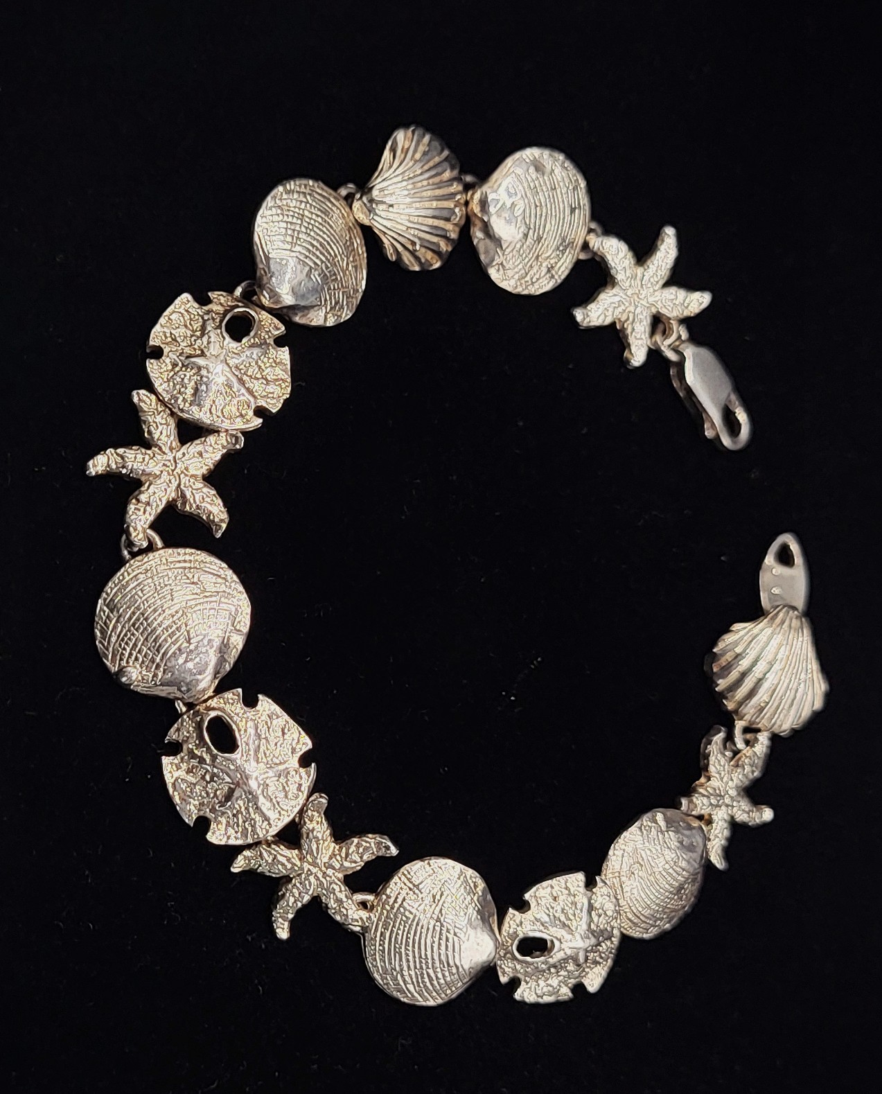 This is a sterling silver bracelet with a nautical motif. Each link of the bracelet represents a cockle shell, sand dollar, starfish, or scallop shell continuously for 7.5", ending with a lobster clasp. The bracelet is approximately 5/8" long. Admin: 33121/1bg