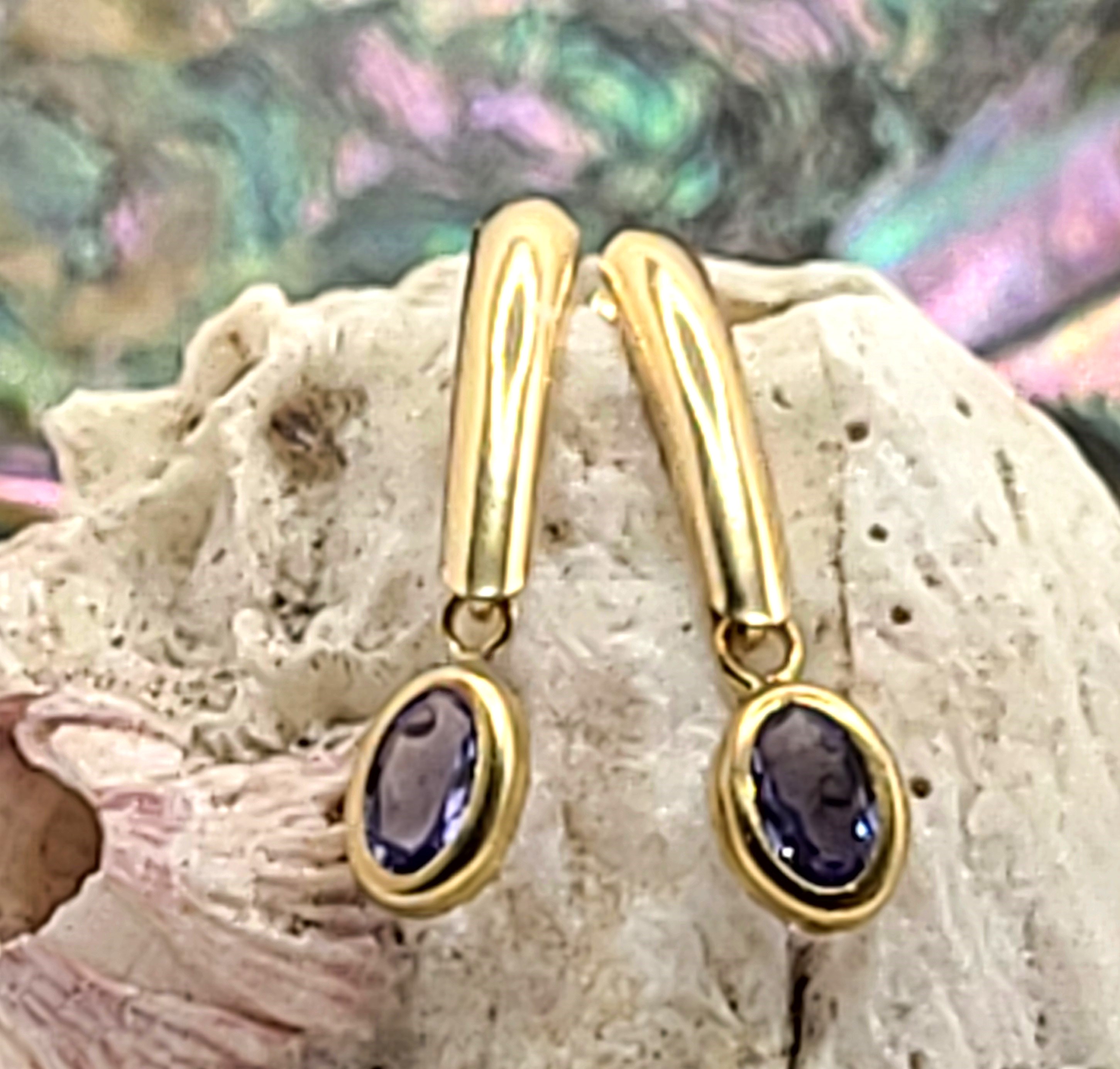 This is a pair of 14 karat yellow gold earrings that feature .90 carats total weight of oval-cut, bezel-set, genuine tanzanite and hang approximately 3/4". The earrings attach to the earlobe with posts and friction backs.  Admin: G11241/32blt