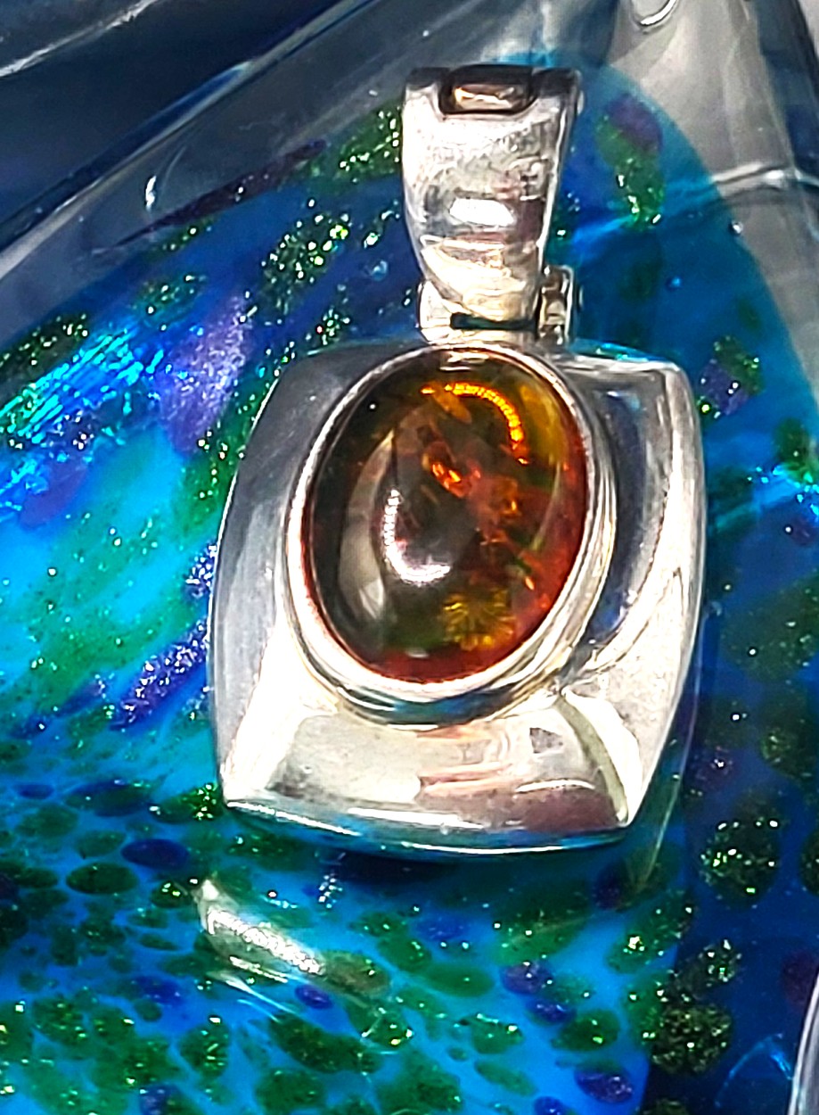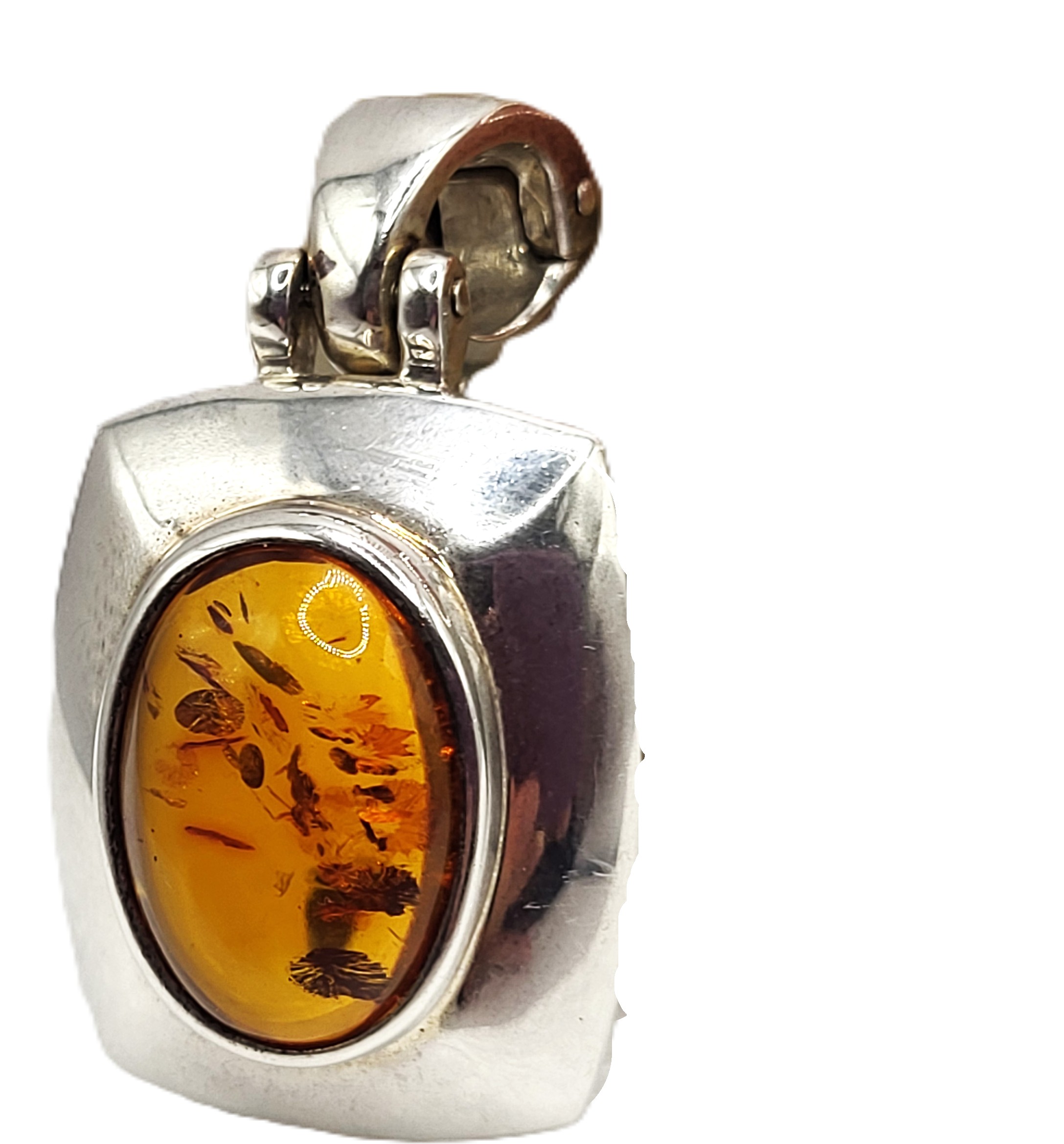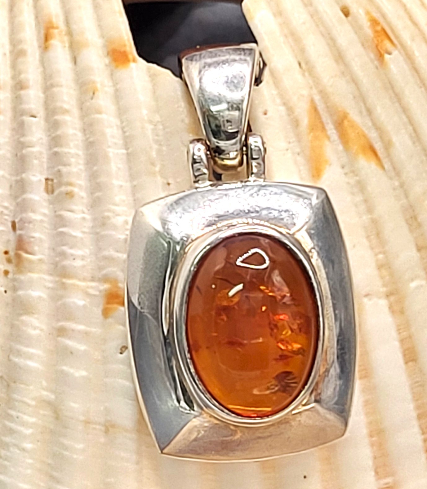 This sterling silver pendant features an approximate 18mm x 12mm, oval, cabochon, polished, bezel-set Amber with a wide, cushion-shaped, polished, sterling silver frame. The hinged bail can accommodate an approximate 6.5mm thick chain, and it opens to accommodate a pearl or bead strand style necklace. The pendant measures approximately 1.25" long x 1" wide. *Authenticity tests on the amber are listed below. Admin: K26237/hh