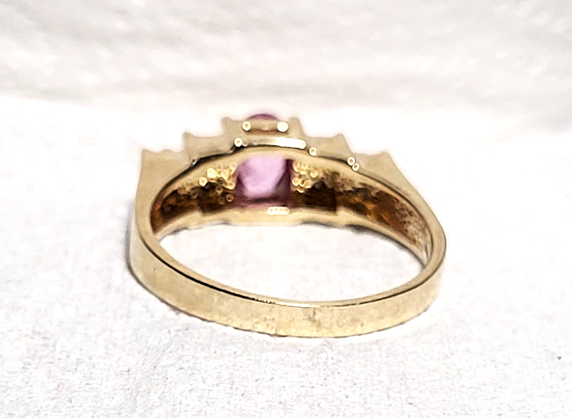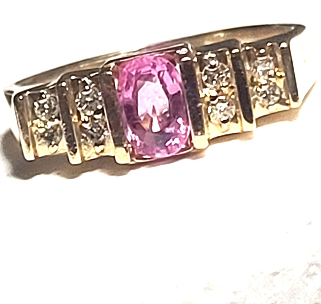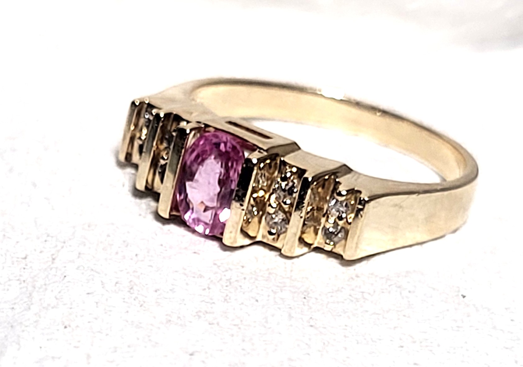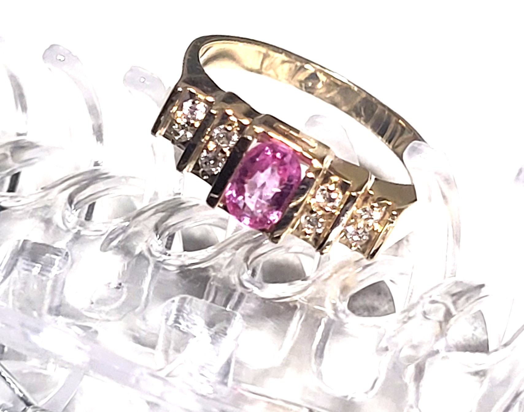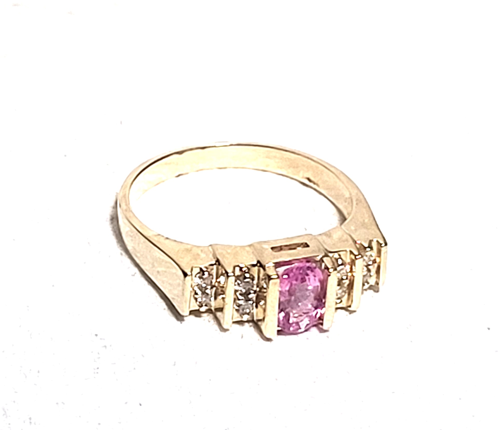 This is a 14 karat yellow gold ring that offers a tension-mounted .60 carat oval-cut, genuine pink sapphire and .16 carats of round, brilliant-cut, H-I color, SI2-I1 clarity, tension-mounted diamonds on the stepped shoulders. ThAdmin: G11241/8itt