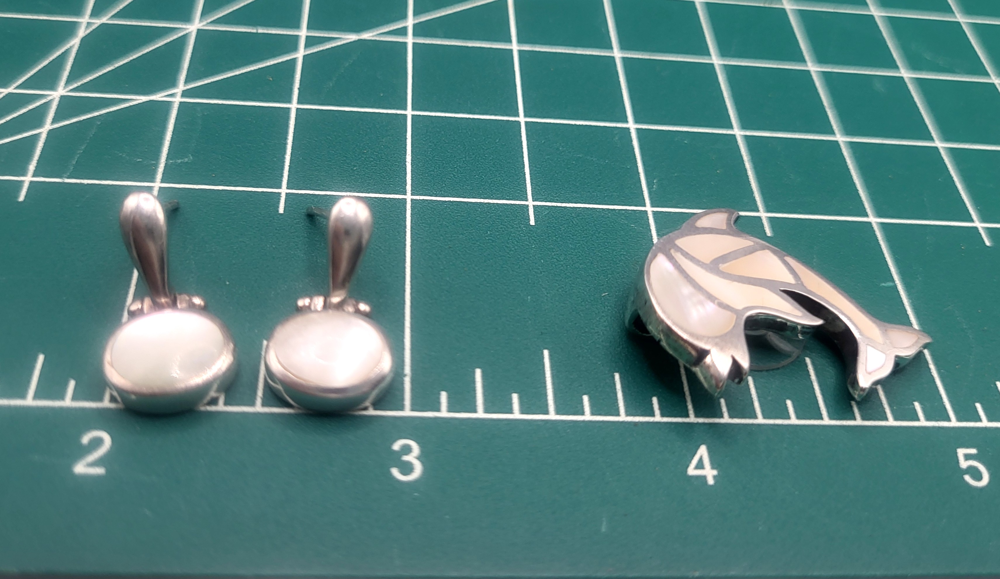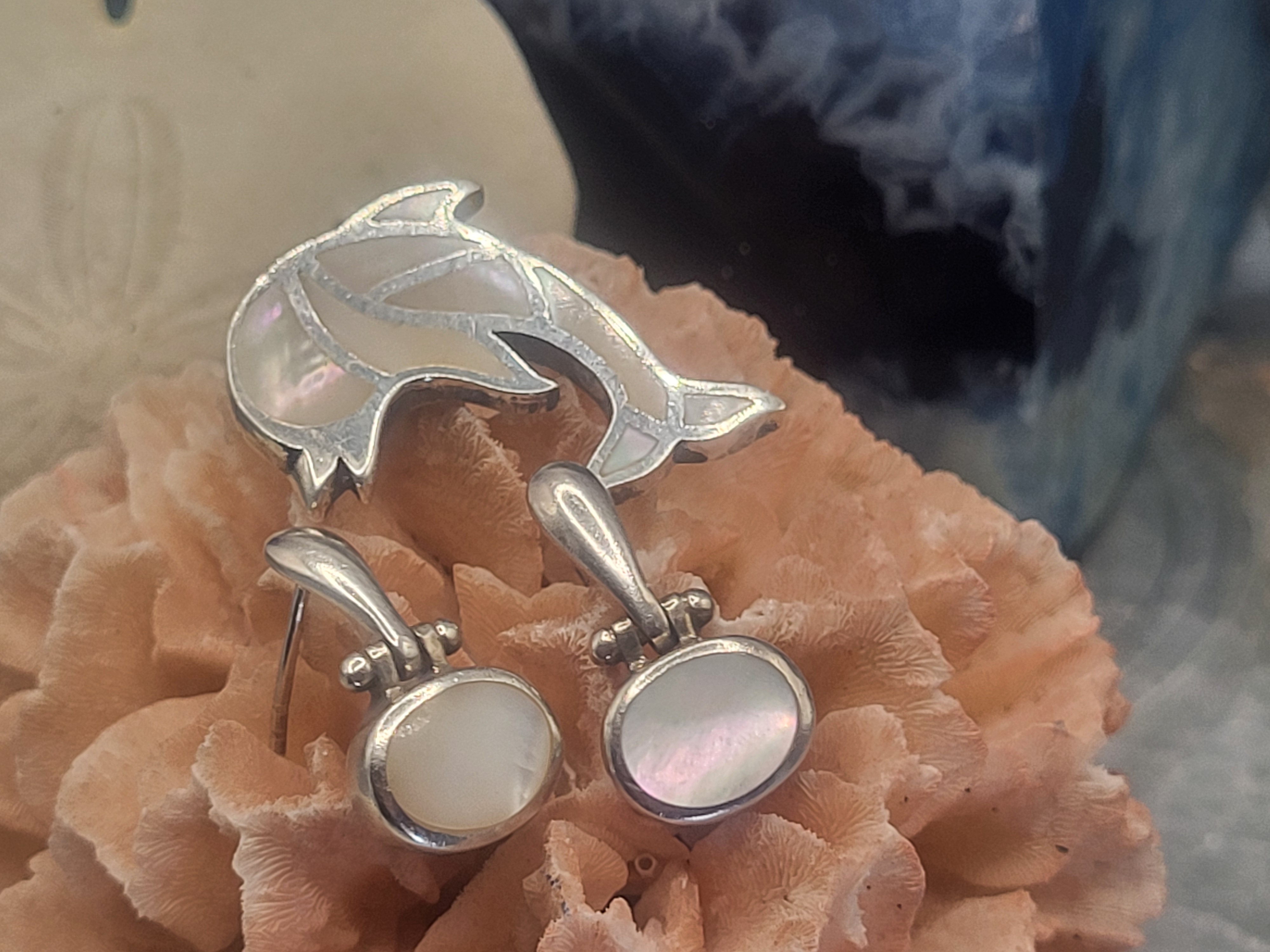 The sterling silver and mother of pearl make the dolphin pendant and mother of pearl is also set into the dangling, hinged earrings that are added a bonus. The dolphin is approximately 1" diameter and the earrings hang approximately 1" and are hinged, in the same manner as doorknockers. The earrings attach to the earlobes with posts and silicone backs.