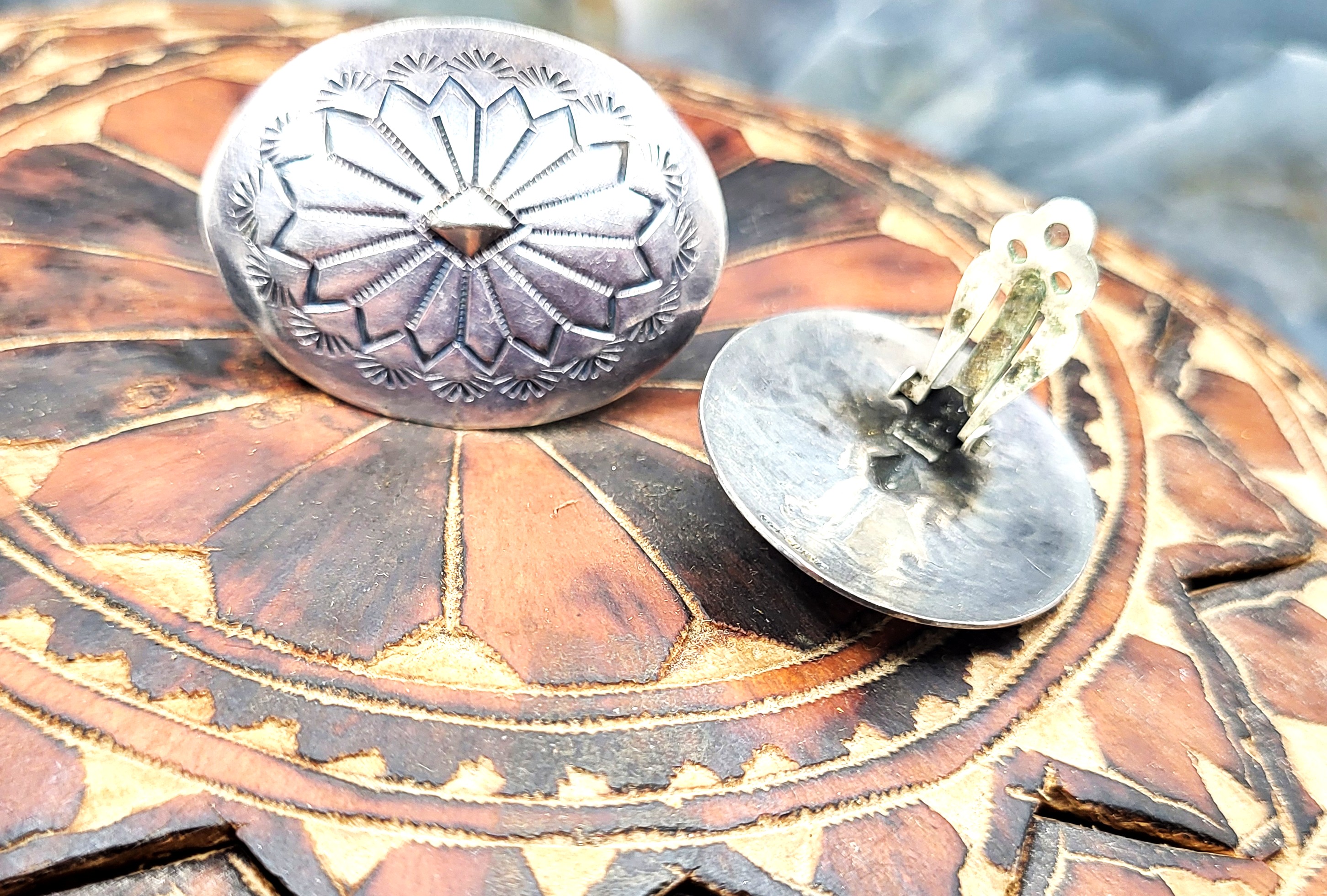 These sterling silver earirngs are die-struck "links" resembling those of the iconic Western wear "concho or concha" belts. The central diamond shape with radiating pointed feathers and a rising sun on the end of each is a known Navajo design. Although there is no hallmark on these earrings, they resemble the work and designs of the late Ernest Bilagody, a Navajo native American. The earrings measure 1.75" x1.25" and have clip-on backs and are believed to be circa 1985ish. Admin: 33120/715.