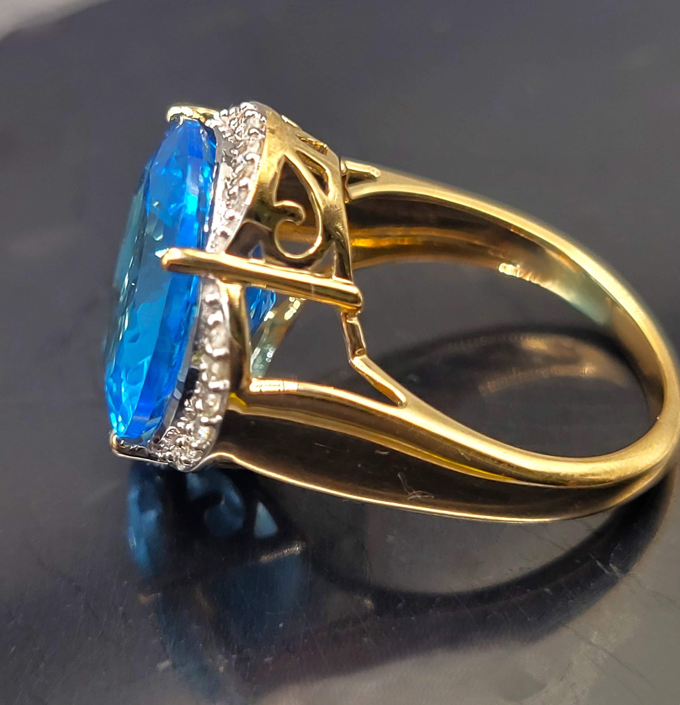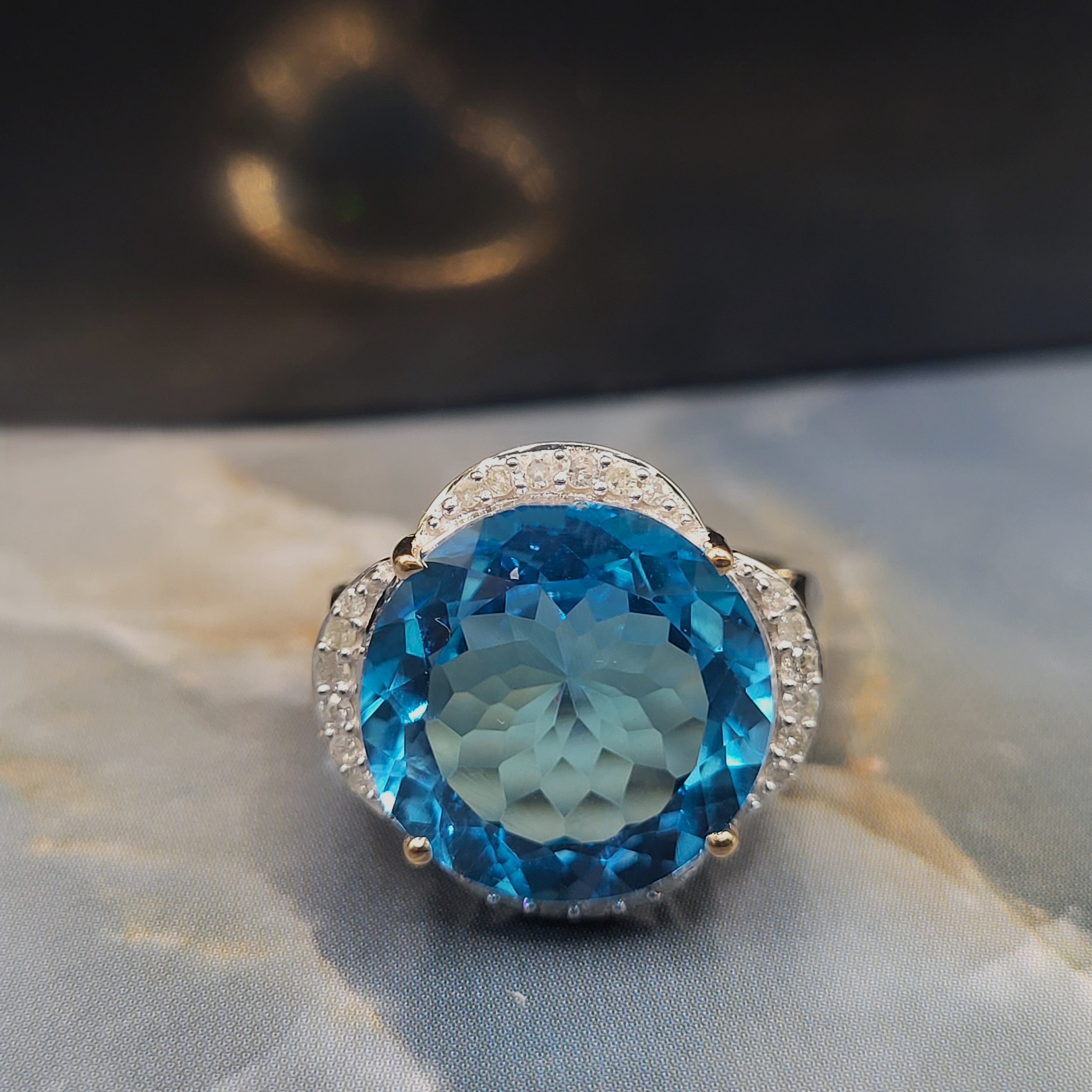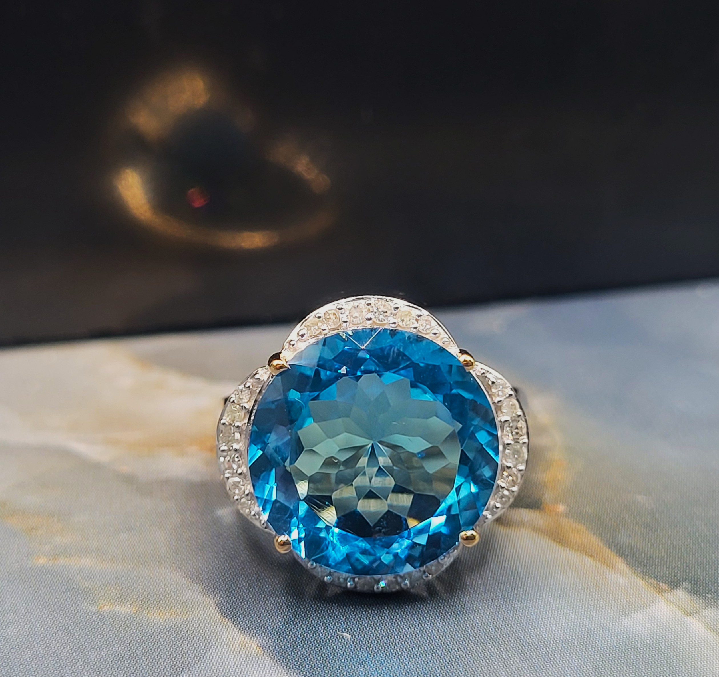 The color of Swiss Blue Topaz is said to be the ideal mixture of soft and dramatic (rosiecjewelry website). This 14 karat yellow gold ring leans more to the dramatic with the 12.50 carat round, faceted Swiss Blue Topaz that is prong-set amongst .19 carats total weight in the petal-like, floating halos around the center. Admin: Q5743/22-gnp