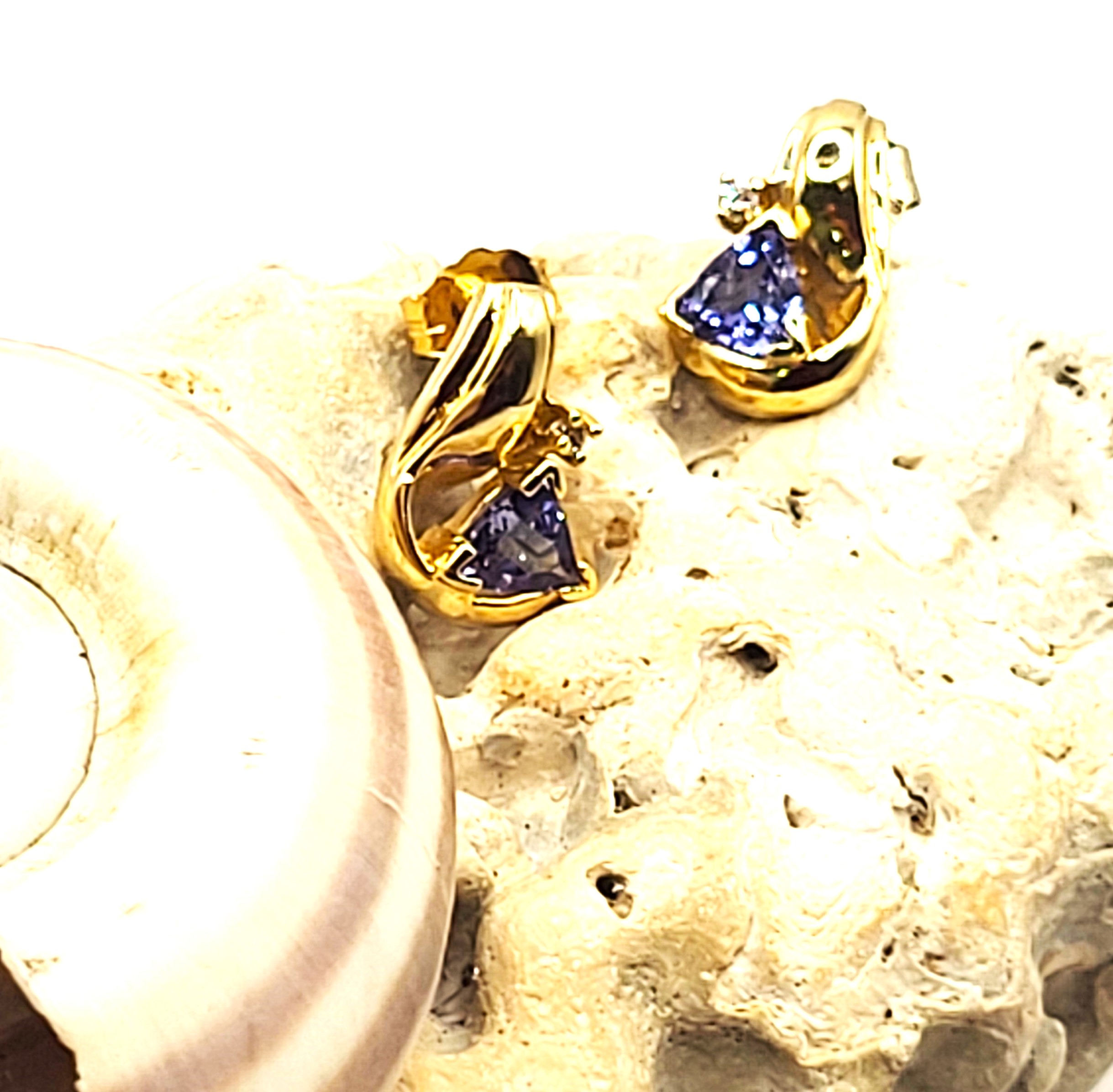 This pair of 14 karat yellow gold earrings features .60 carats total weight of trilliant-cut, light purple, genuine tanzanites and .03 carats total weight of round brilliant-cut G-H color, SI2-I1 clarity accent diamonds. These earrings are approximately 3.8" long and 5/16" wide and really quite strong (not hollow). They attach to the earlobe with posts and friction backs.2.45 grams Admin: G11241/35llh