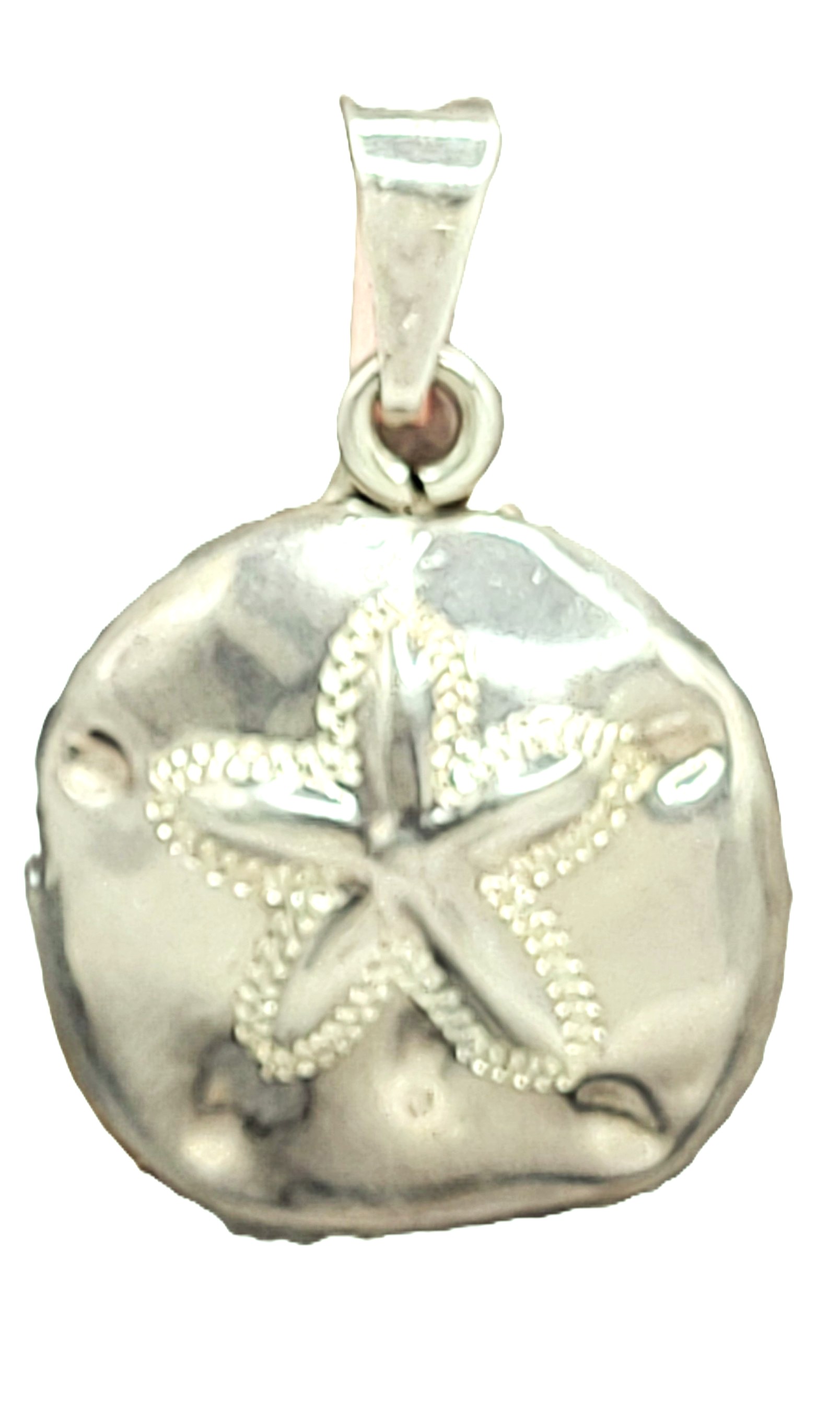 This is a vintage Taxco (TN-49) sterling silver (.925) semi-hollow pendant, circa early 1980’s. The pendant is approximately 1.25" in diameter, excluding the bail. The die-struck sand dollar design is prominently displayed on the semi-dome of sterling silver with a hand-applied ‘bric-a-brac’ border. Paying attention to the details, the artisan placed "dimples" in the appropriate places to represent the five lunules found on the Five Slotted Sand Dollar. The pendant has a smooth backplate that is so well joined with the front, it is difficult to see that it is 2 pieces of sterling silver. The pendant has a large bail that can accommodate an approximate 5.5mm wide chain. The hallmark for this pendant is located inside the bail. PLEASE NOTE: The sand dollar pendant is not perfectly round, but nor is it "banged up" and dented as it may appear in some photos. There are five dimples on the face of the pendant that were intentionally made by the craftsman. The reflective shine of the polished silver creates the illusion of "pings" and colors from items nearby when the photos were taken. 12.68 grams. ForOfficeUse: 33120/11bn